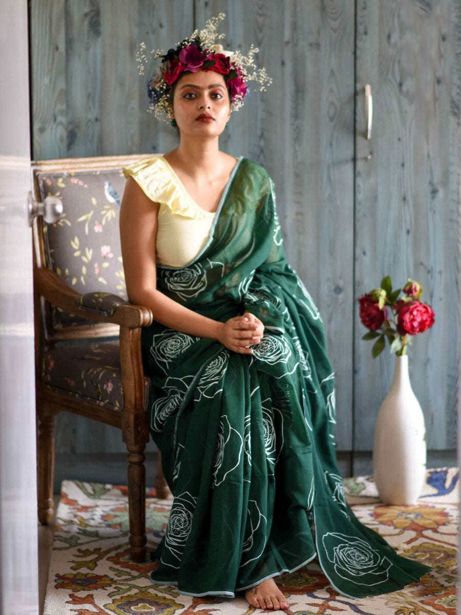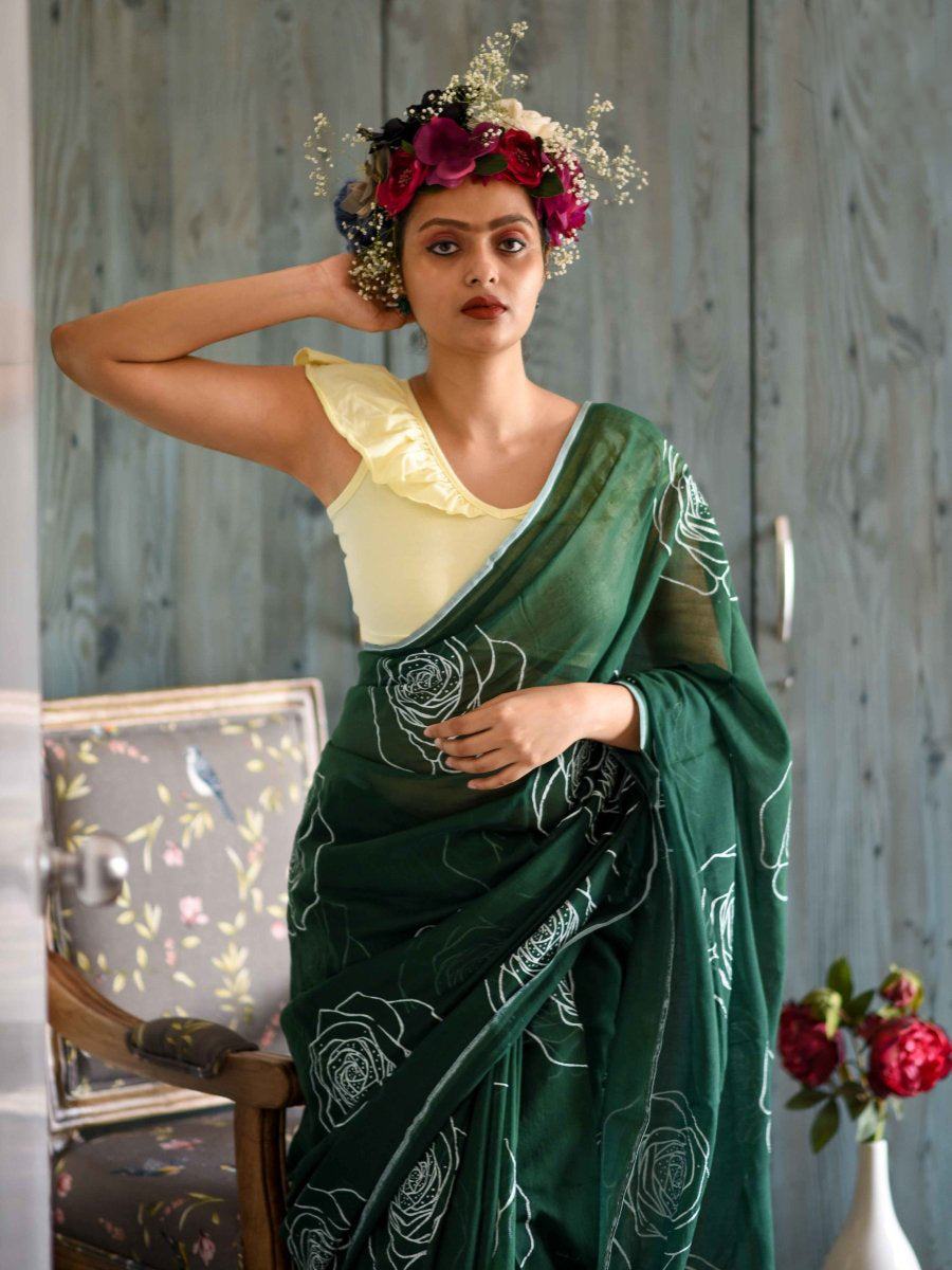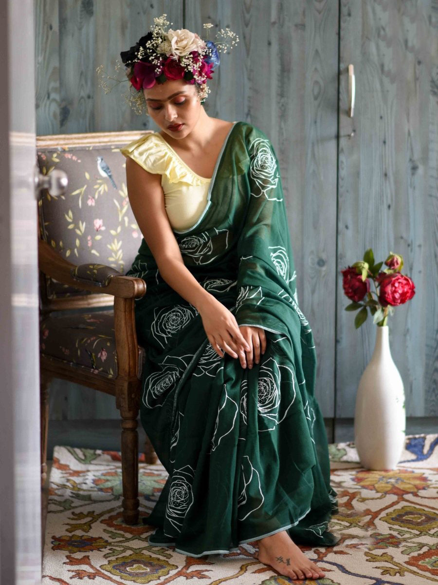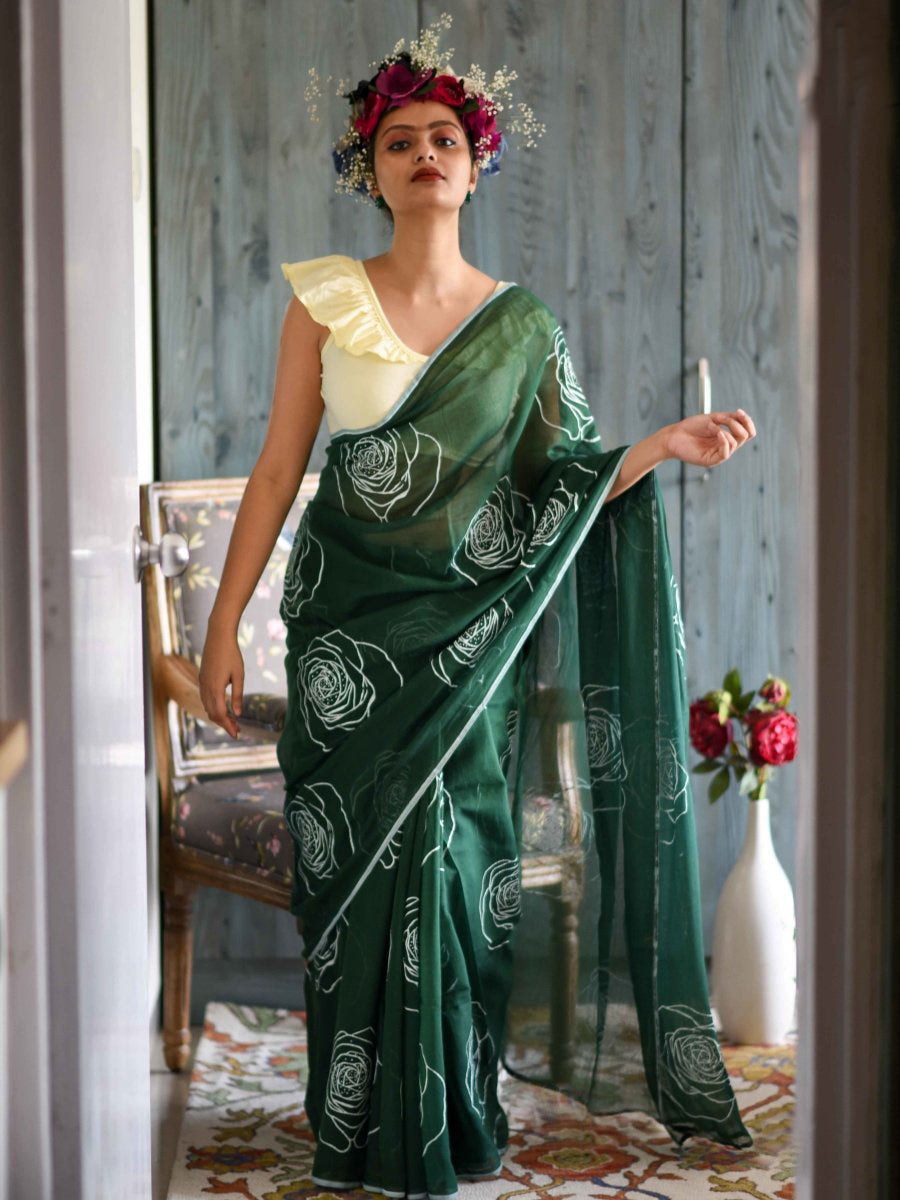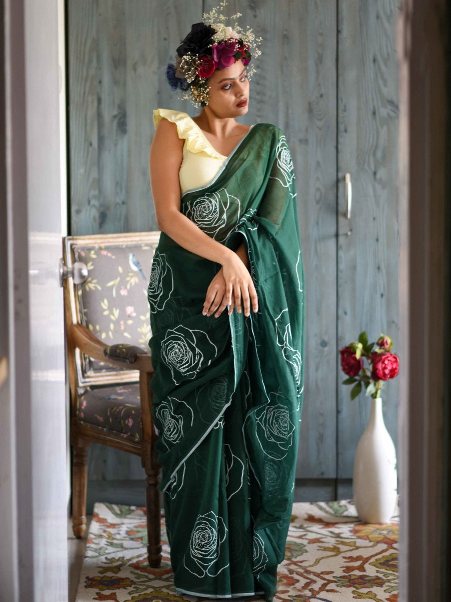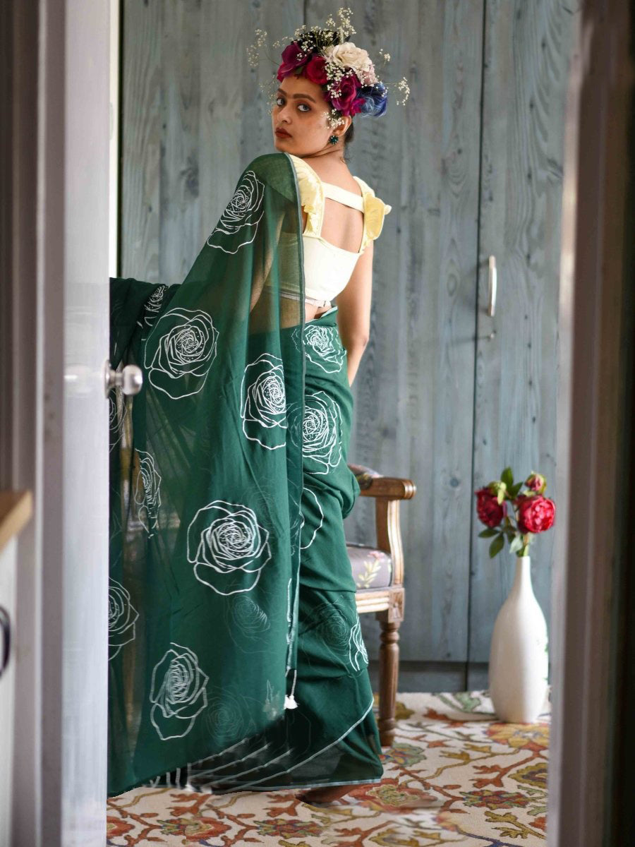 Alluring Green Color Pure Cotton Lilen With Digital Printed Designer Saree