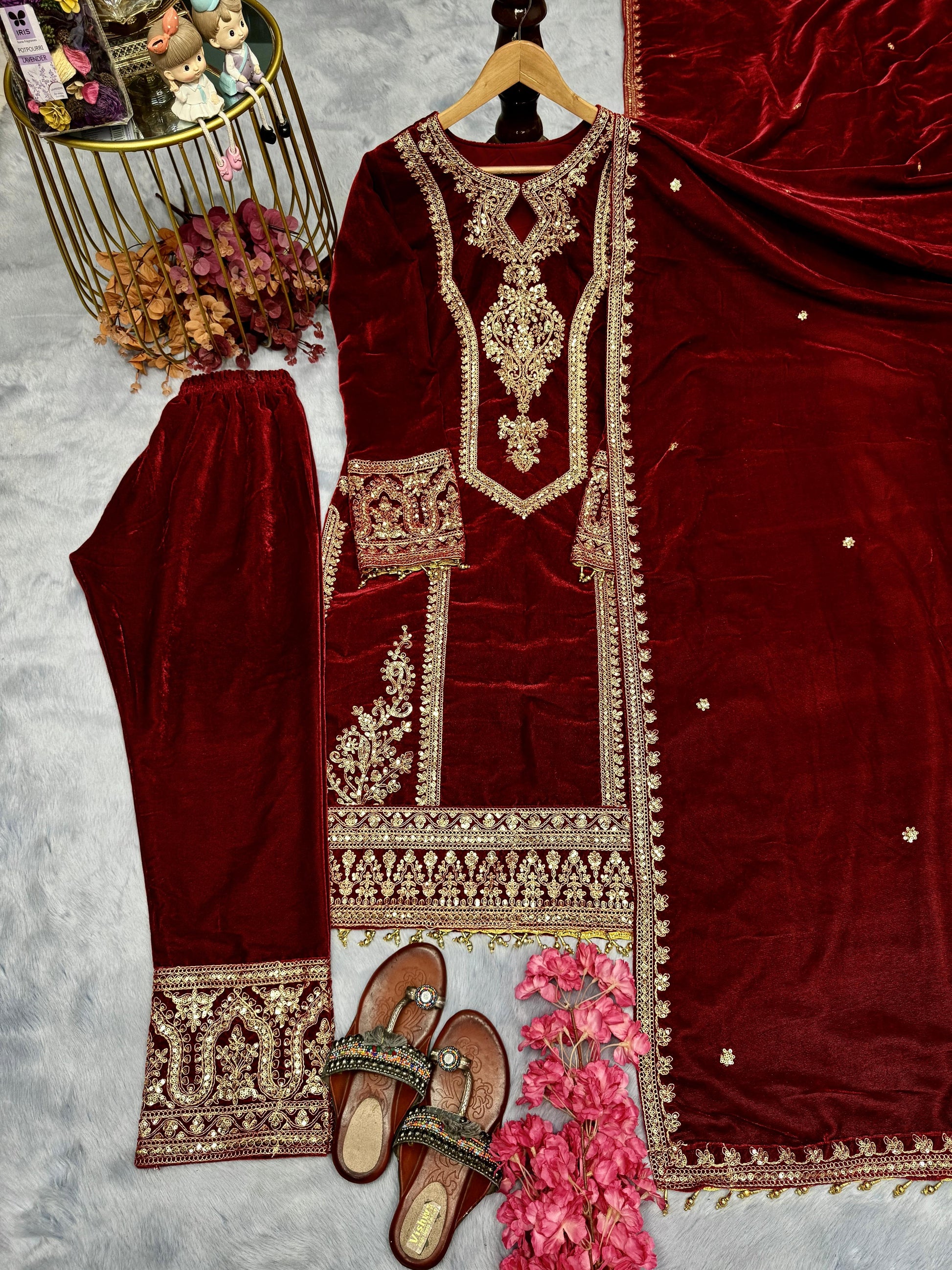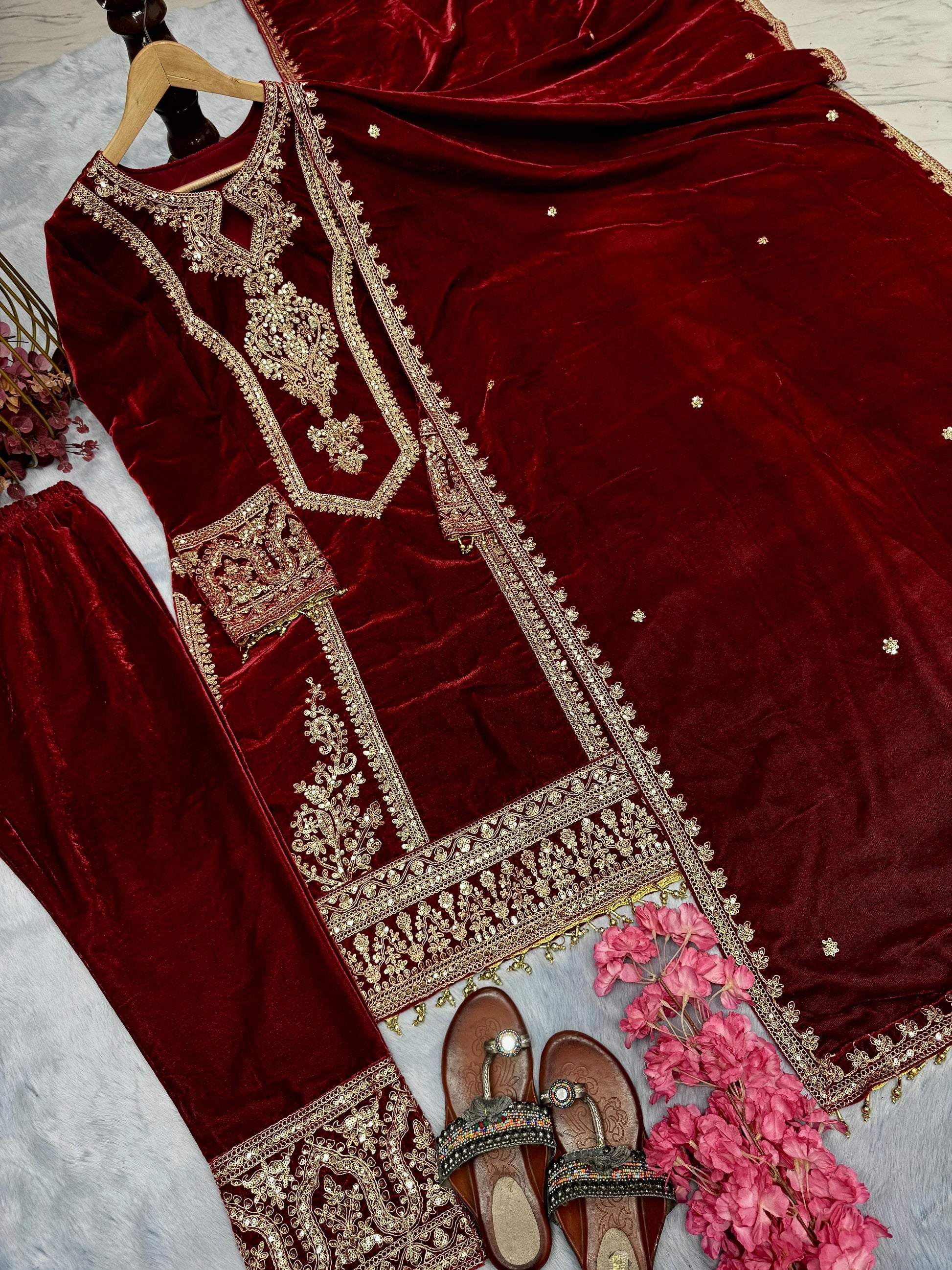 Alluring Maroon Color Heavy Pure Viscose Velvet With Embroidery 3mm Sequins And Coding Dori Work Designer Salwar Suit