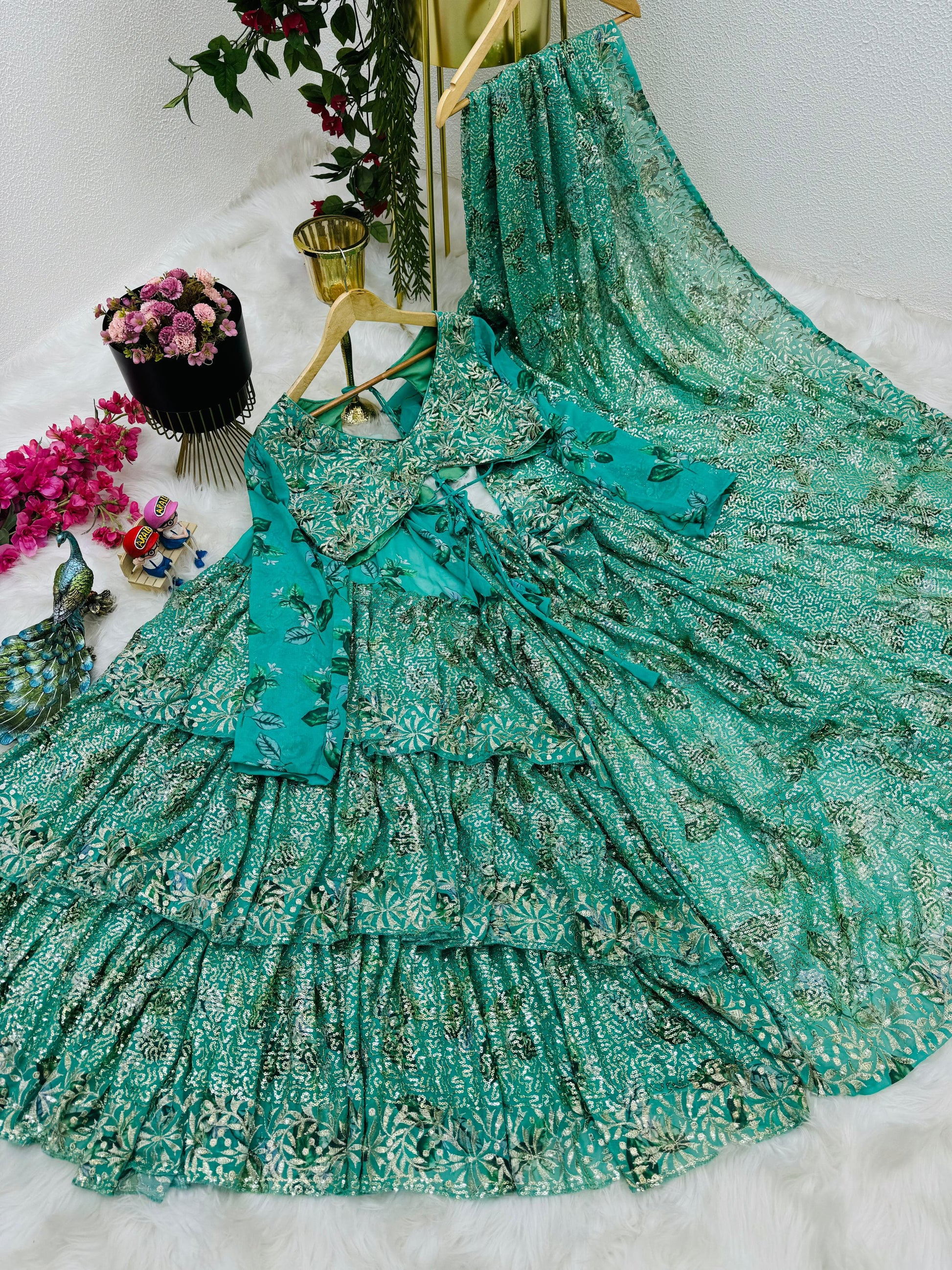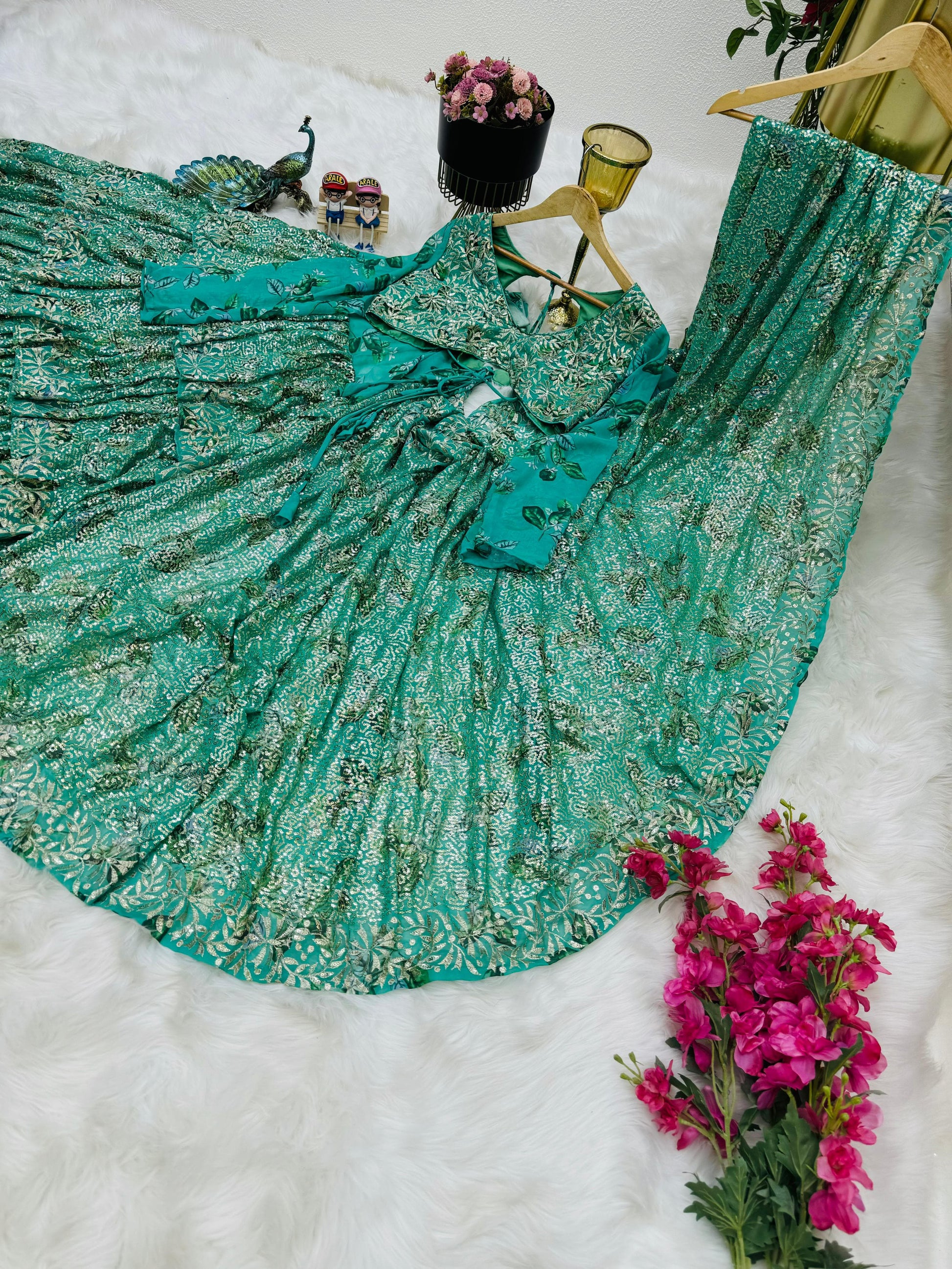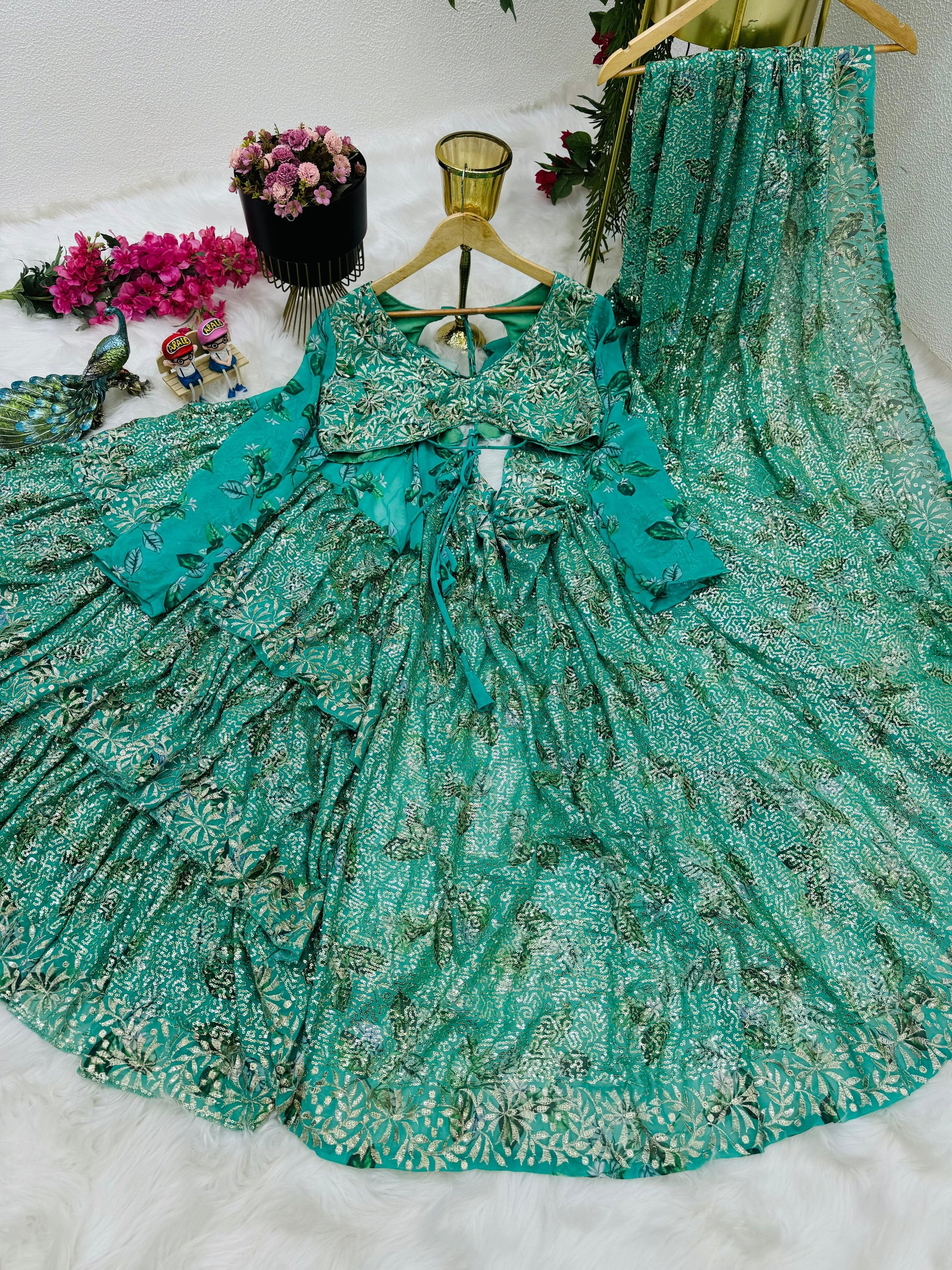 Aqua Green Color Heavy Sequence Work Lehenga Saree