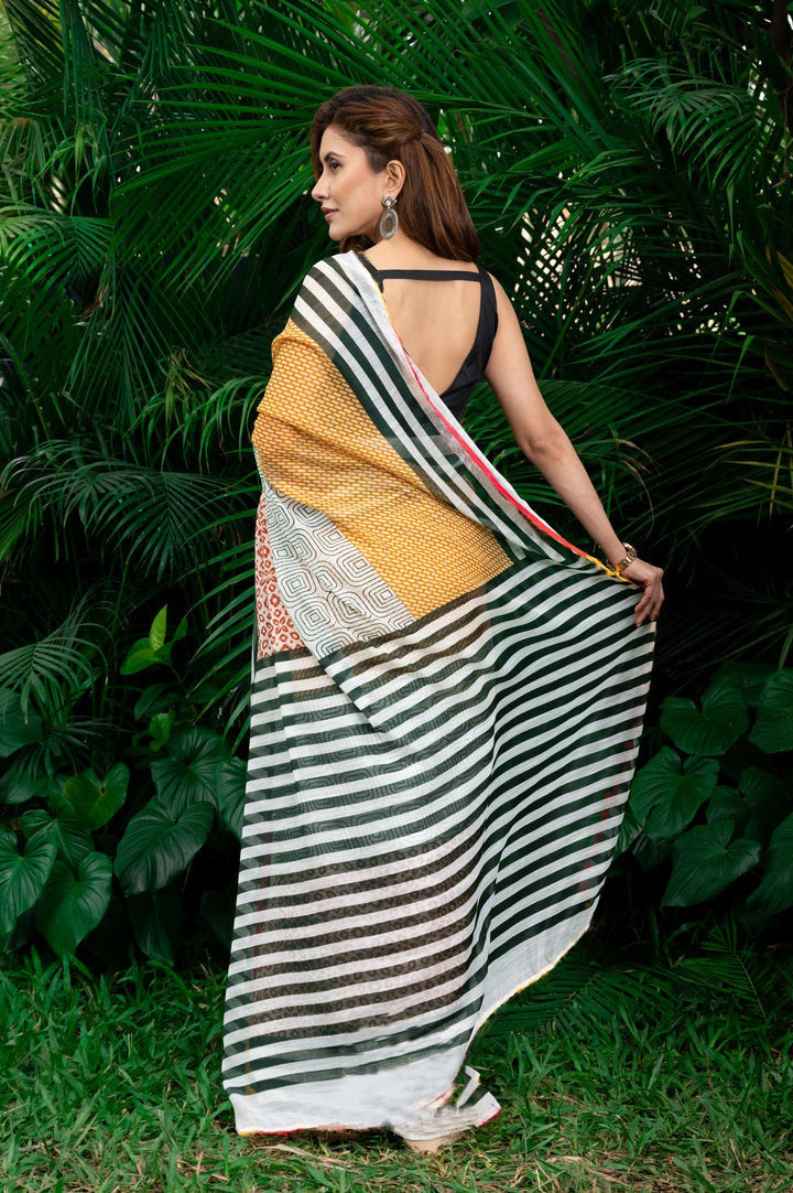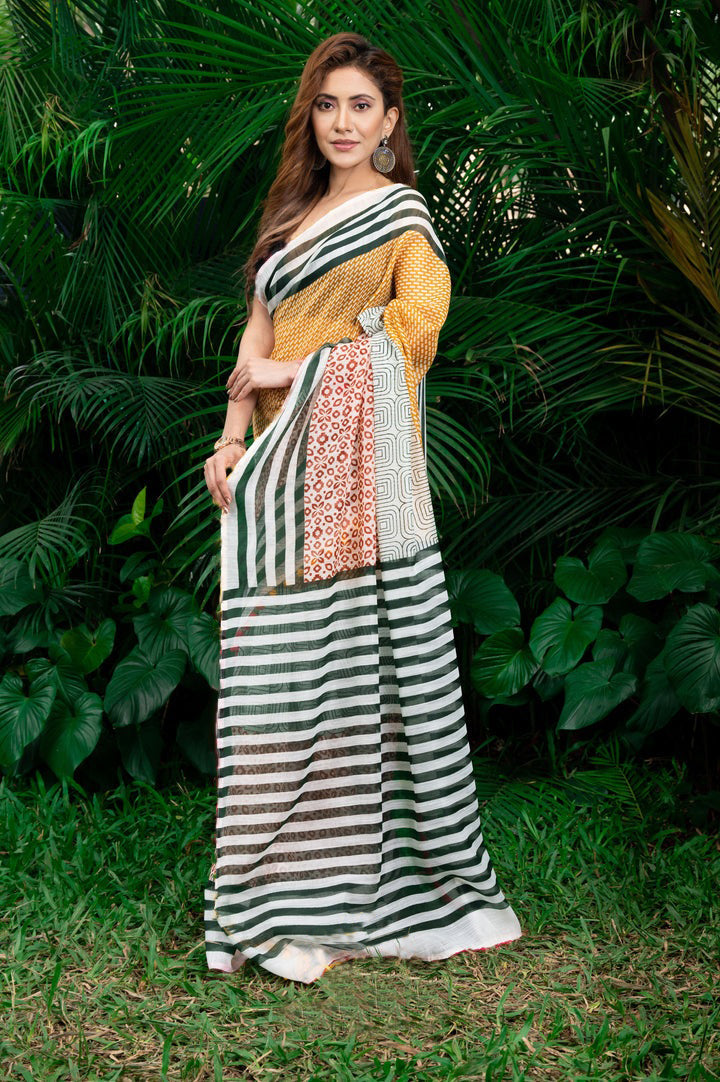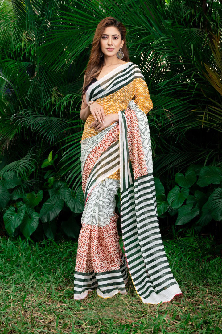 Design :- Zari Patta Pure Cotton Lilen Saree With Digital Print With Digital Blouse Pieces
