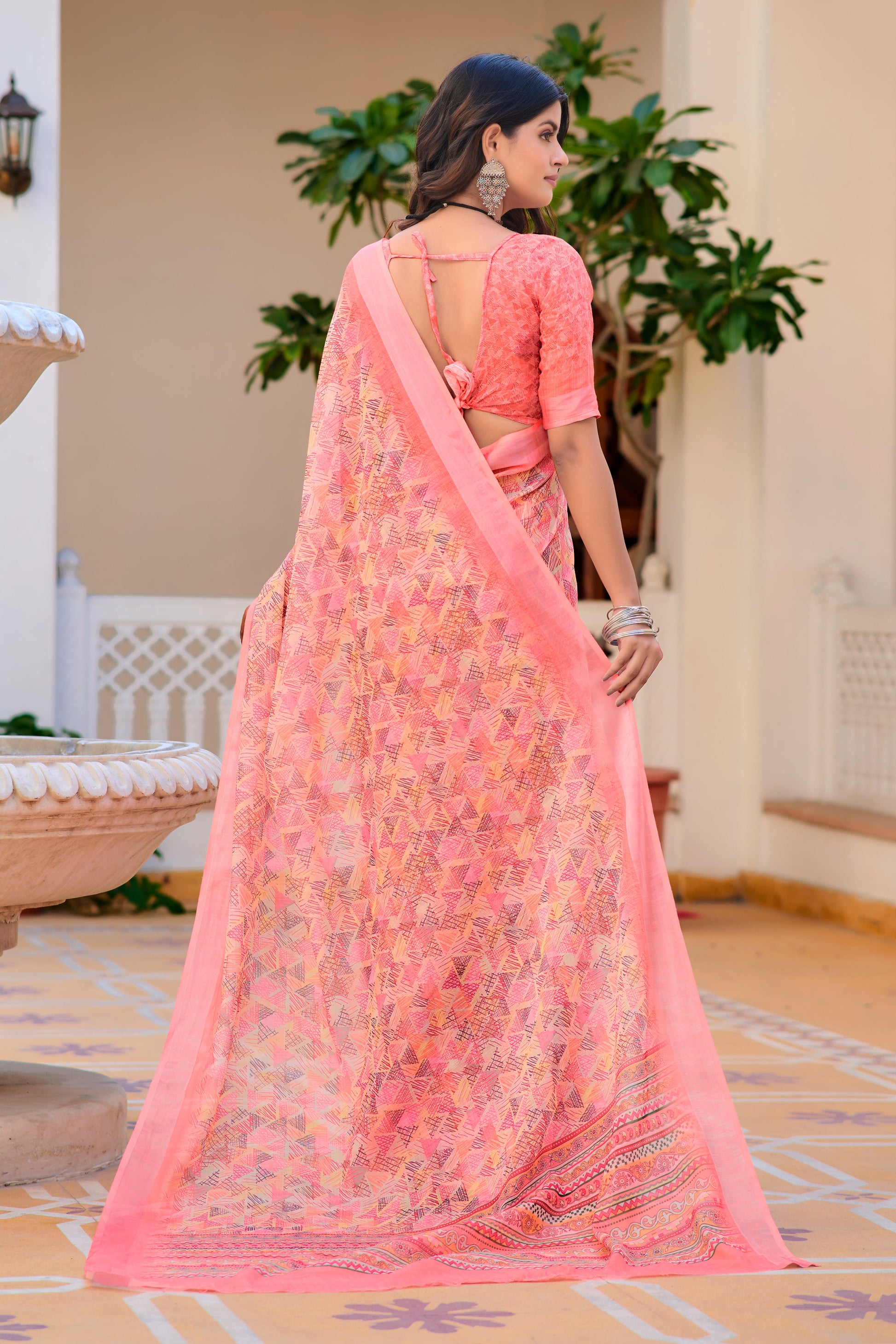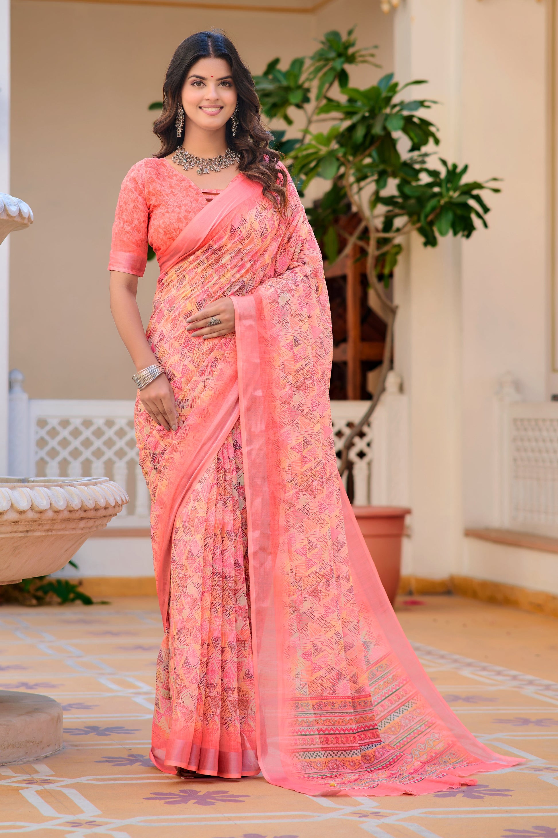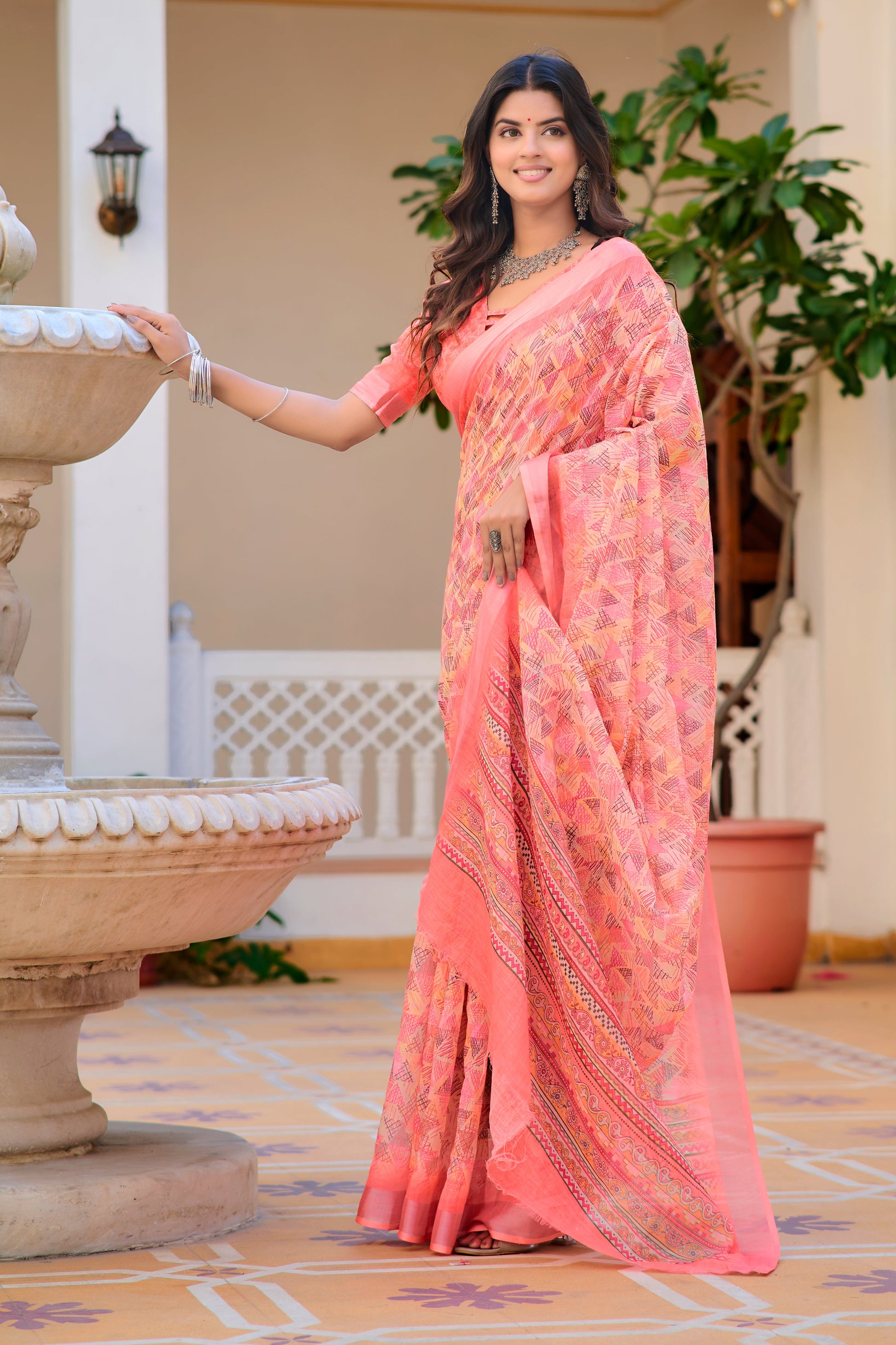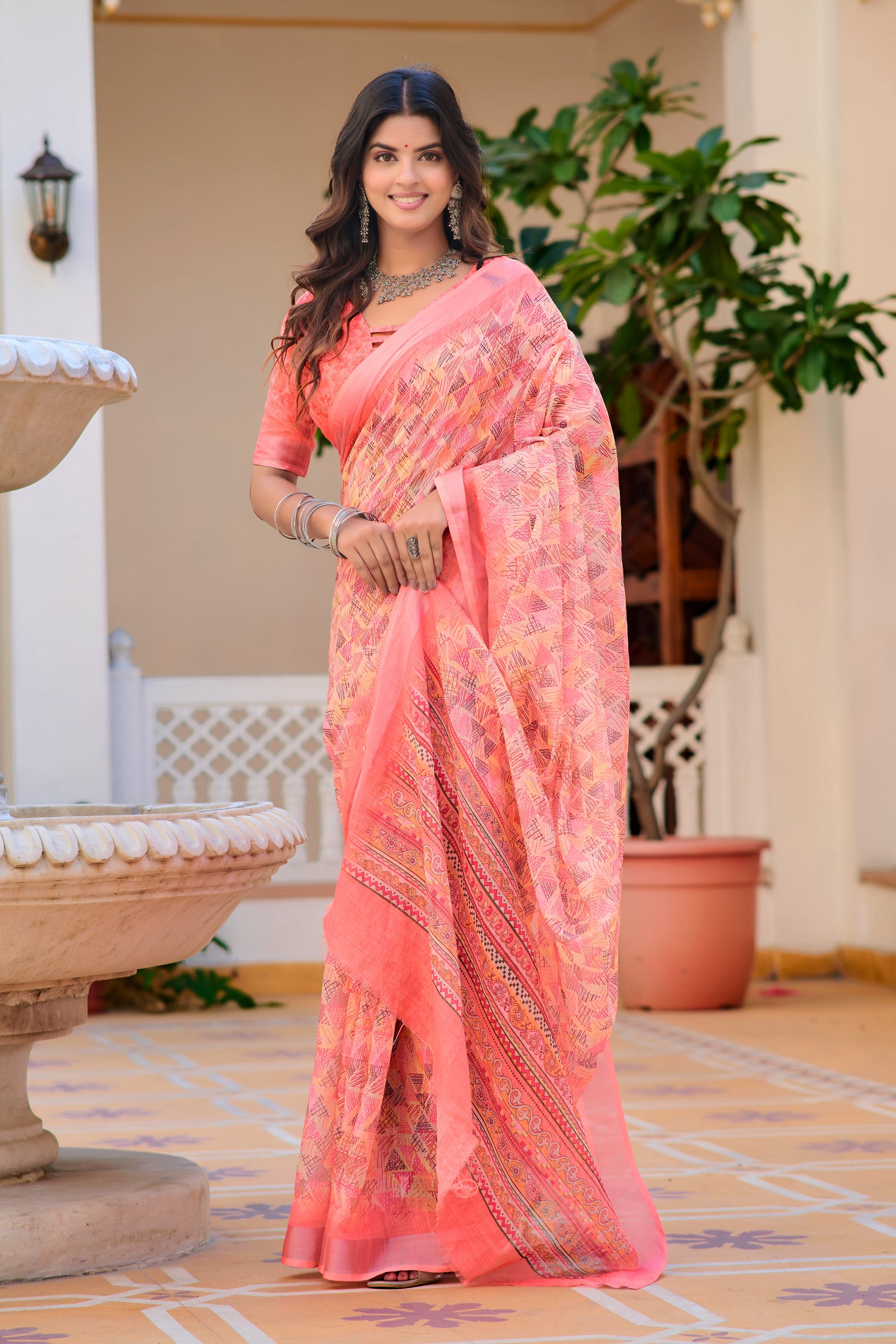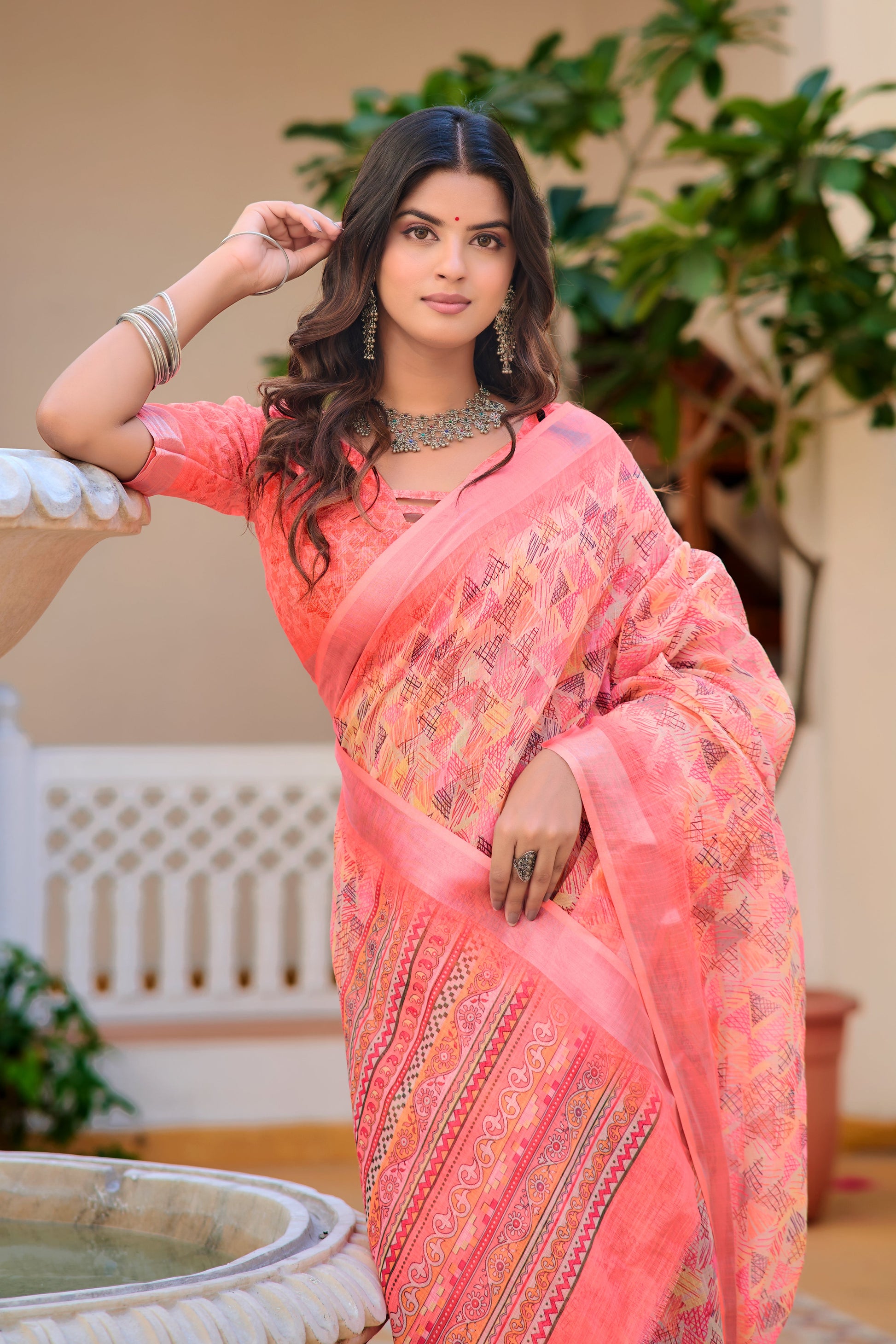 Awesome Peach Color Color Pure Cotton Lilen With Digital Printed Designer Saree