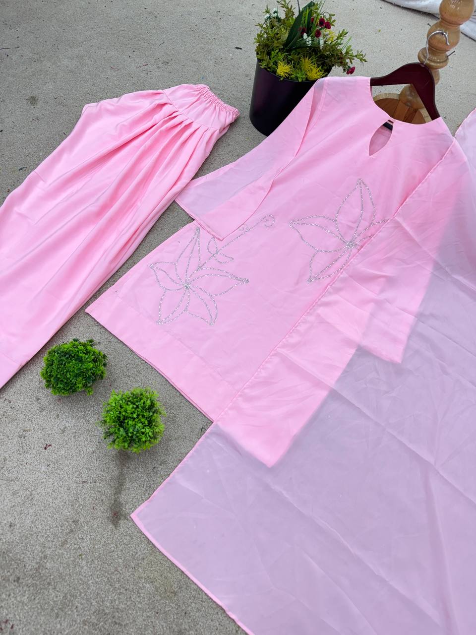 Beautiful Light Pink Color Jharkhand Diamond Work Crepe Silk Suit Set β Fully Stitched Top, Farshi Pant & Dupatta
