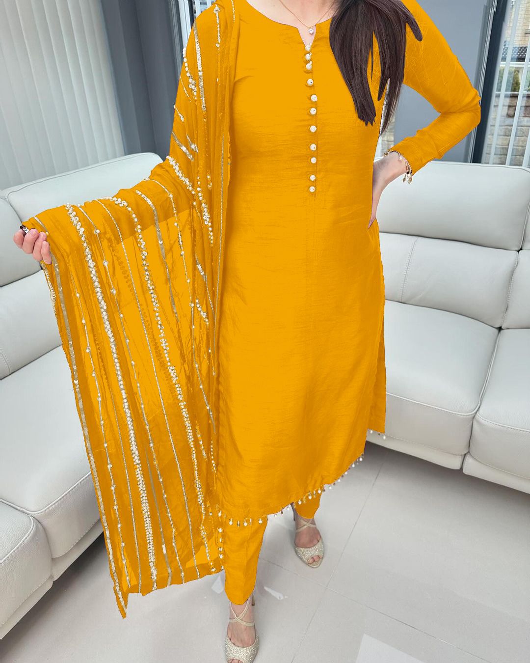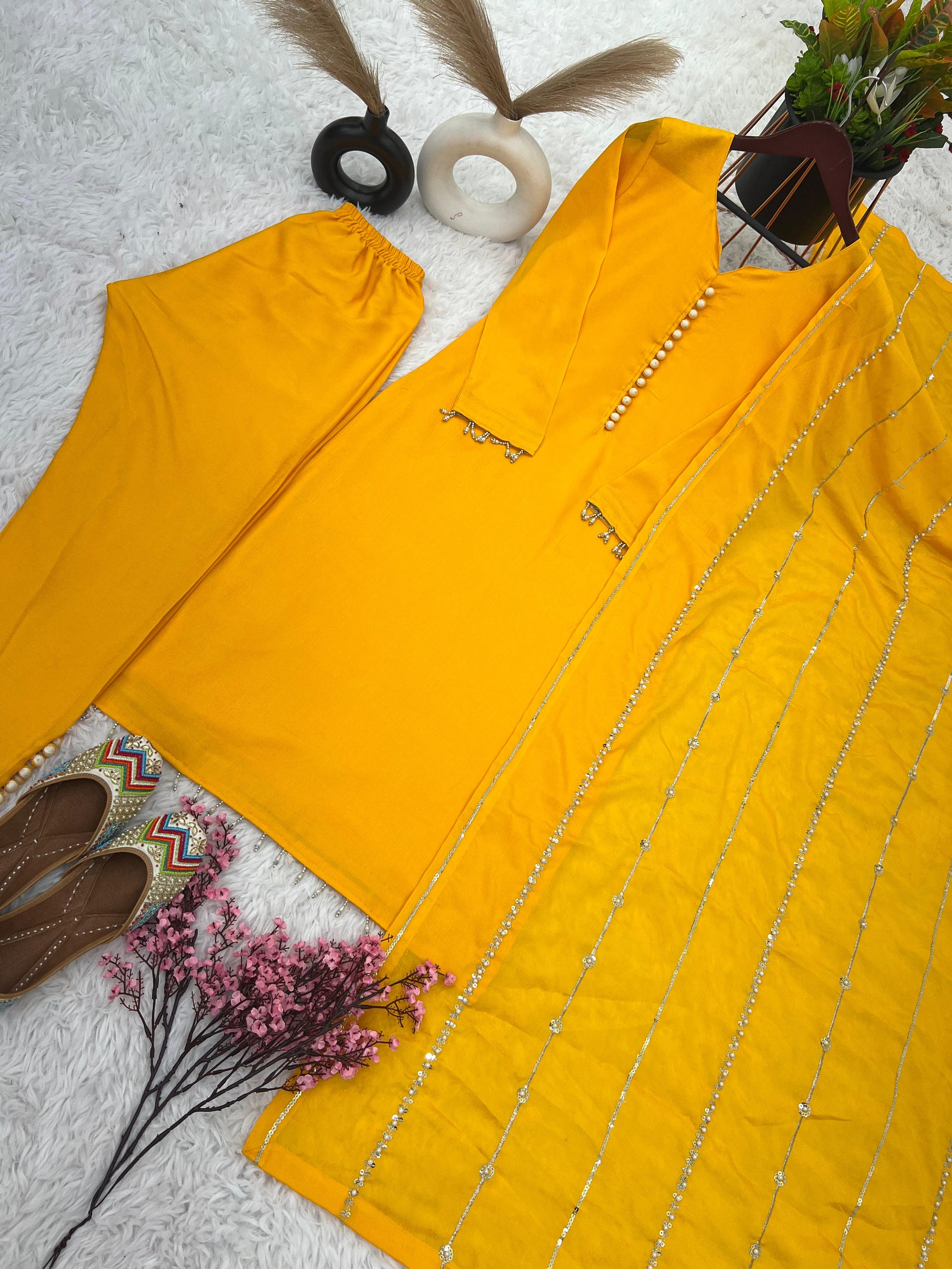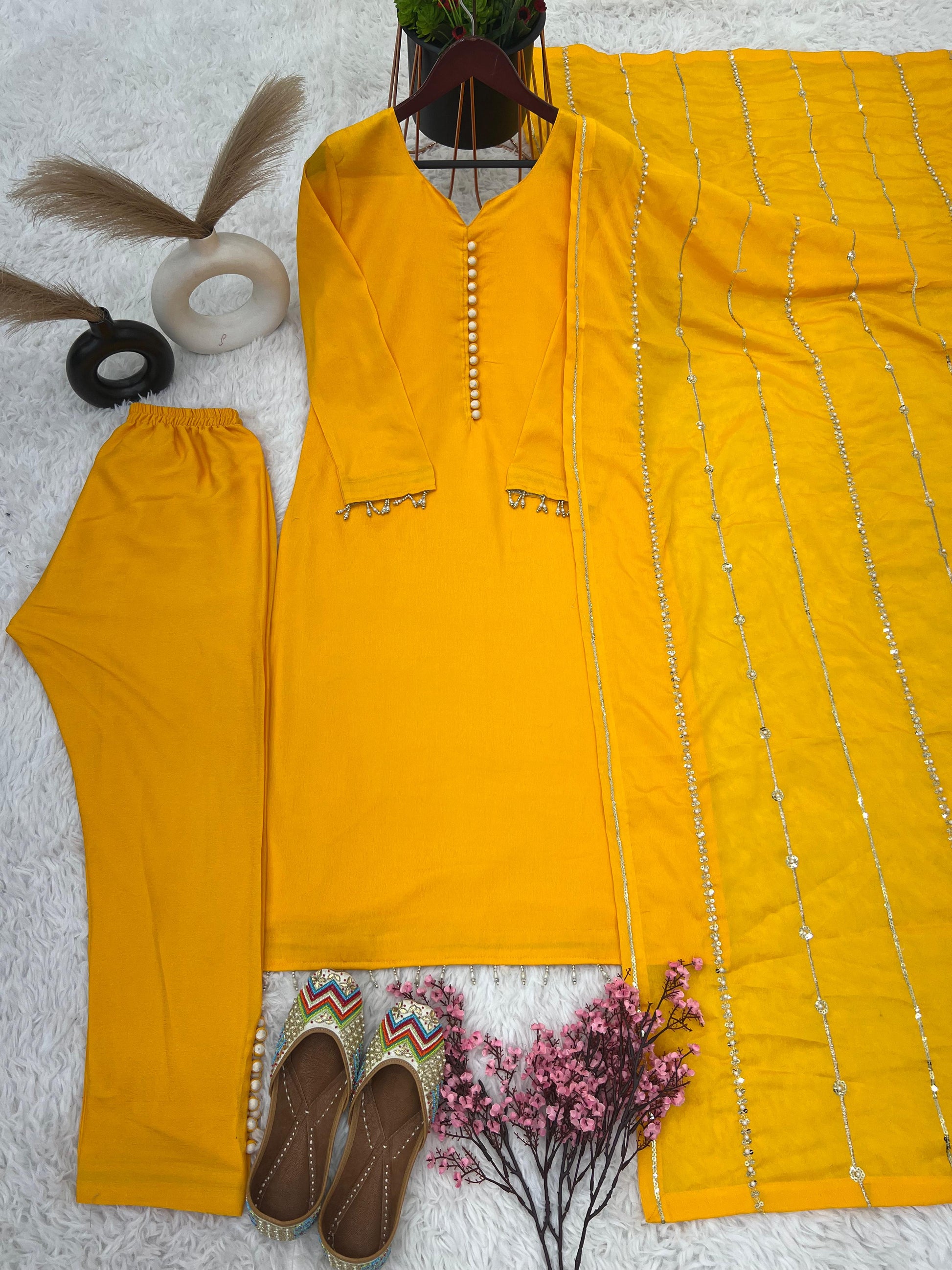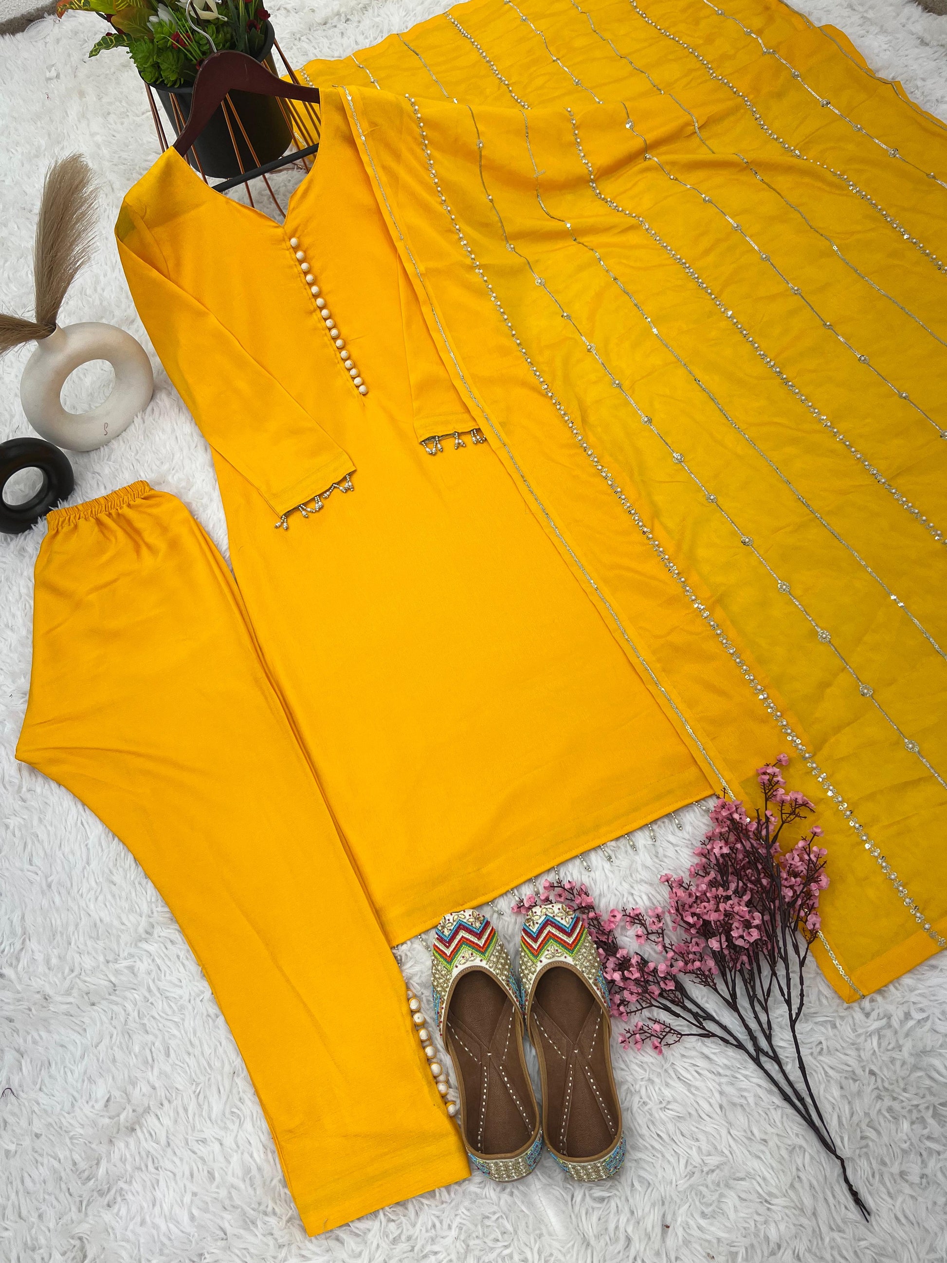 Beautiful Look Yellow Color Designer Kurti Pent With Dupatta