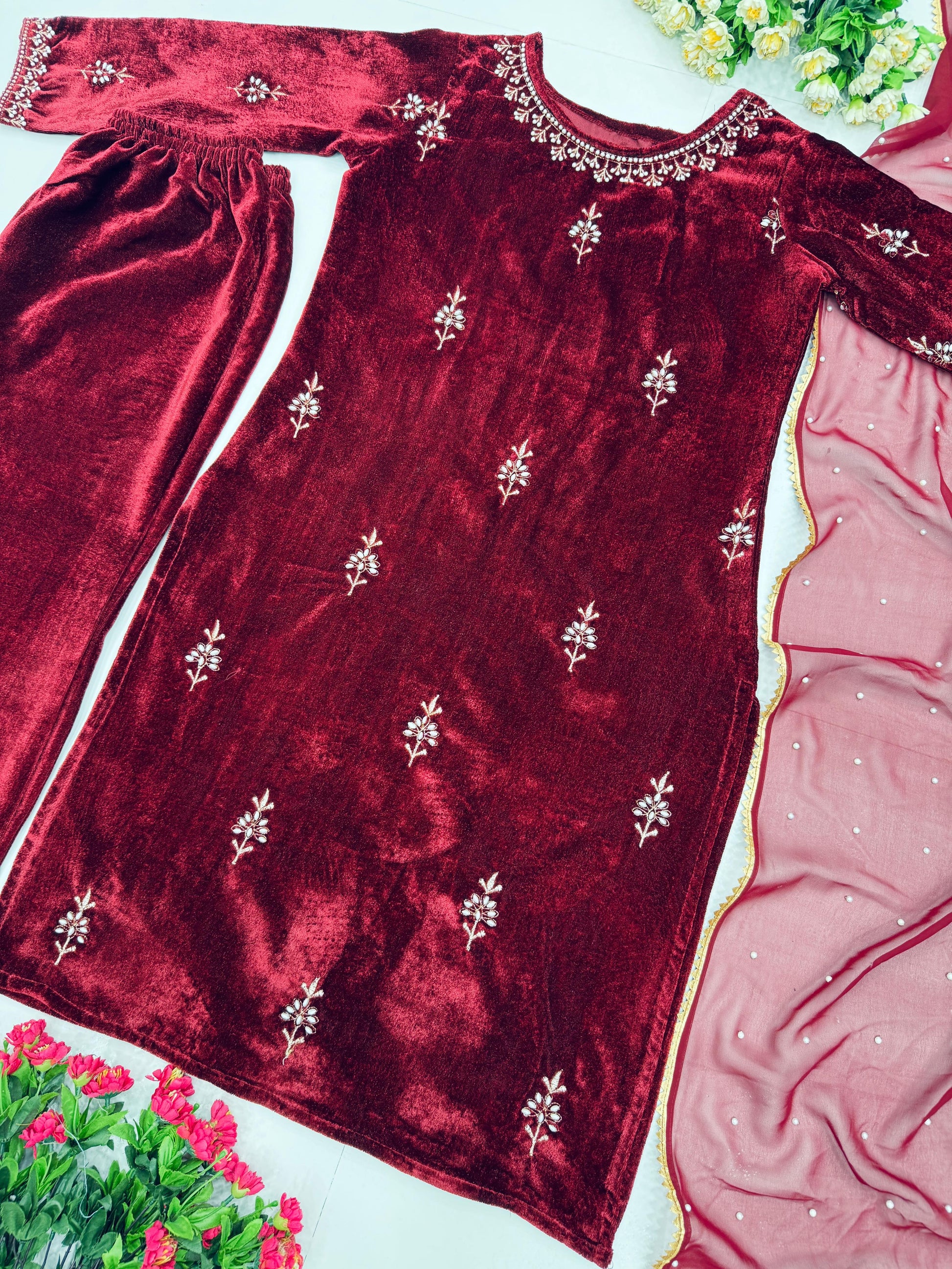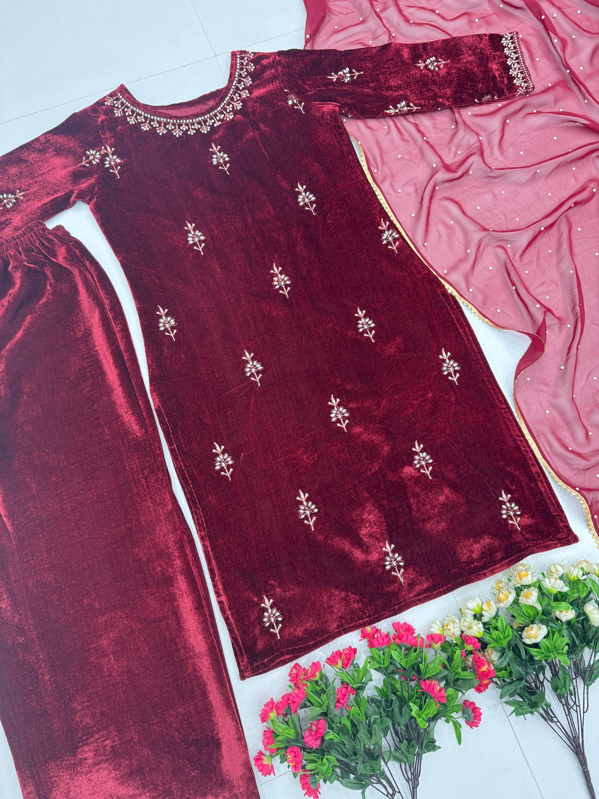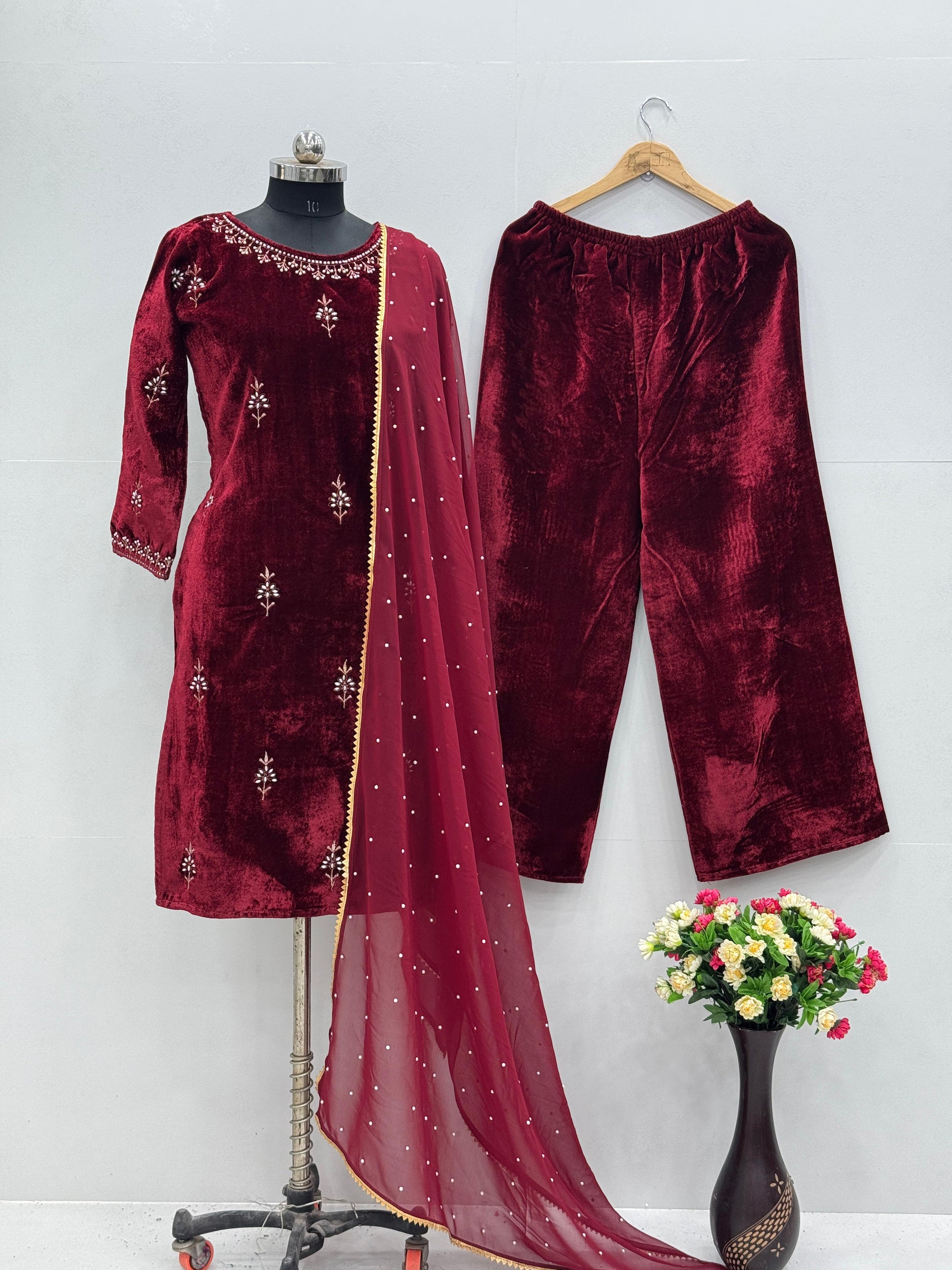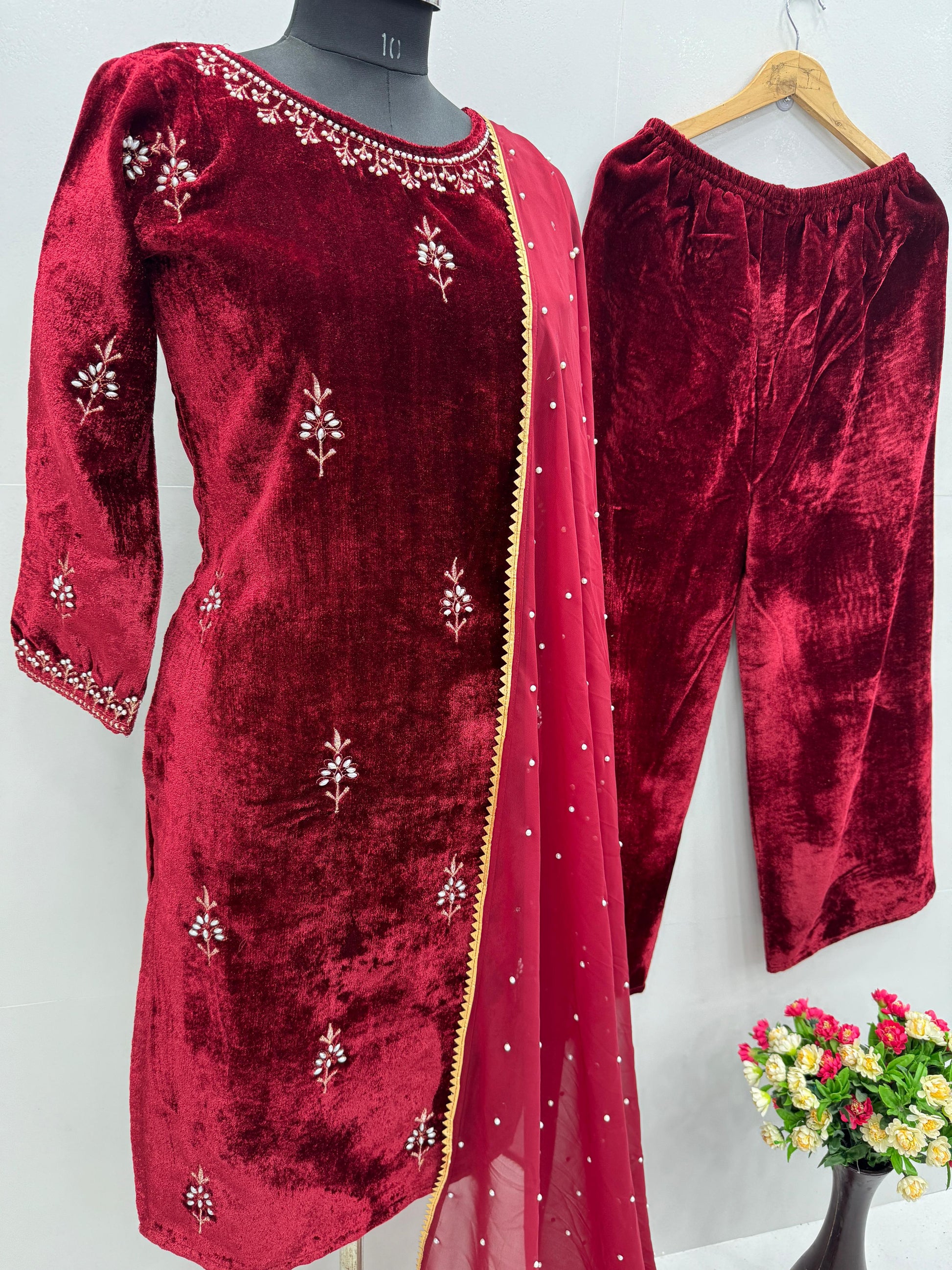 Beautiful Maroon Color Heavy Viscose And Embroidery With Hand Work Designer Velvet Suit