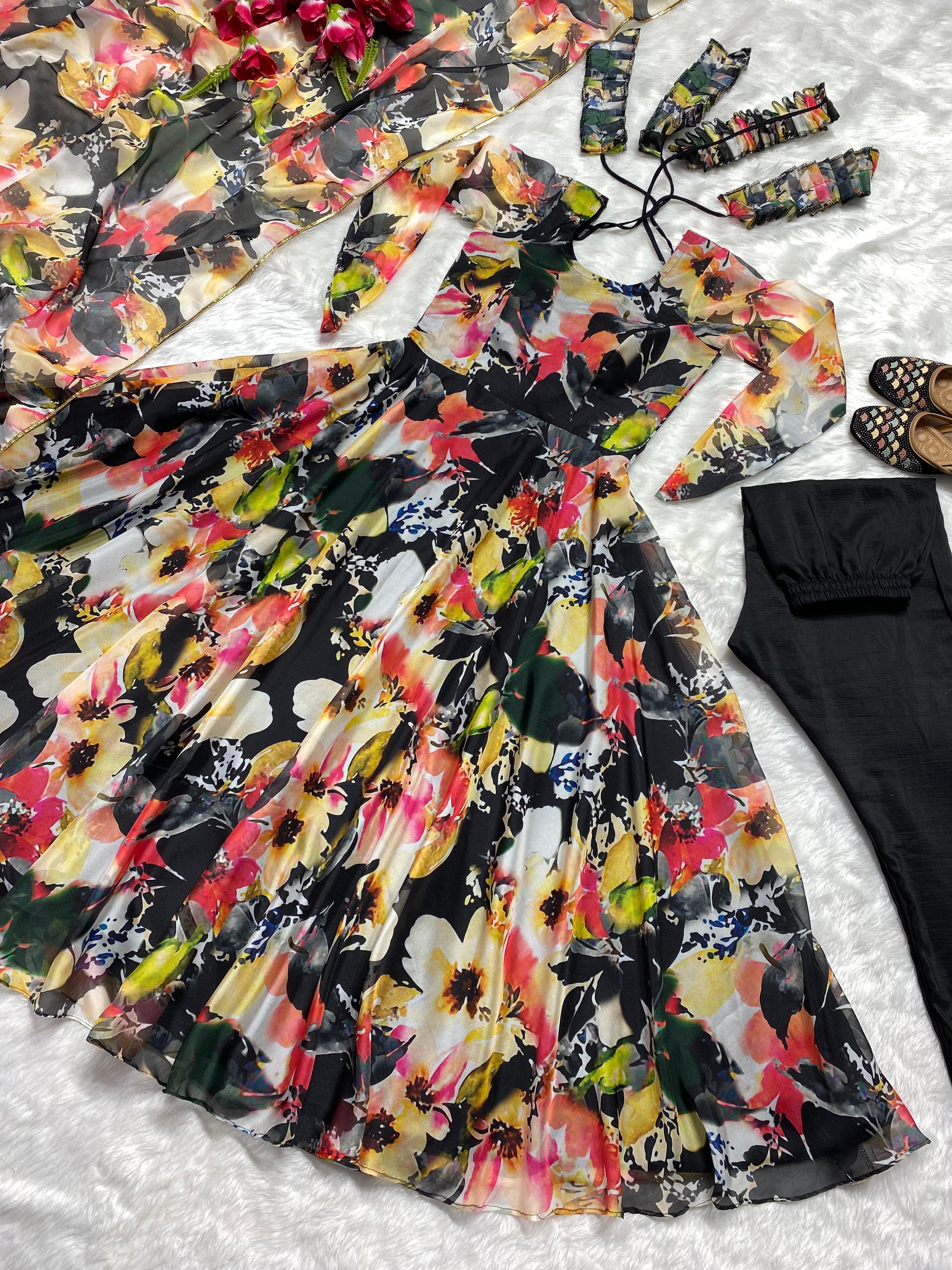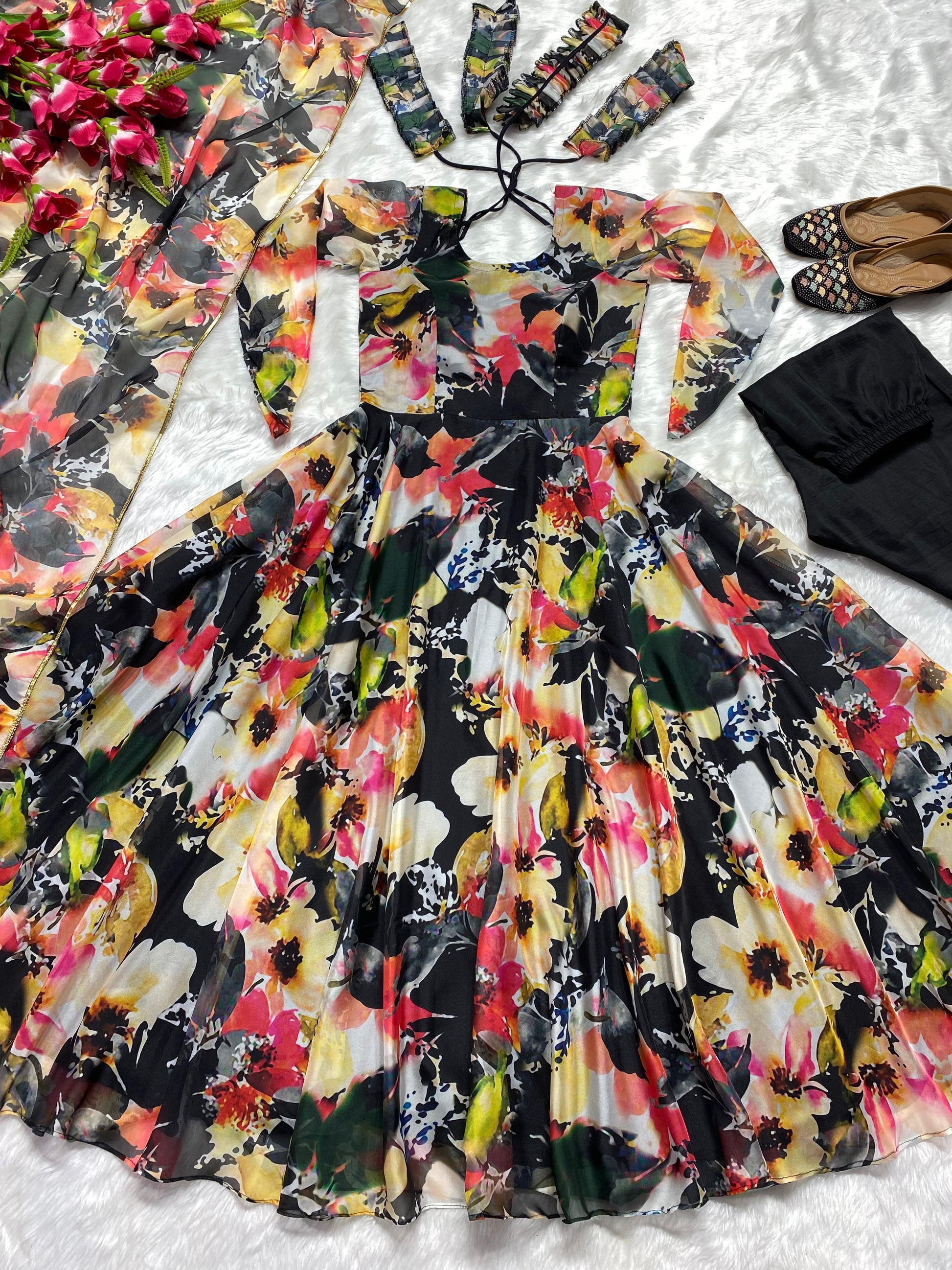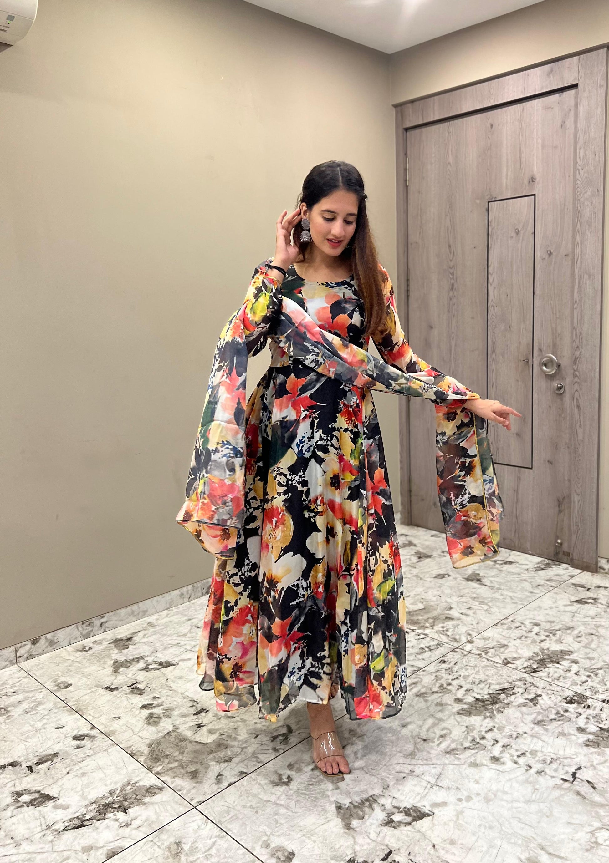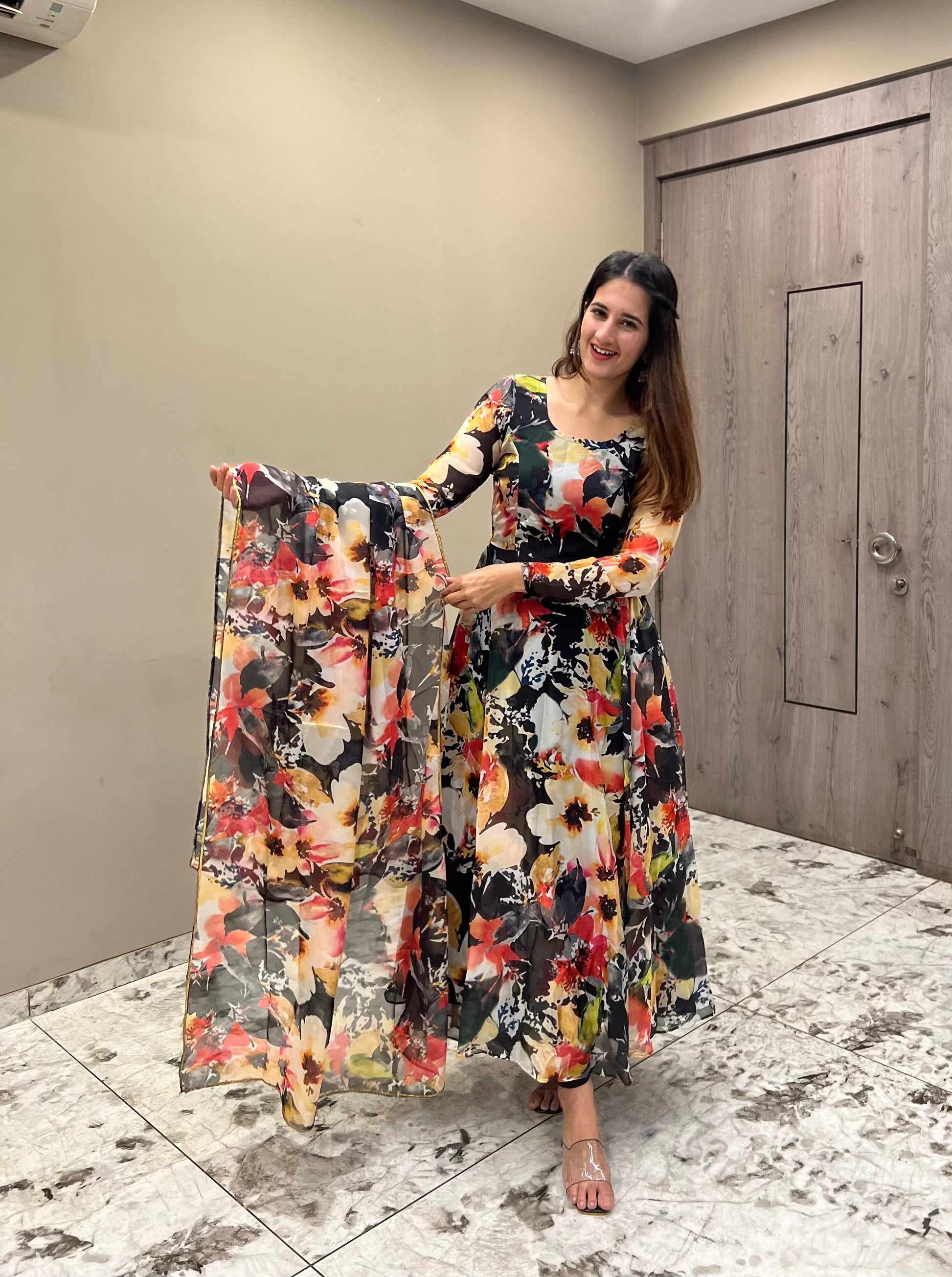 Black Anarkali Dress With Digital Print in Organza With Dupatta 7 Meter Flair