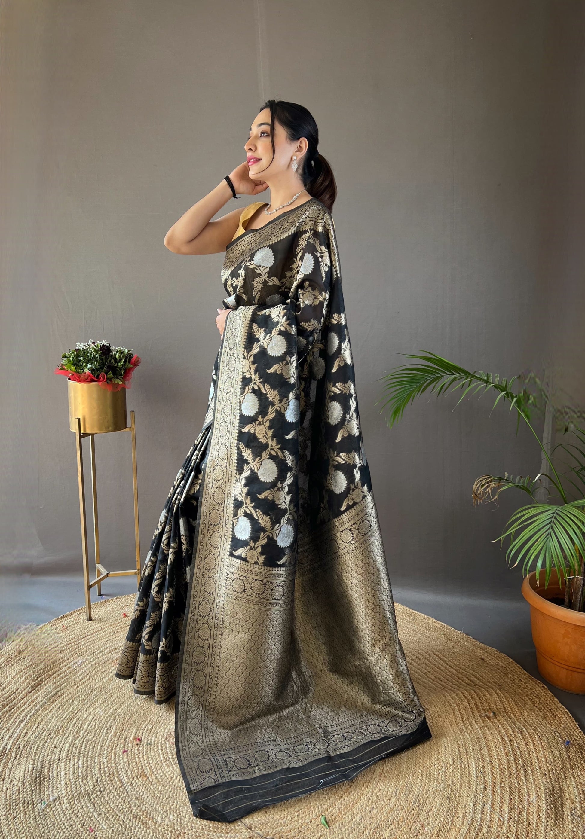 Black Color Copper And Gold Zari Weaving Cotton Saree