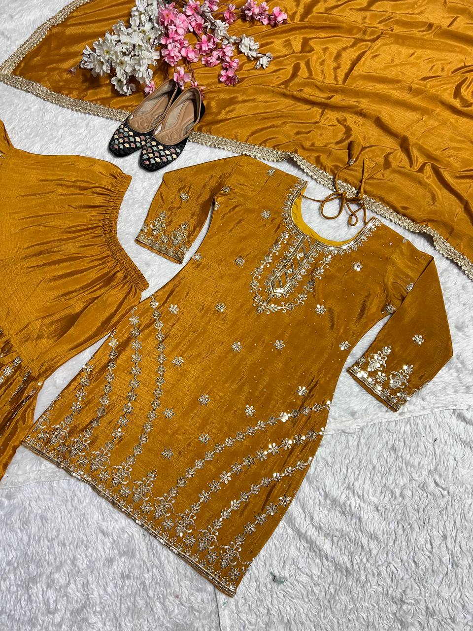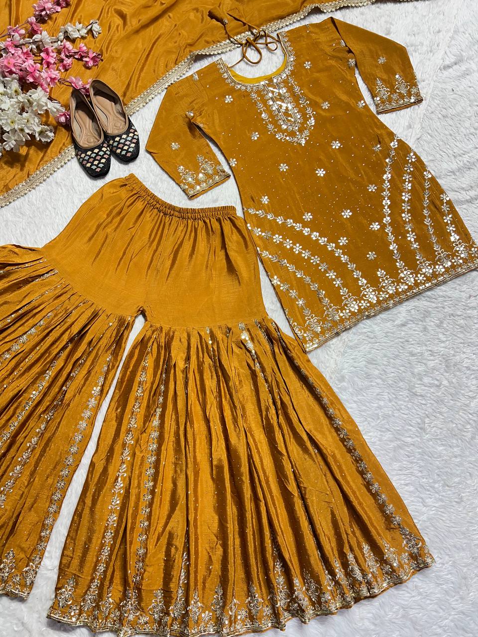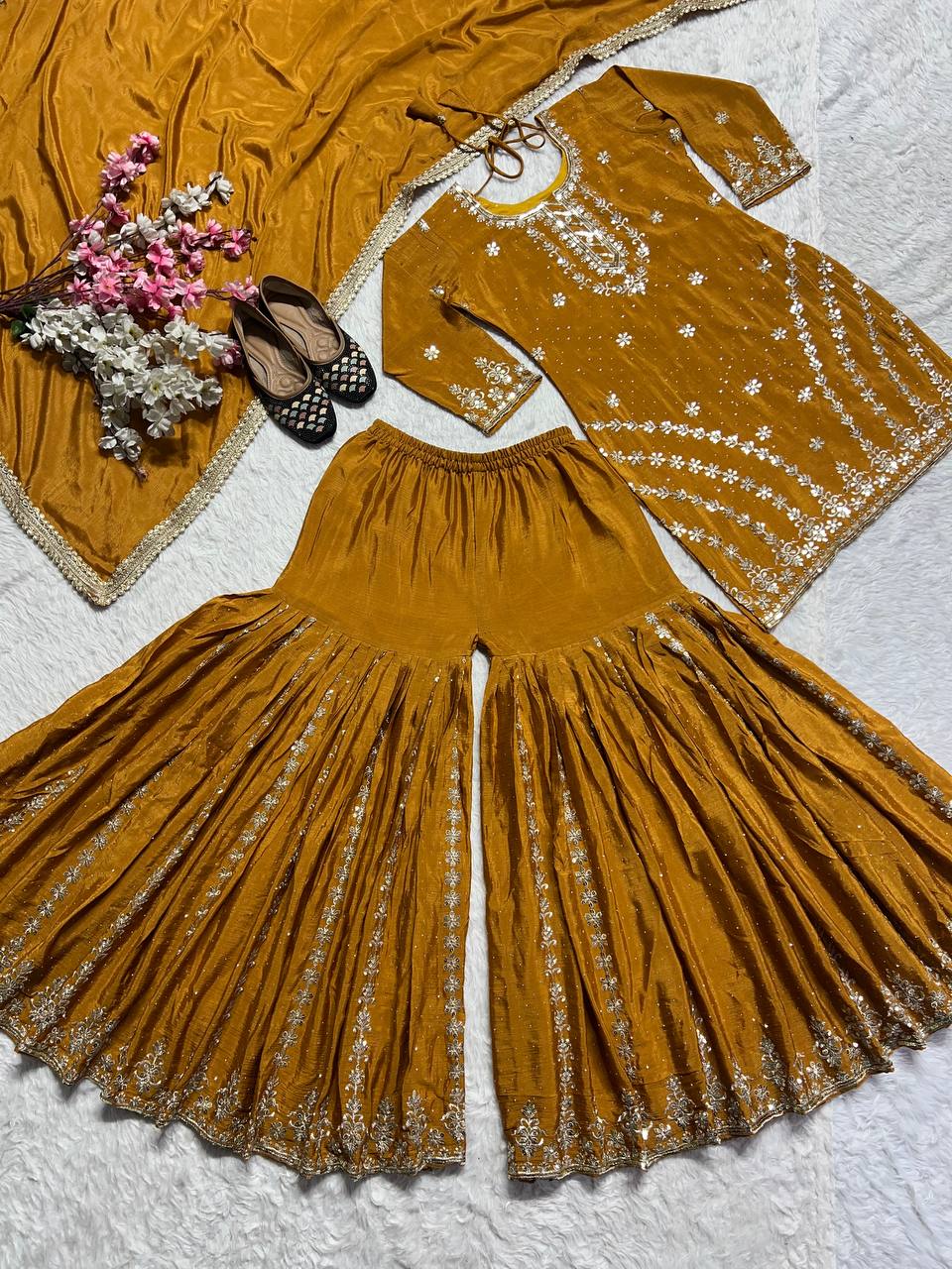 Blissful Golden Color Pure Heavy Chinon Silk With Embroidery Work Sharara Suit
