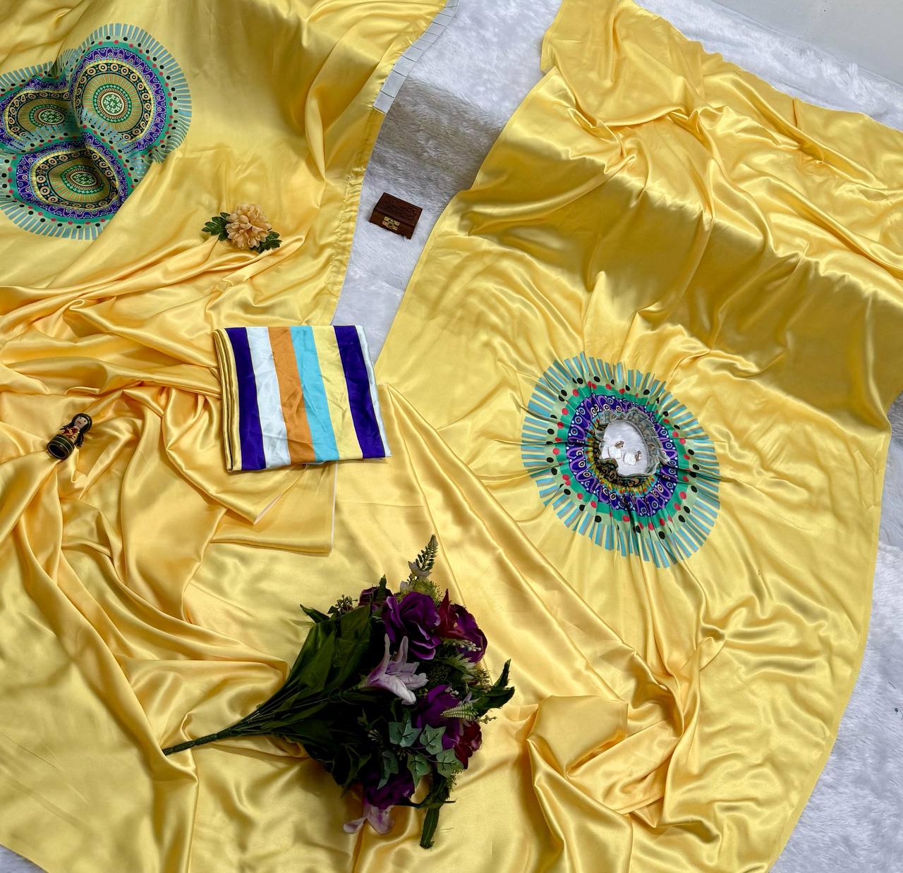 Blissful Yellow Color Japan Satin With Digital Print Work Hands-Free Ready To Wear Saree