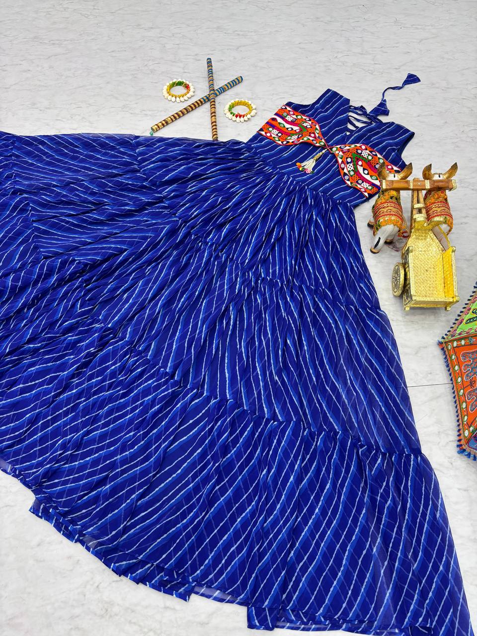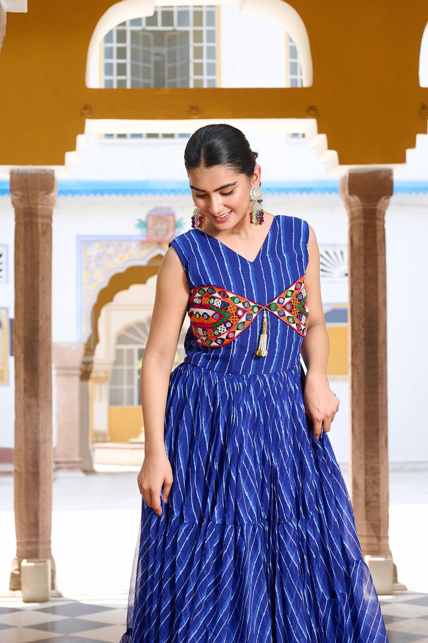 Blue Color Bandhani Printed Gamathi Embroidery With Real Mirror Work Navratril Gown