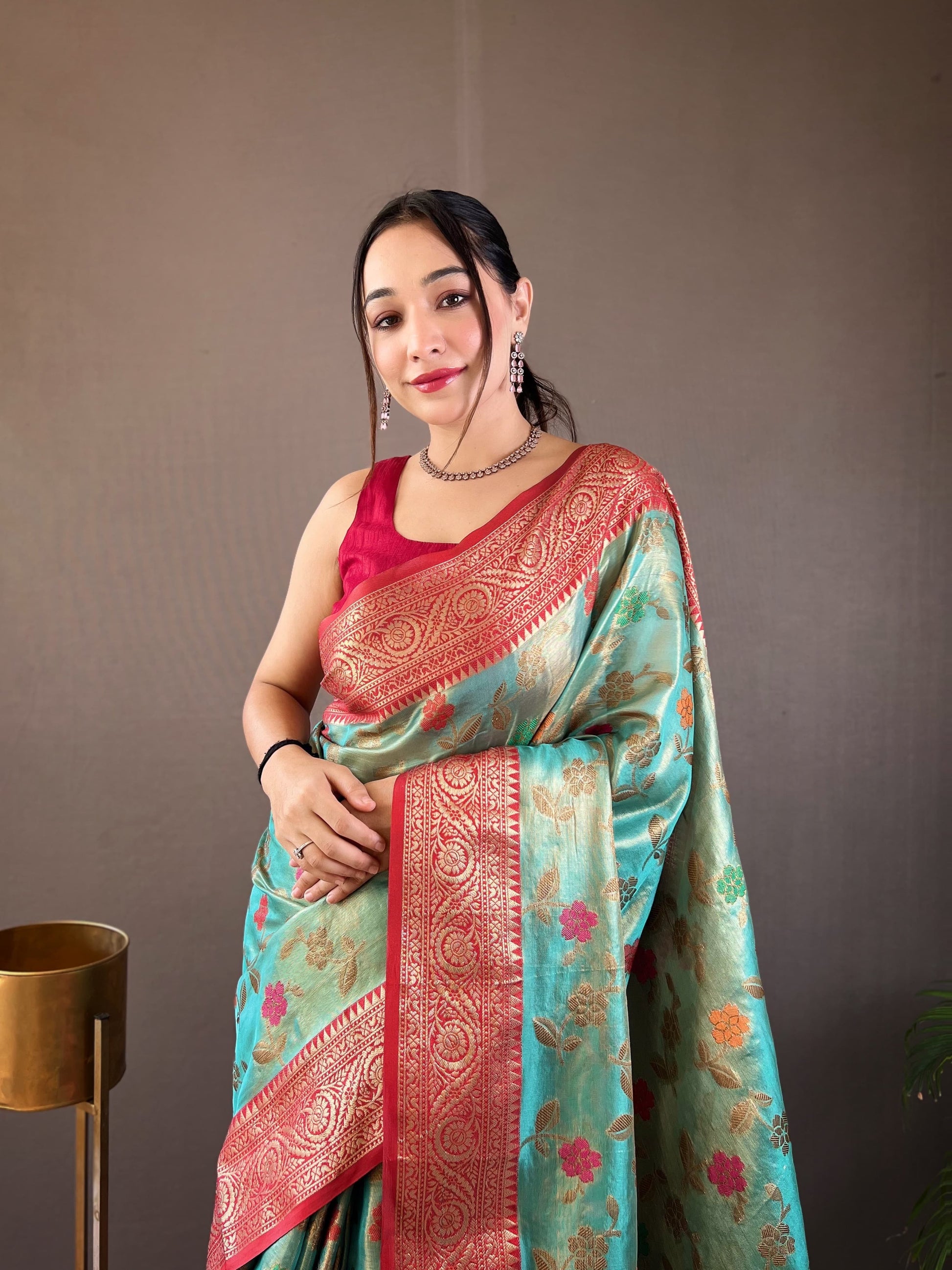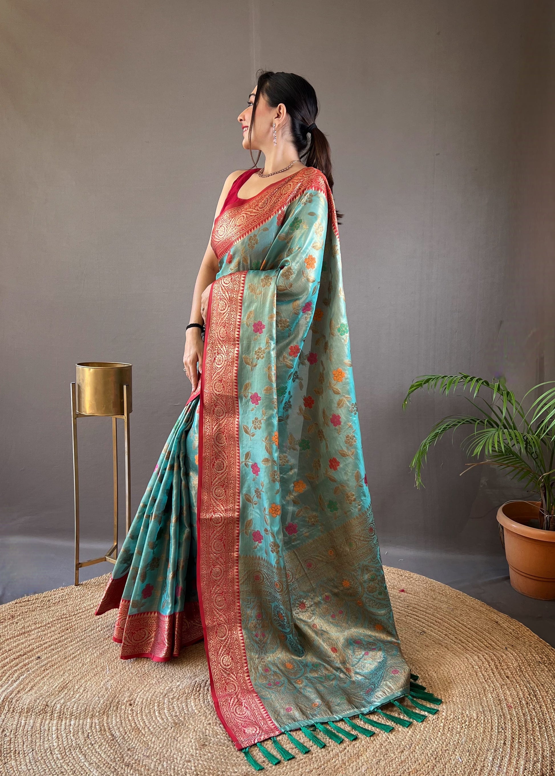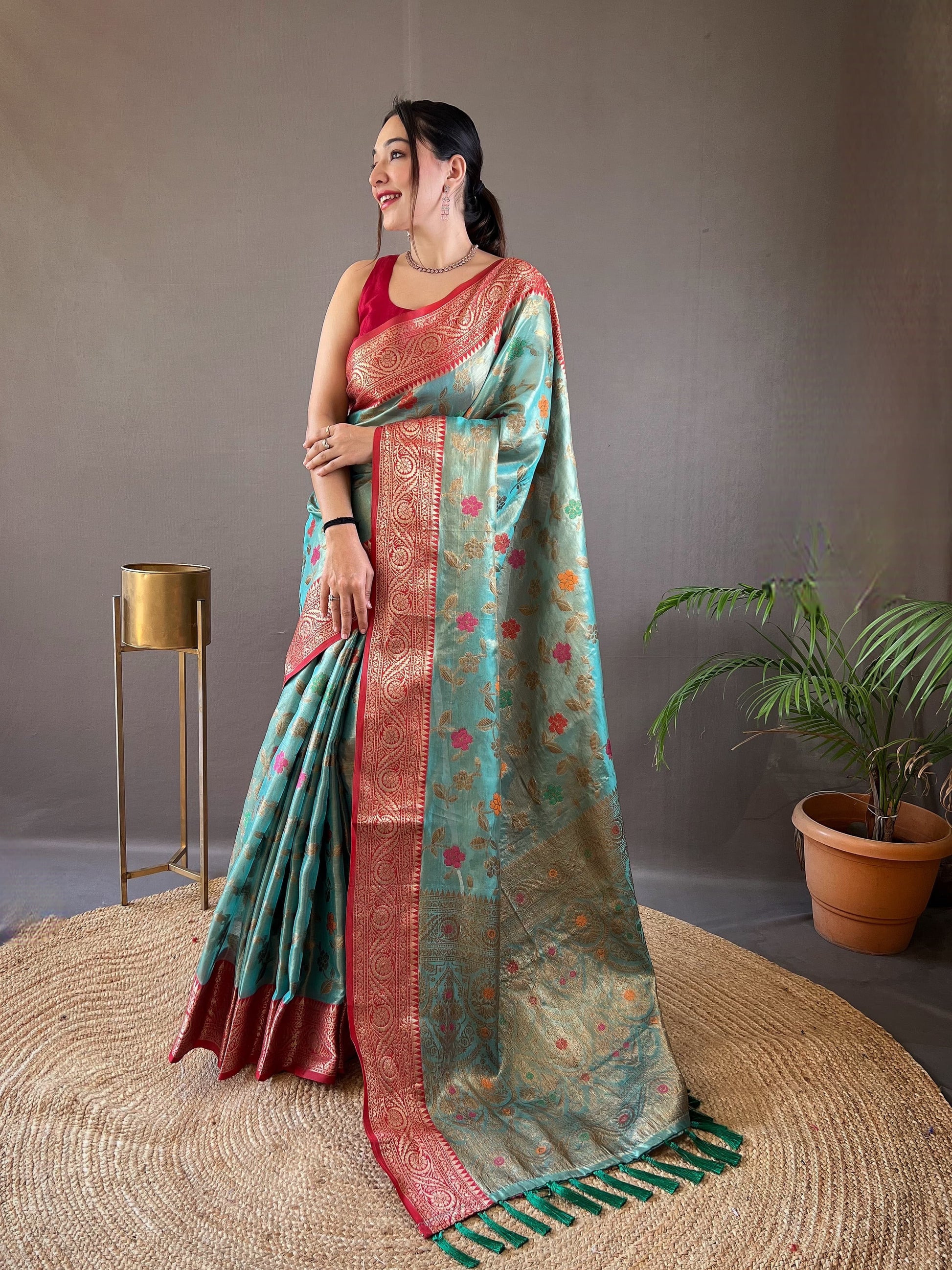 Captivating Sky Blue Color Organza Tissue Silk Saree