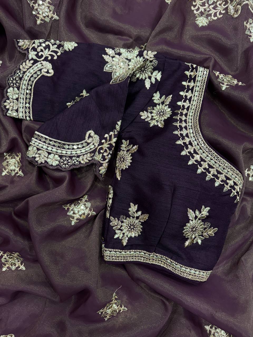 Indulge In Sheer Elegance With Our Purple Designer Saree, Featuring A Stunning Blend Of Copper Gold Weave Silk And Intricate Sequin And Zari Embroidery. The Scallop-Embroidered Border And Richly Embellished Blouse Create A Look That’s Regal And Unforgettable.