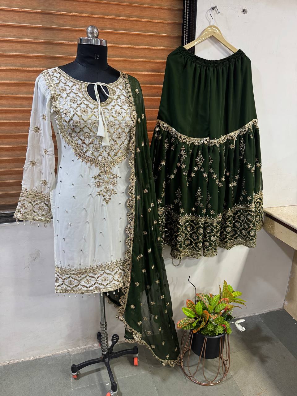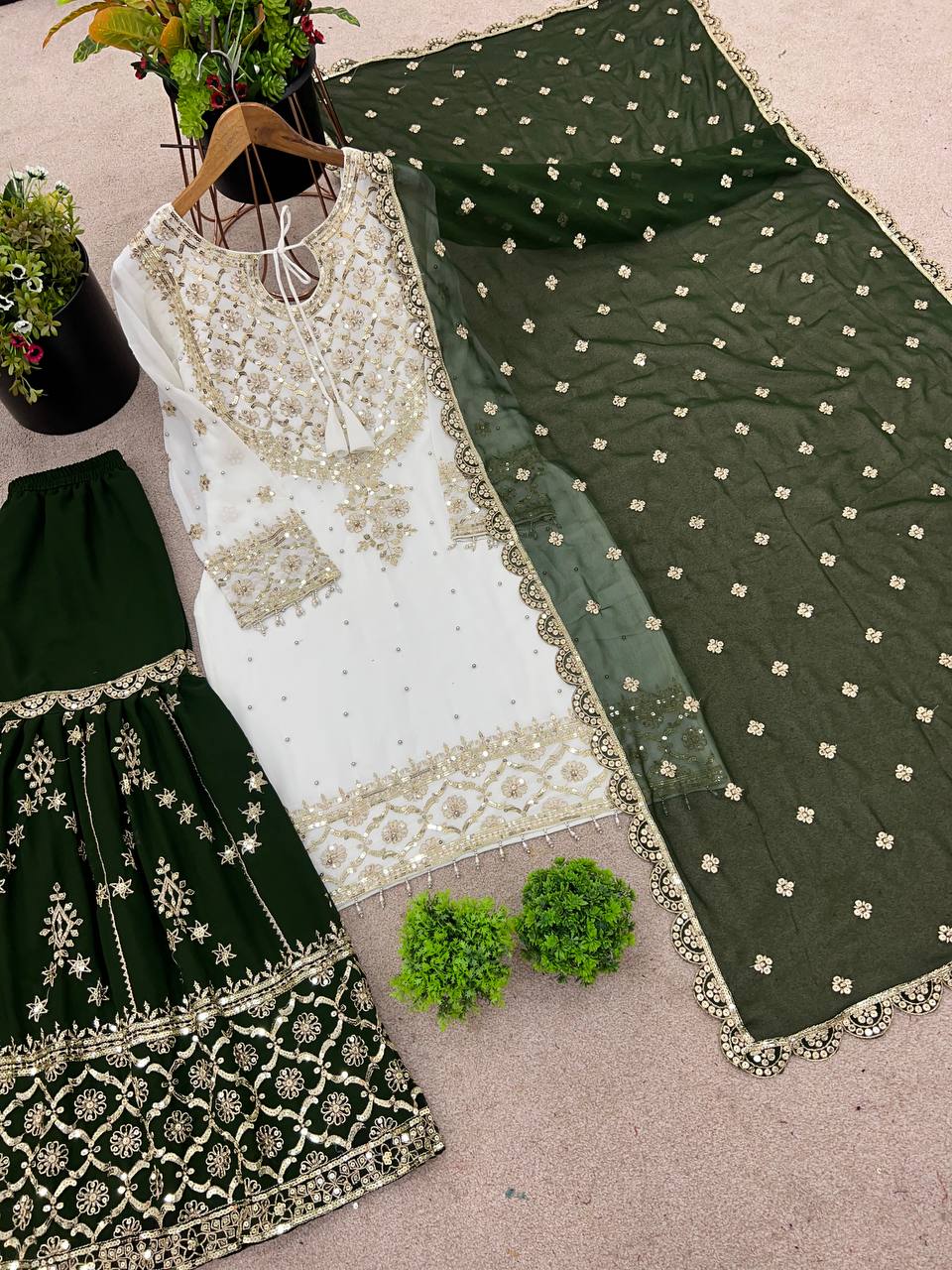 Ceremony Wear Green Color Heavy Faux Georgette With Embroidery Sequence Work Sharara Suit