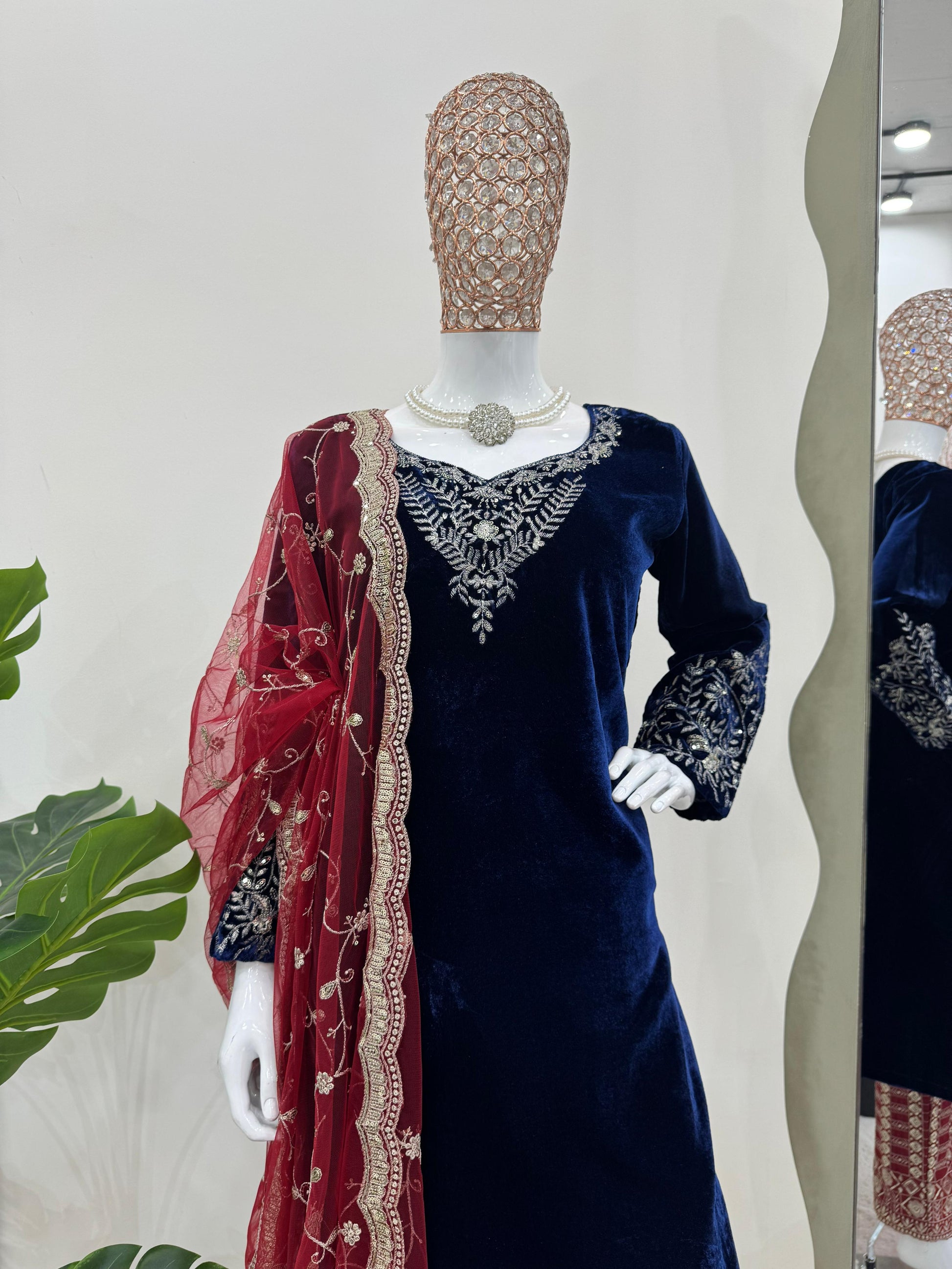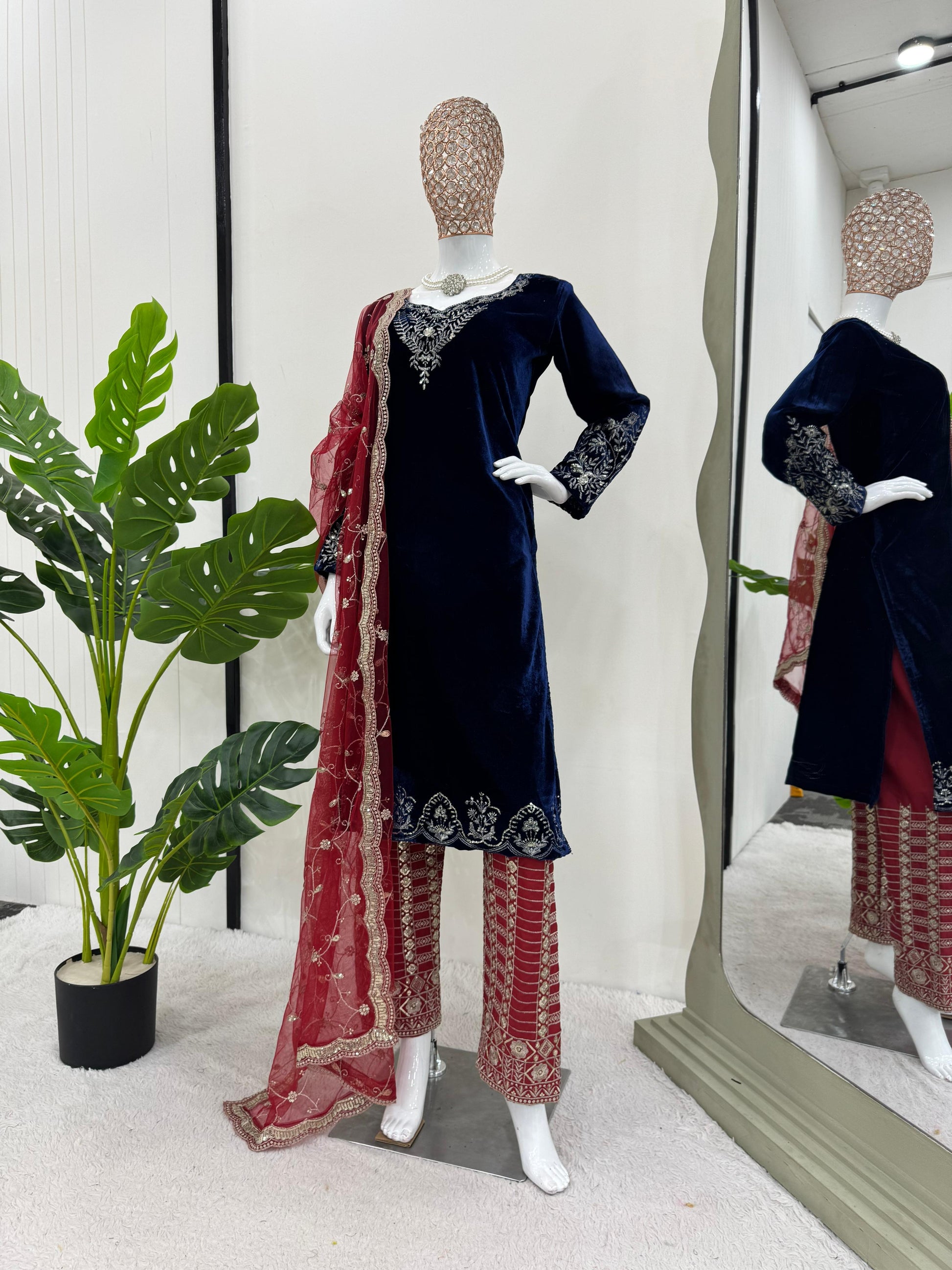 Ceremony Wear Navy Blue Color Viscos Velvet Thread With Sequence Work Salwar Suit
