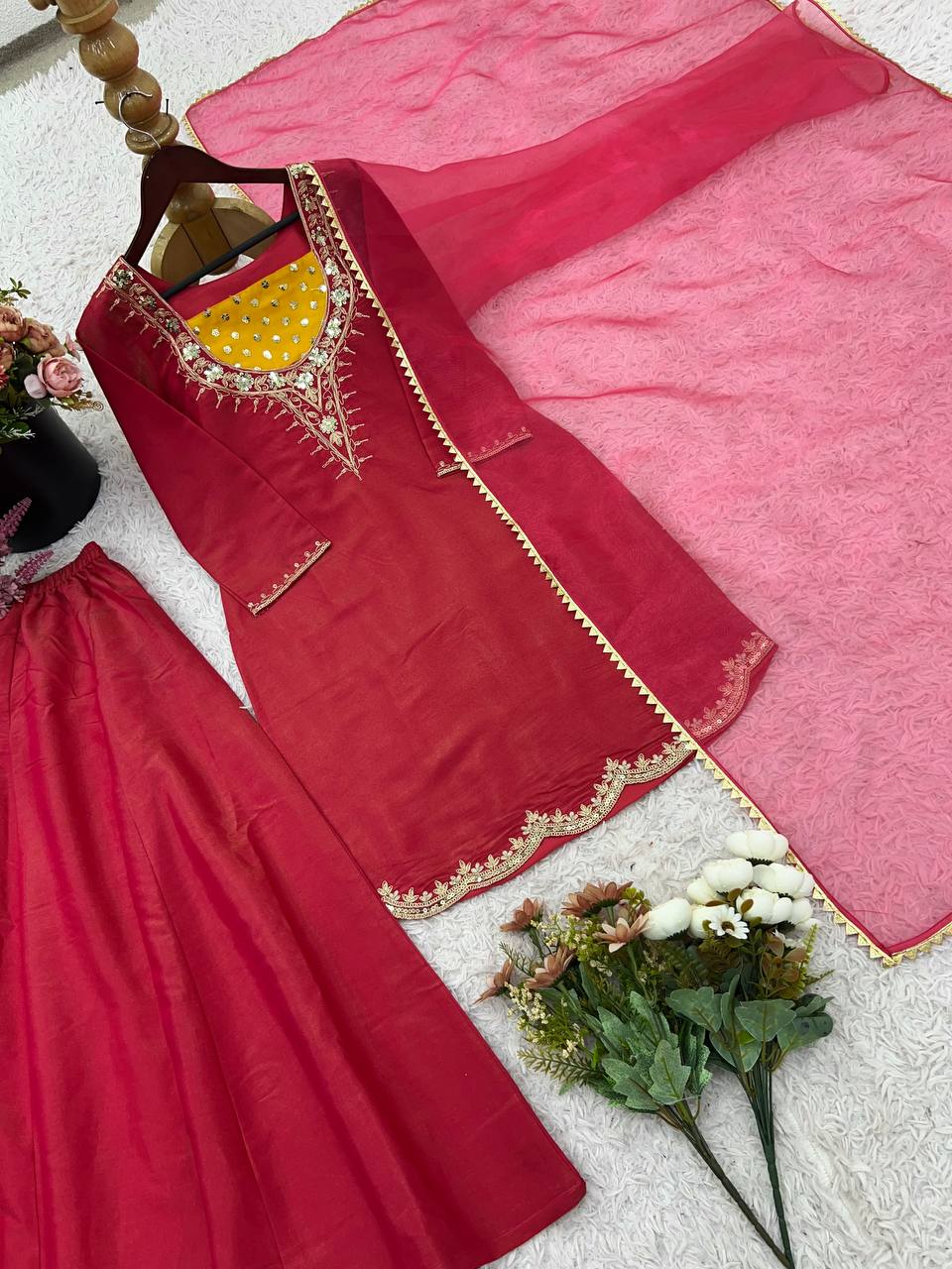 Elevate Your Festive Wardrobe With This Luxurious Ready-To-Wear 3-Piece Outfit, Crafted In Rich Heavy Simar Silk And Adorned With Delicate Embroidery. Paired With A Soft Tissue Silk Dupatta And Matching Plazzo Pants, This Ensemble Is A Perfect Blend Of Elegance And Comfort For Any Traditional Celebration.