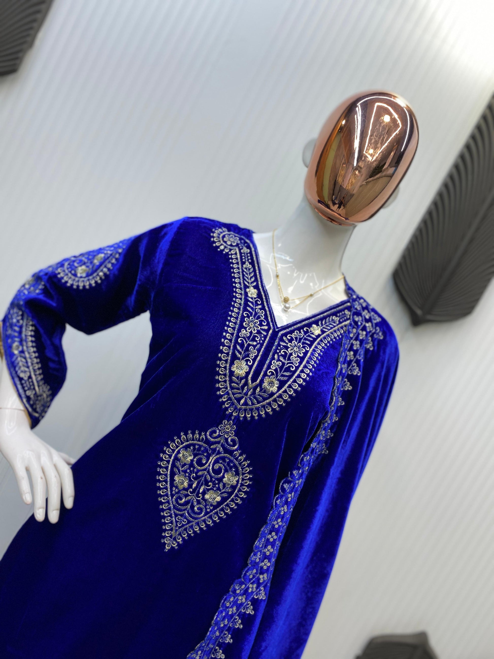 Ceremony Wear Royal Blue Color Velvet With Embroidery Sequence Work And Piping On Sleeves Designer Salwar Suit