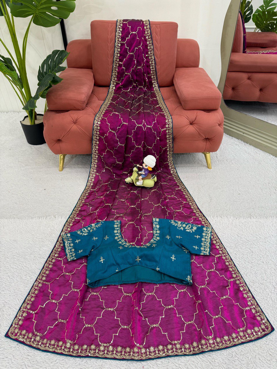 Make A Statement In This Beautiful Designer Saree Crafted From Premium Jimmy Chu Fabric. The Saree Is Adorned With Elegant Thread And Sequin Embroidery, Highlighted By Delicate Piping All Over The Drape For A Luxurious Finish.
