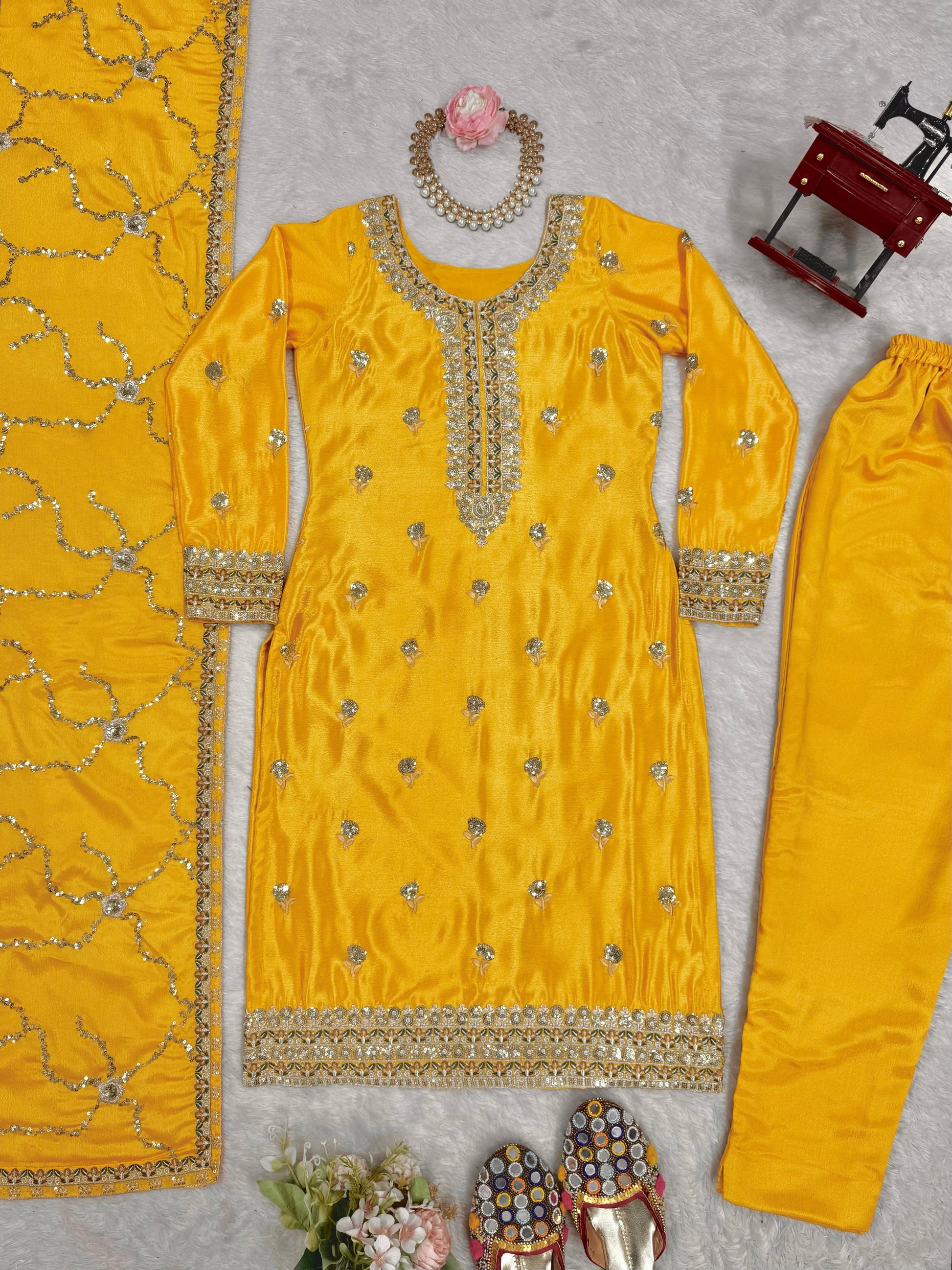 Ceremony Wear Yellow Color Chinon Silk And Thread With Sequence Work Beautiful Salwar Suit