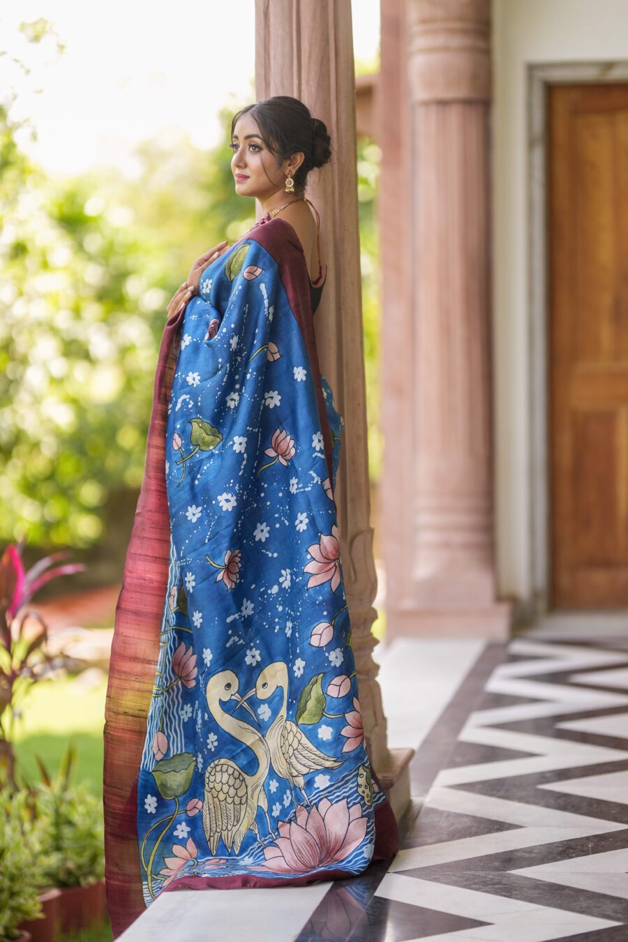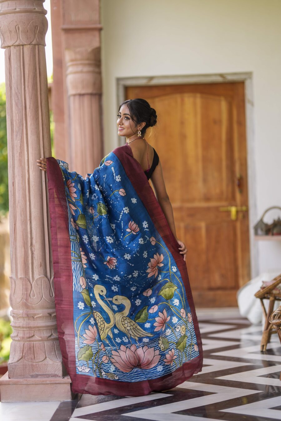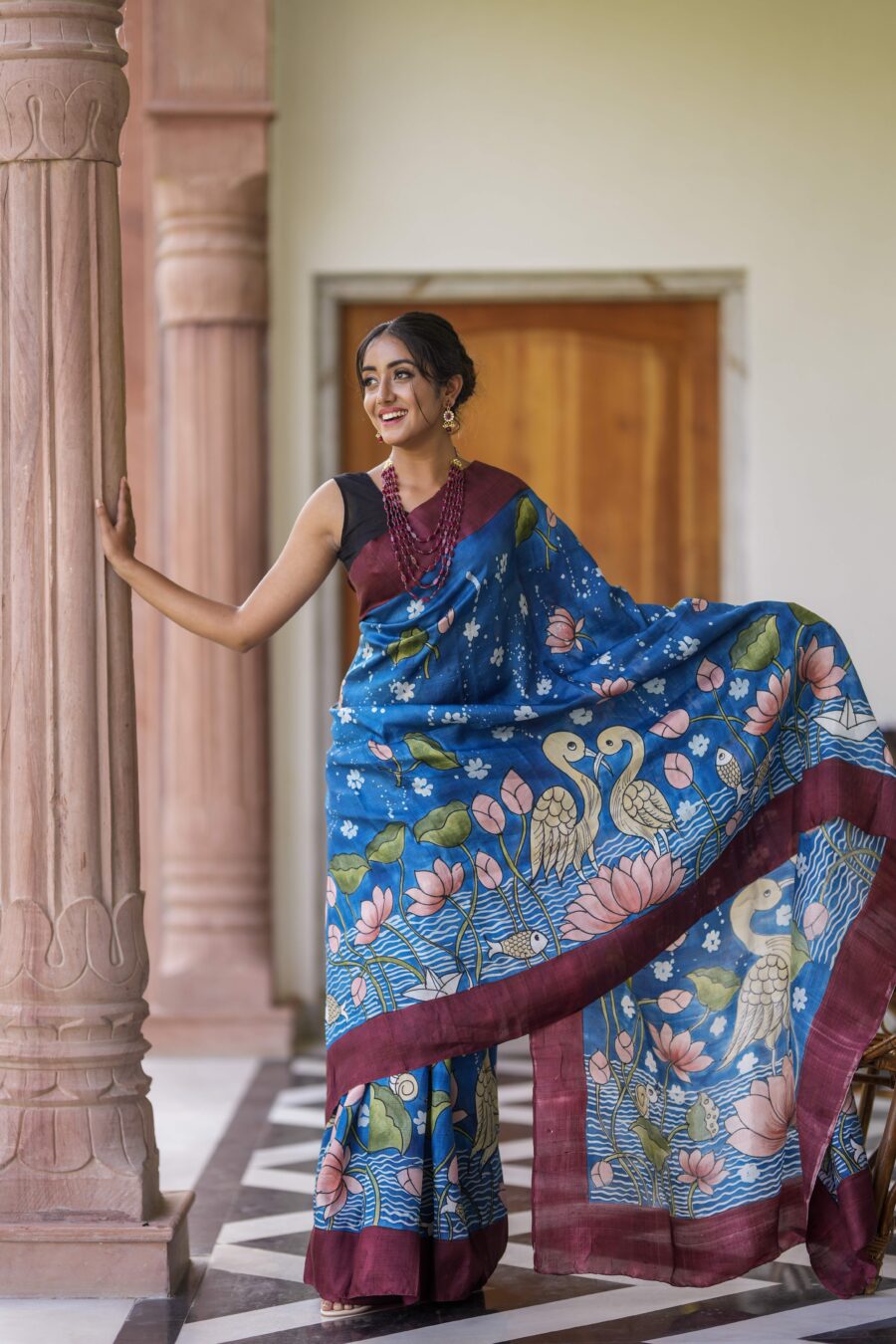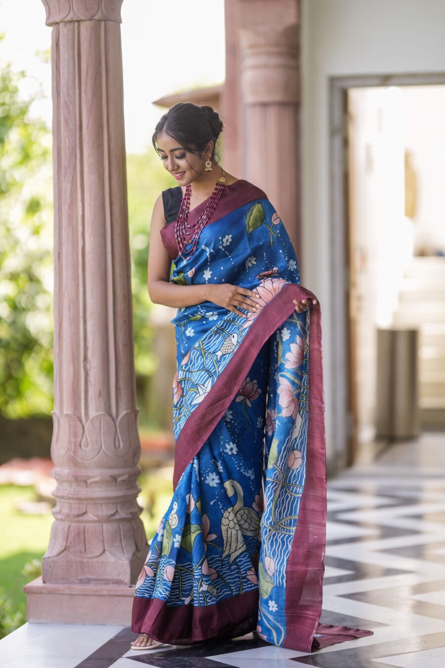Classic Blue Color Color Pure Cotton Lilen With Digital Printed Designer Saree