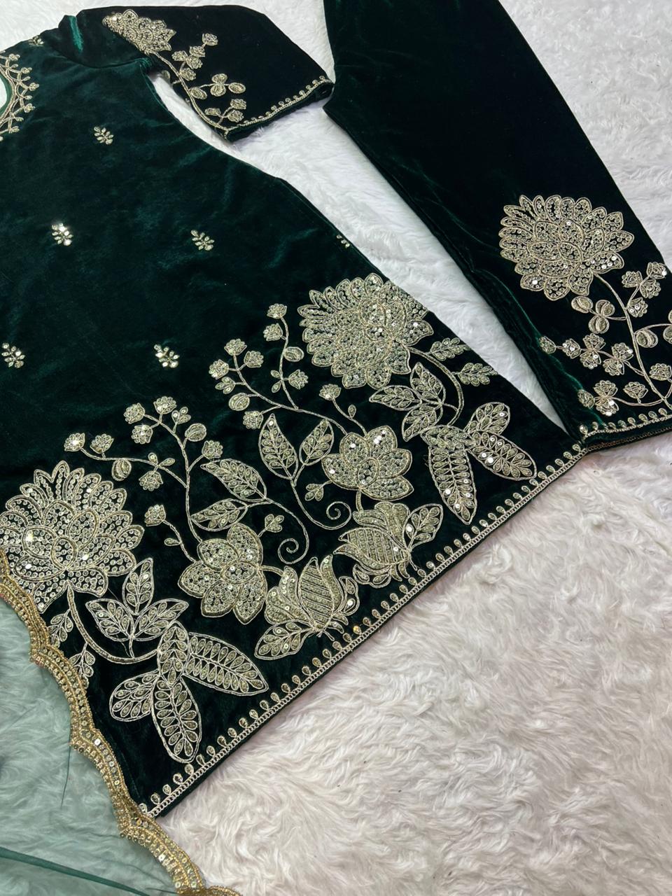 Classic Green Color Pure Heavy Viscose Velvet With Heavy Embroidery Coding Sequence Work Salwar Suit