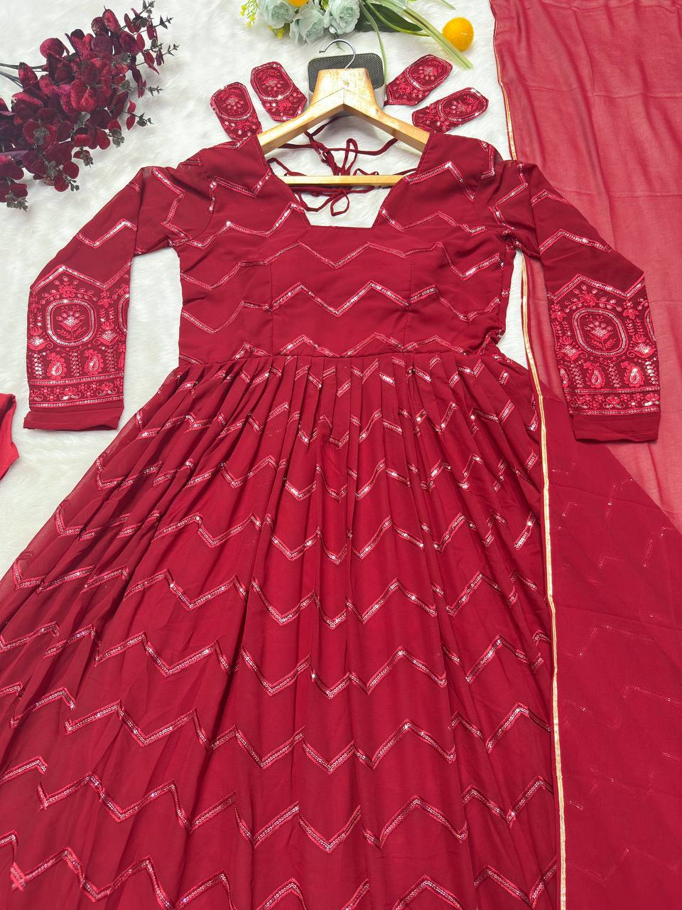 Classic Maroon Color Faux Georgette Fabric With All Over Embroidery Work Anarkali Suit