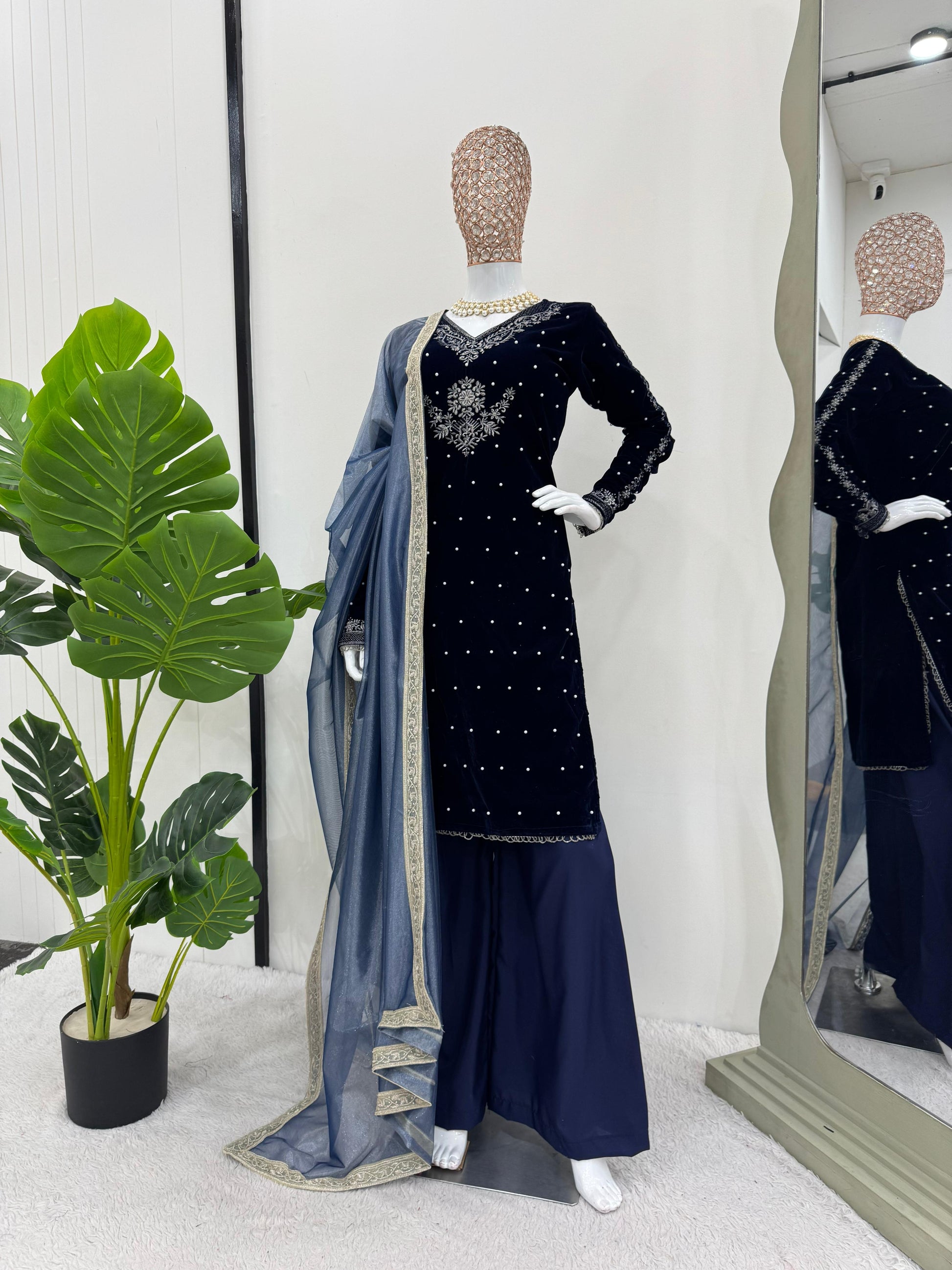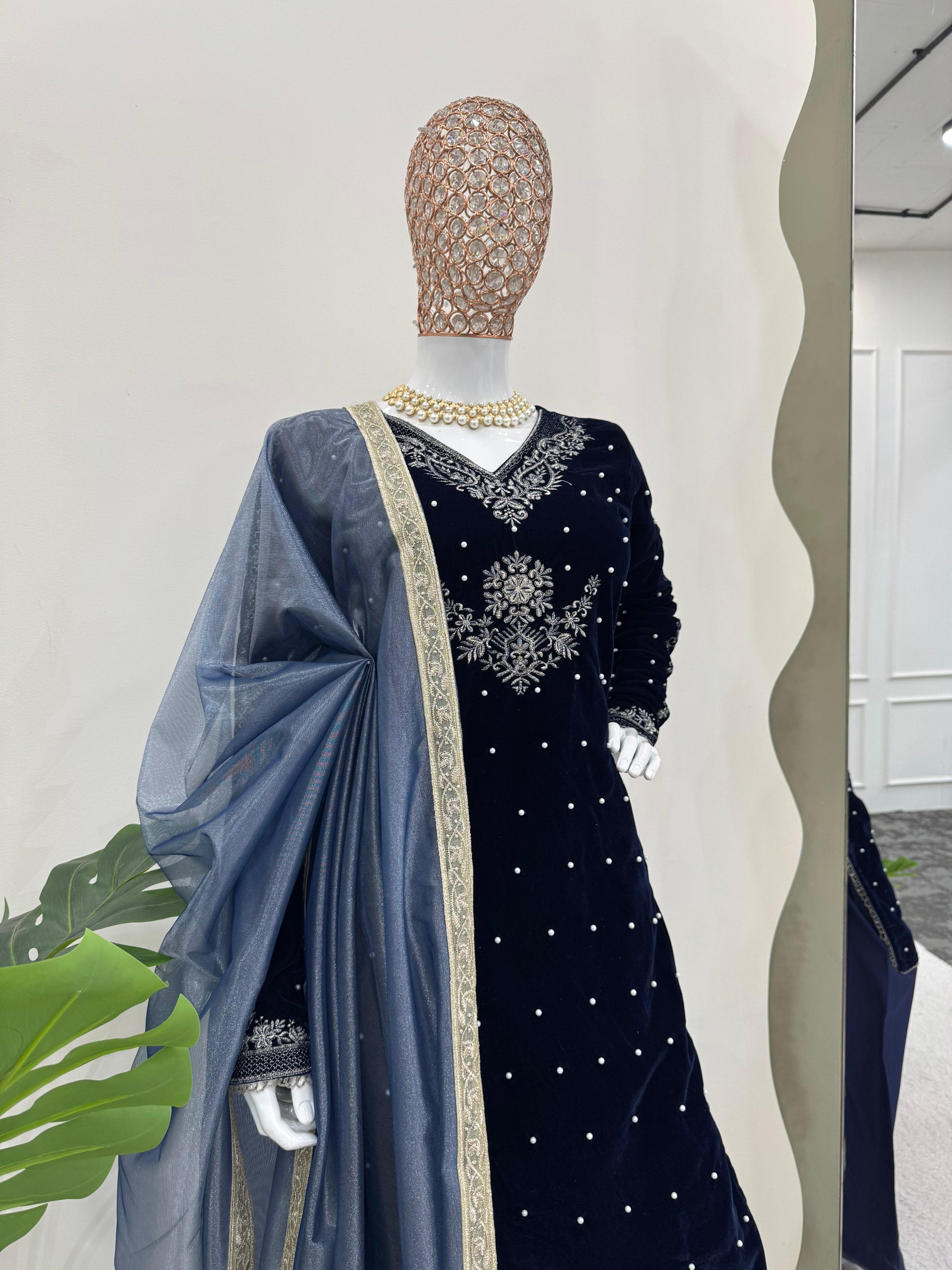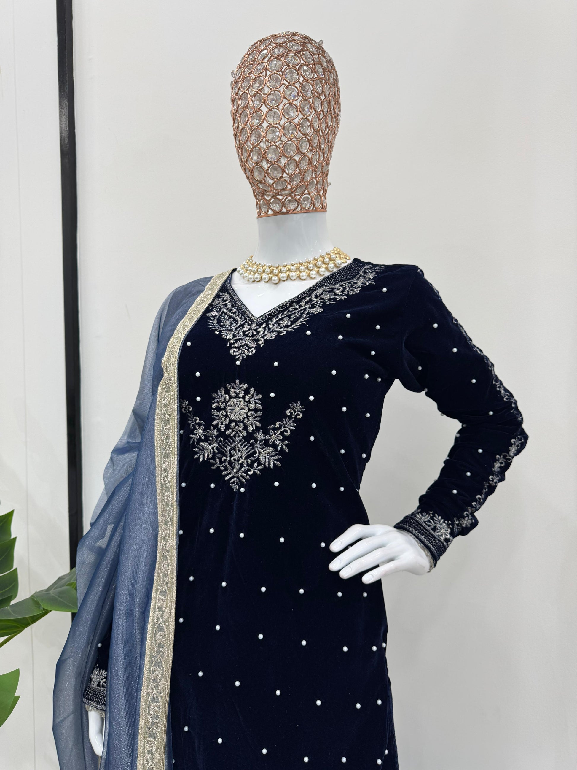 Classic Navy Blue Color Viscos Velvet Thread With Rivet Moti Work Designer Salwar Suit
