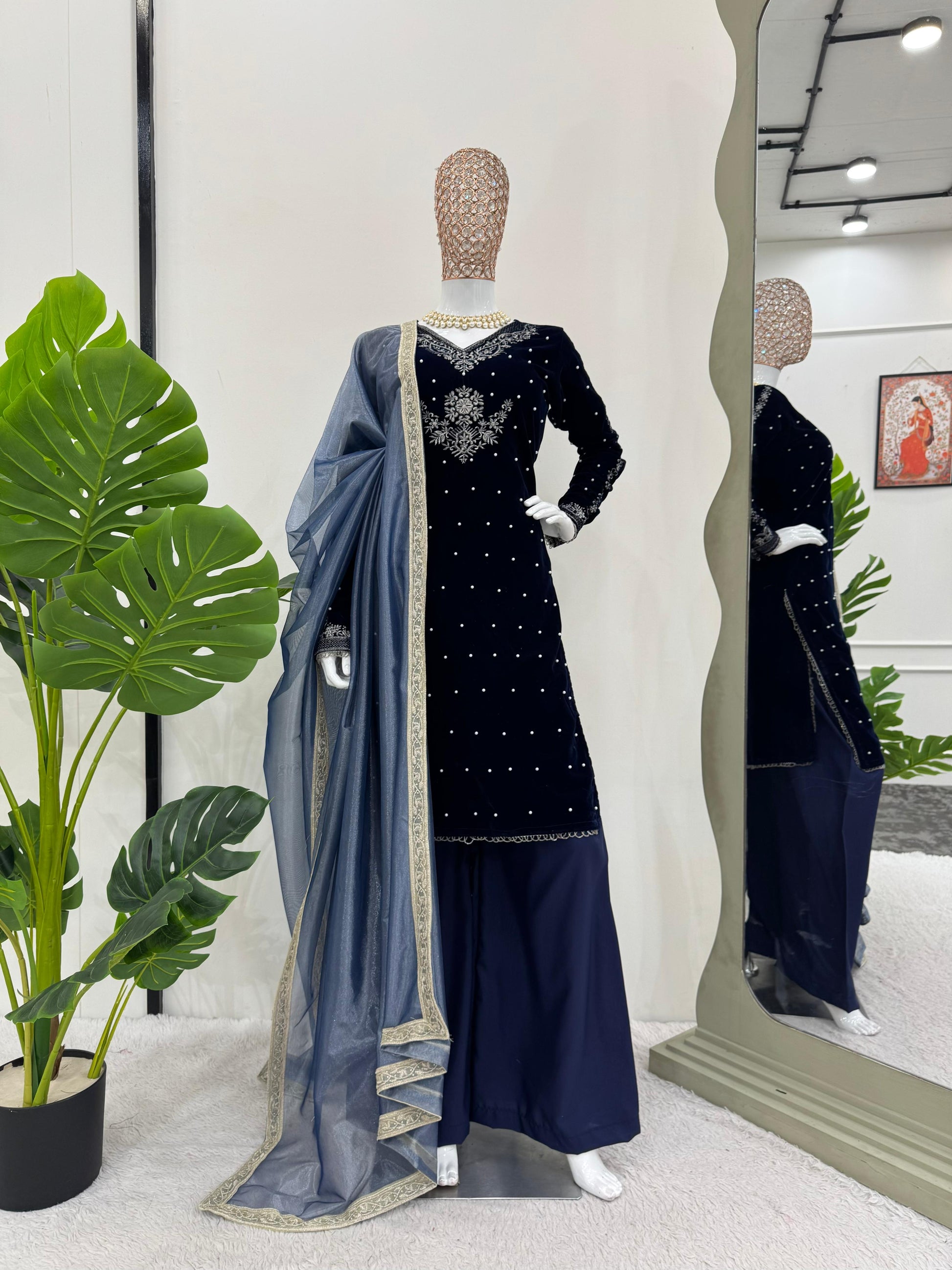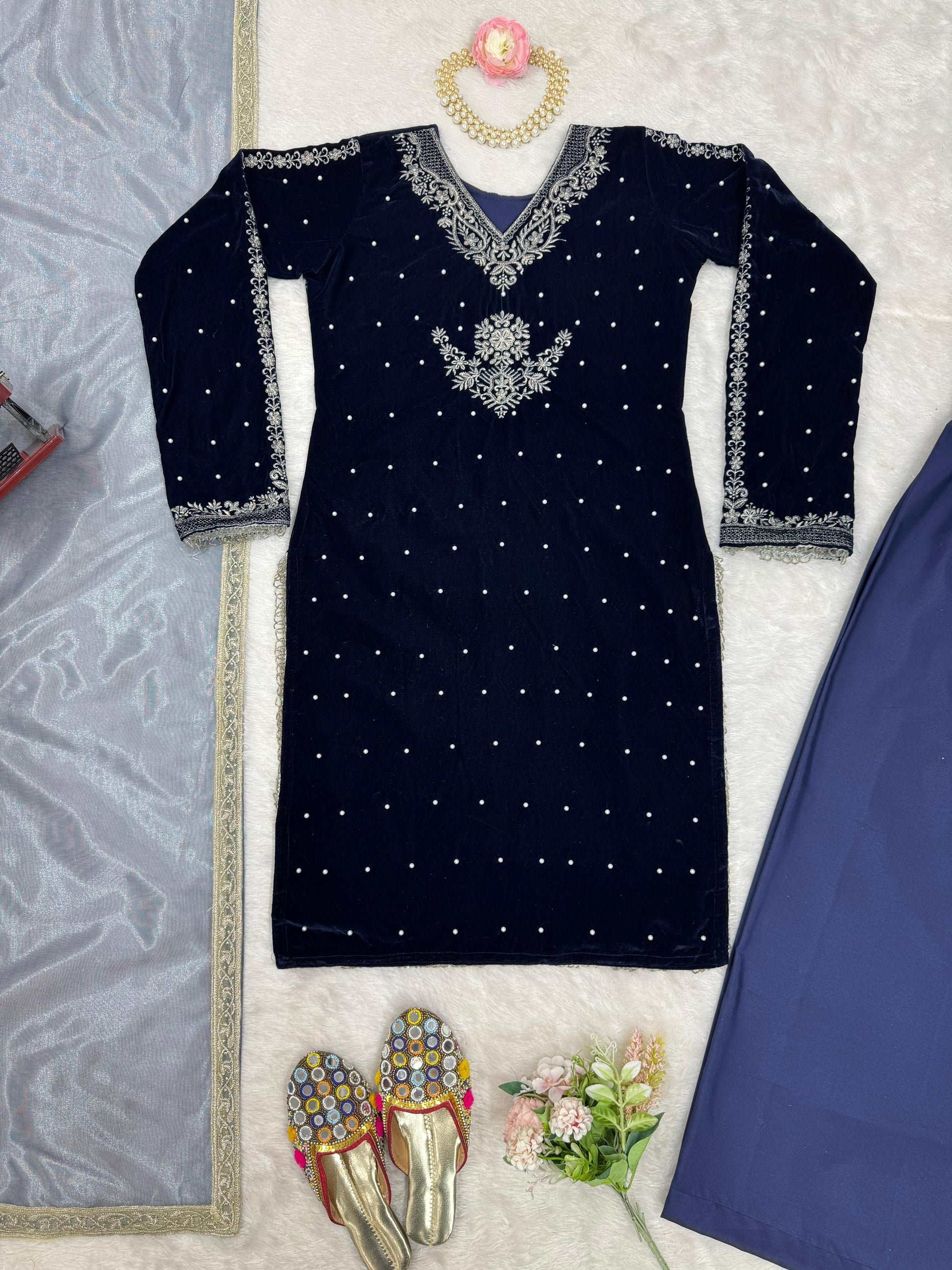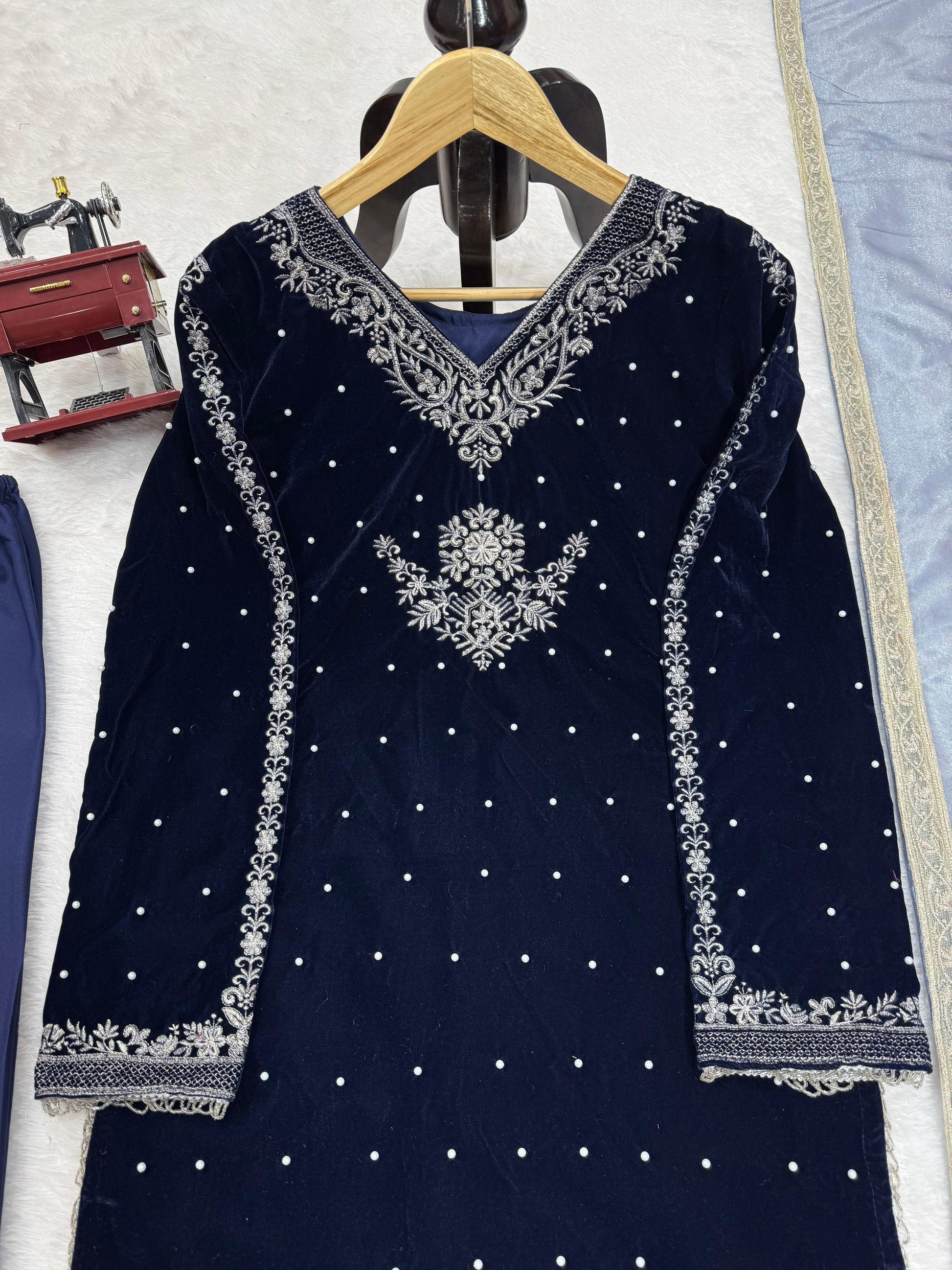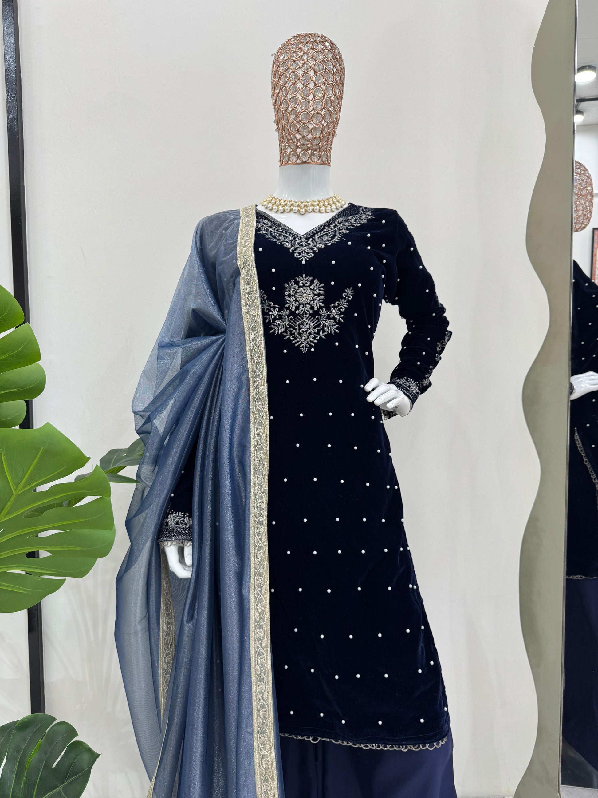 Classic Navy Blue Color Viscos Velvet Thread With Rivet Moti Work Designer Salwar Suit