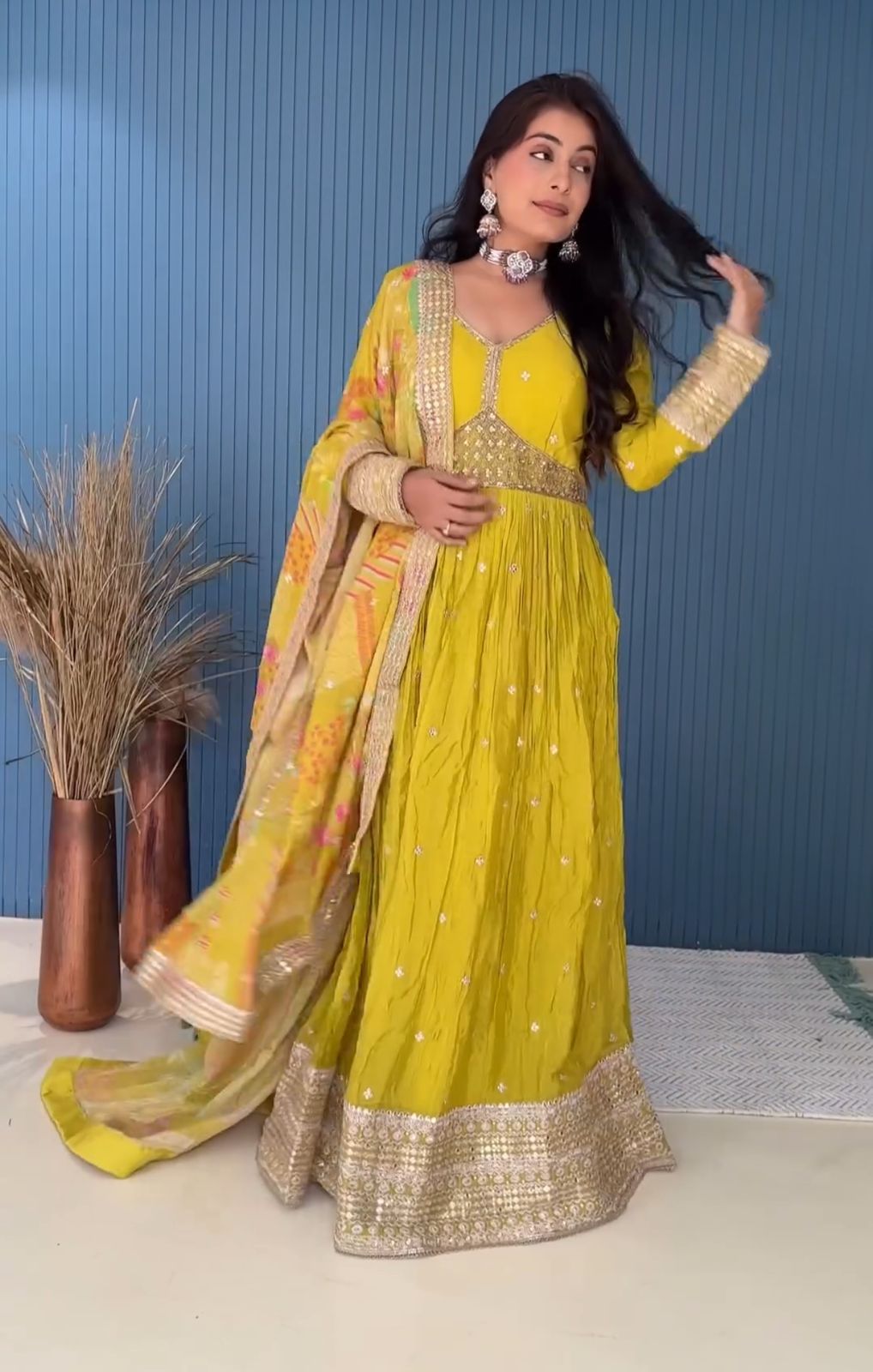 Classic Pure Chinon Silk Haldi Special Yellow Color Designer Gown