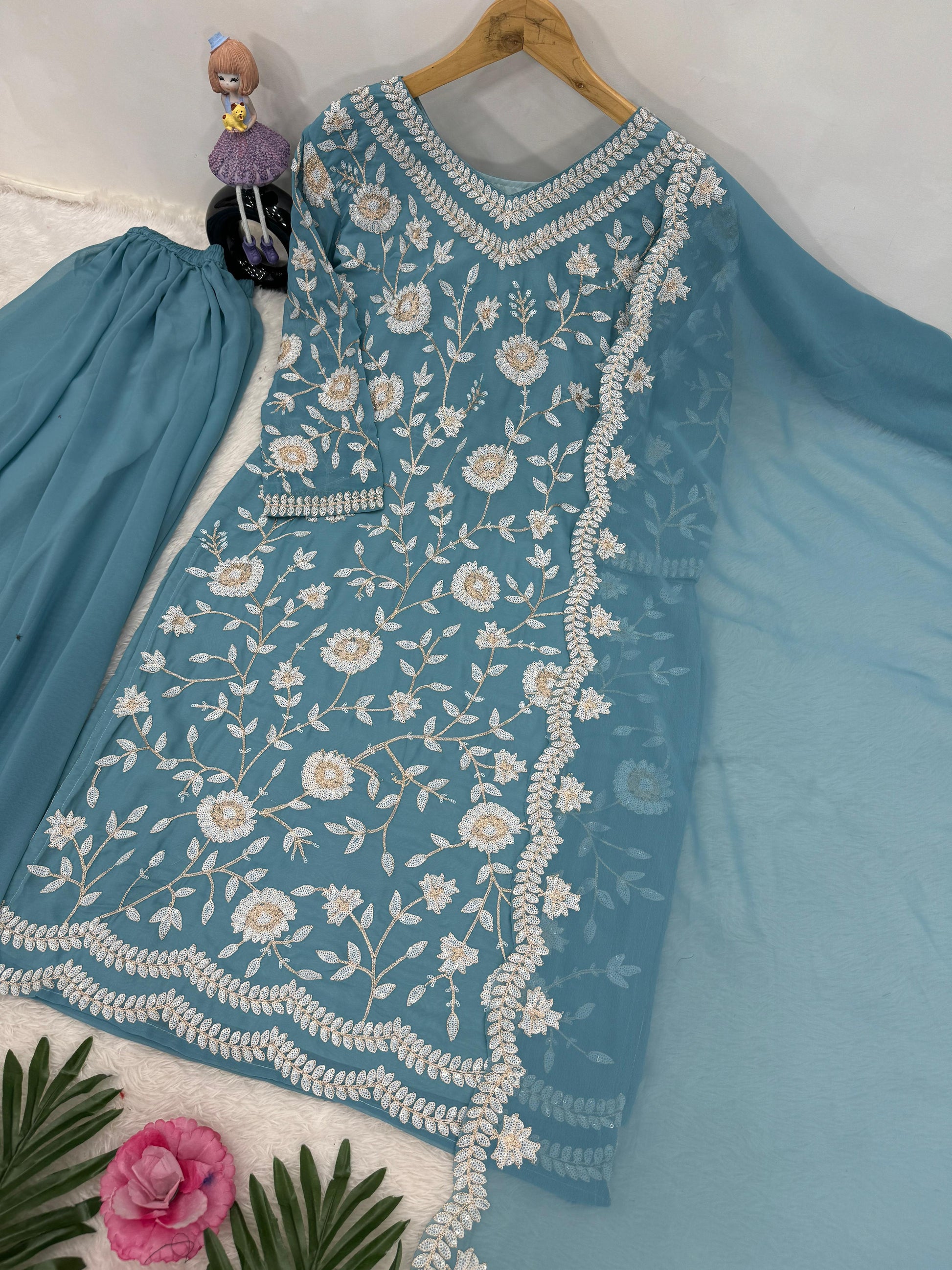 Demanding Sky Blue Color Heavy Fuax Georgette Party Wear Plazzo Suit