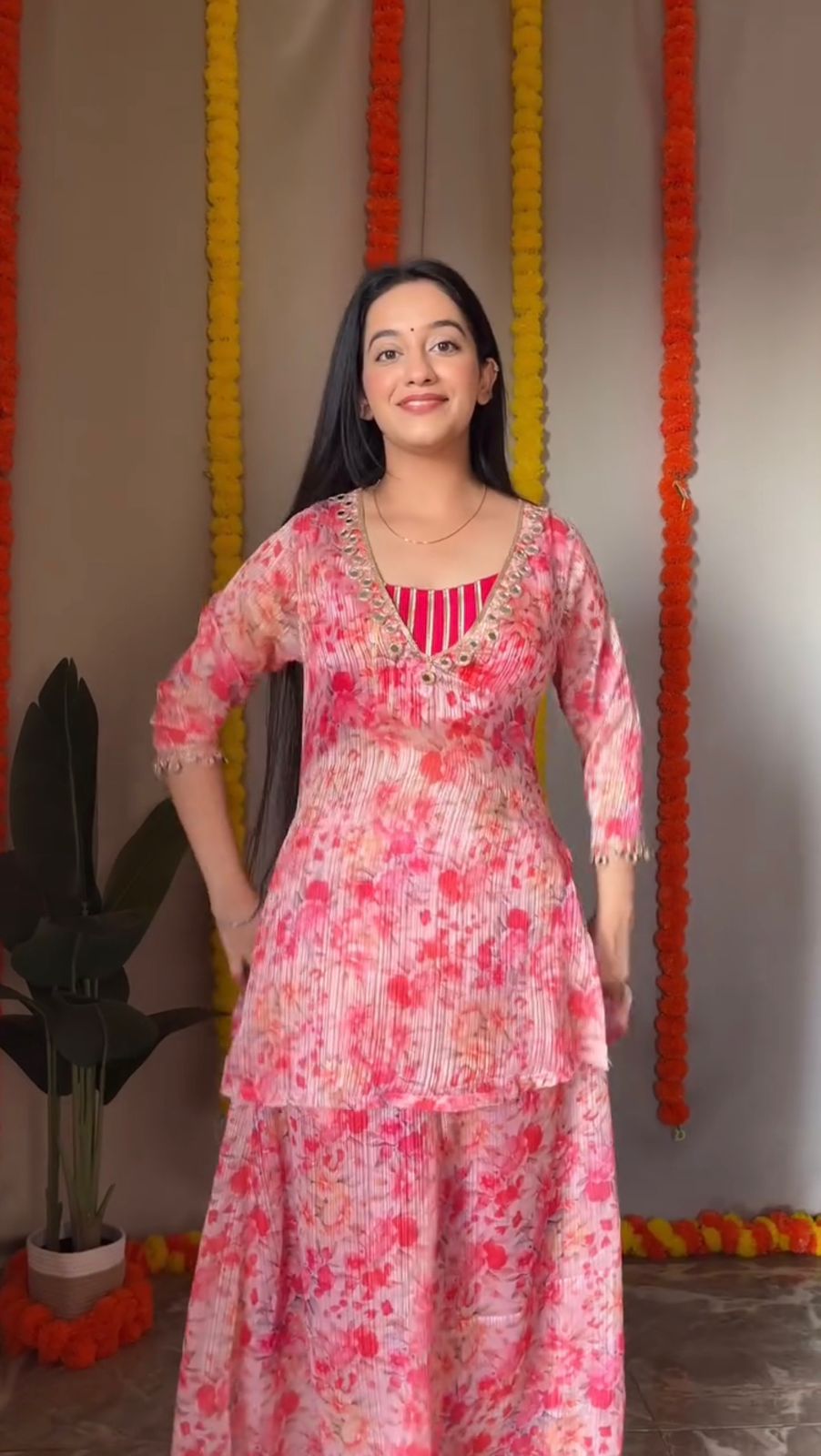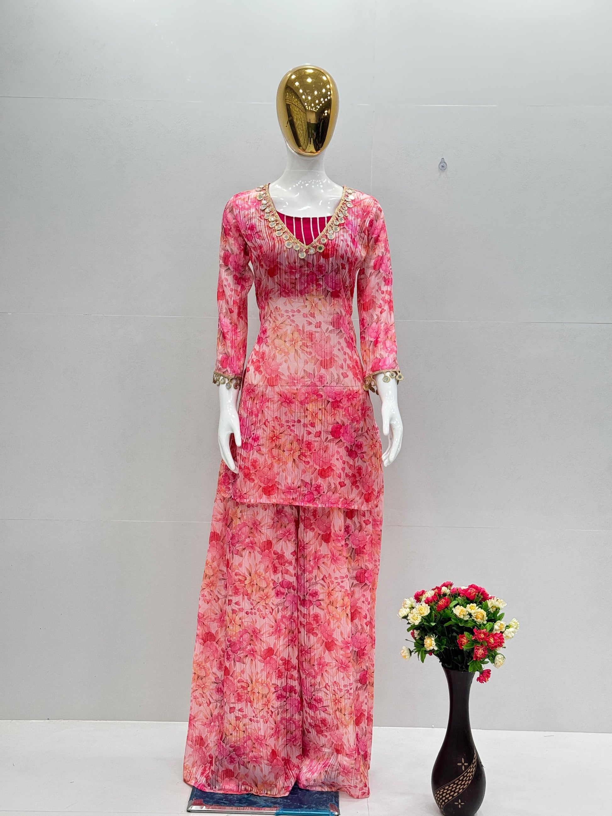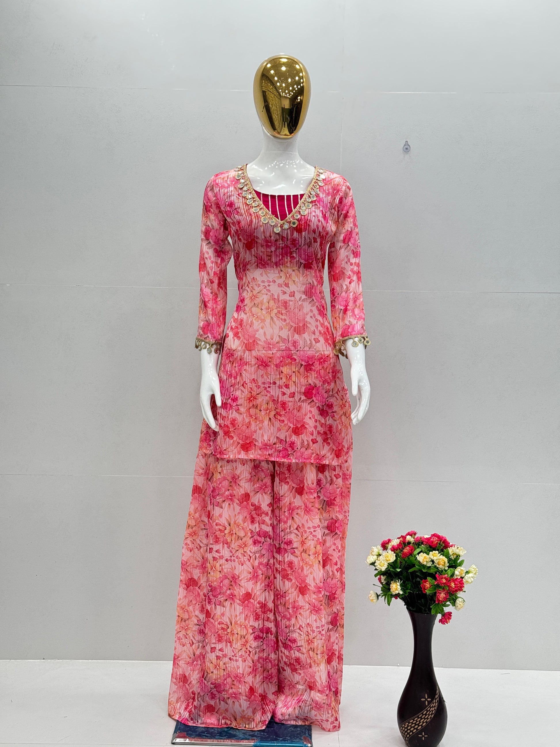 Designer Baby Pink Color Digital Print With Real Mirror Work Neck Beautiful Palazoo Suit