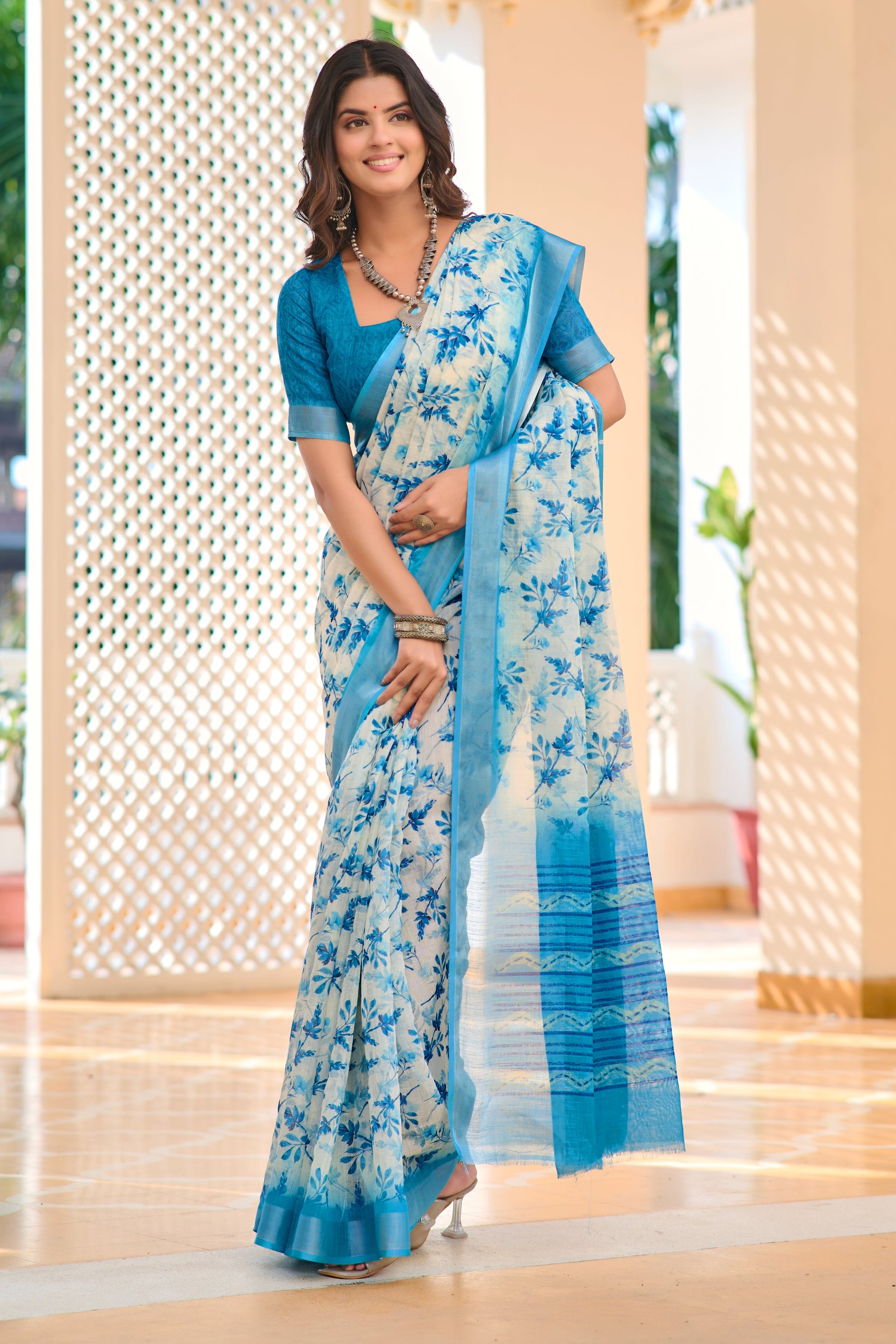 Design :- Zari Patta Pure Cotton Lilen Saree With Digital Print With Digital Blouse Pieces