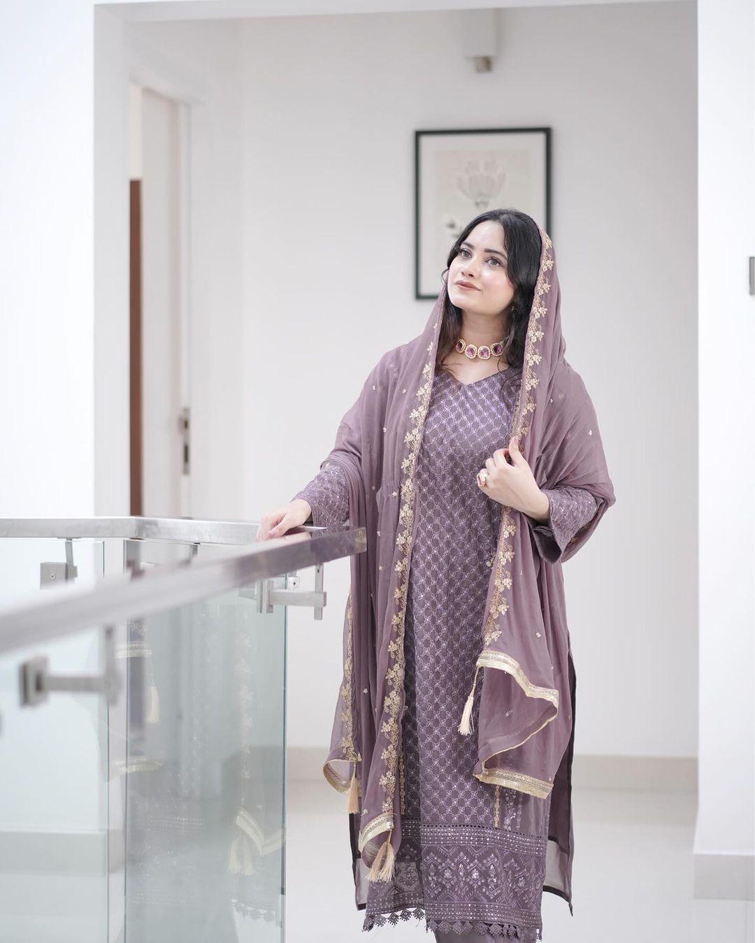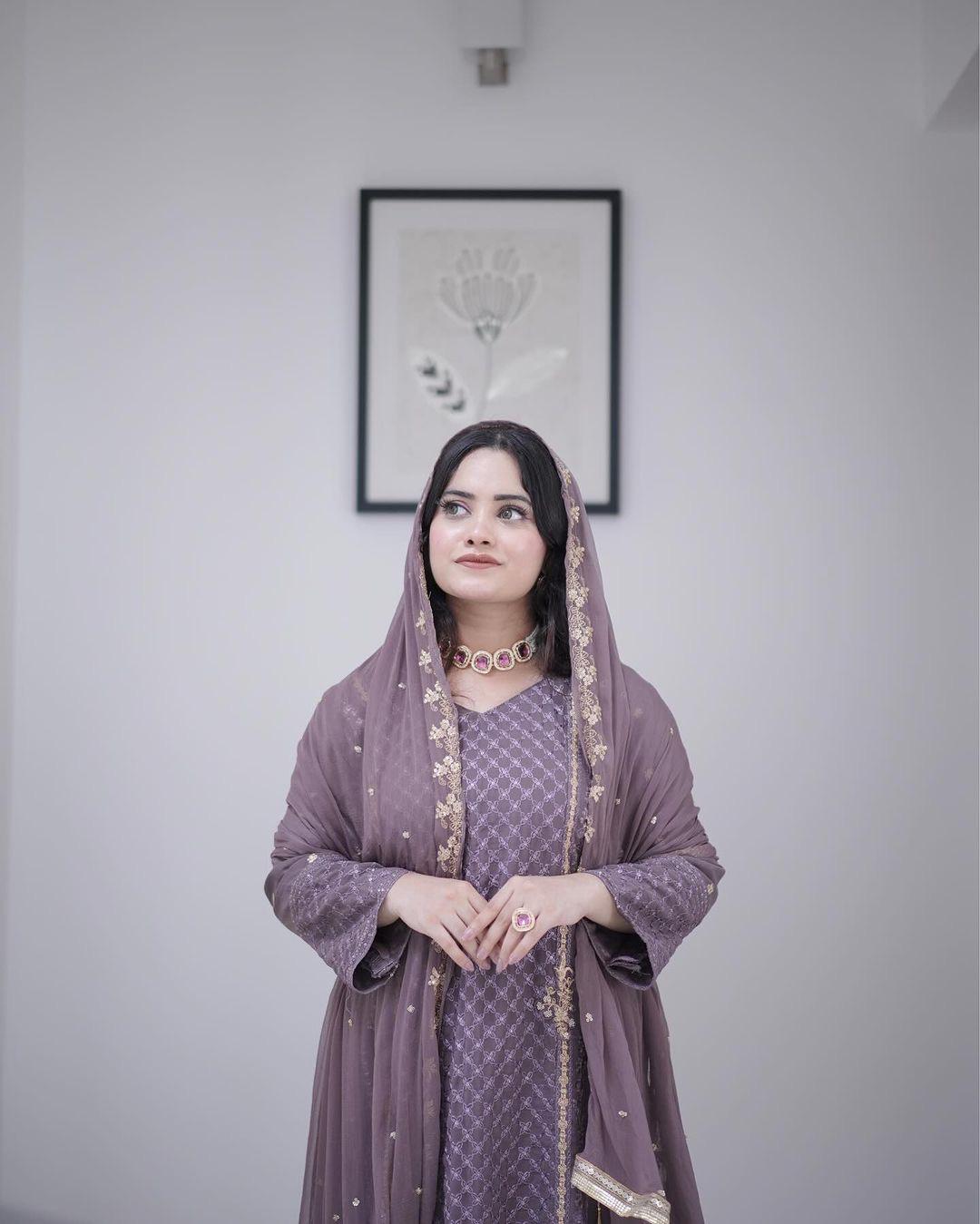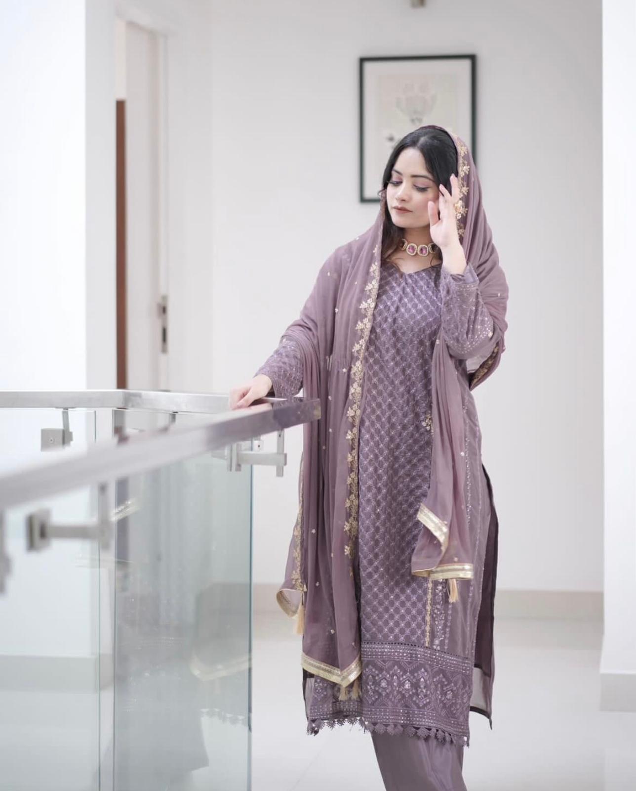 Designer Wear Georgette Embroidery Work Lavender Color Kurti Pant With Dupatta