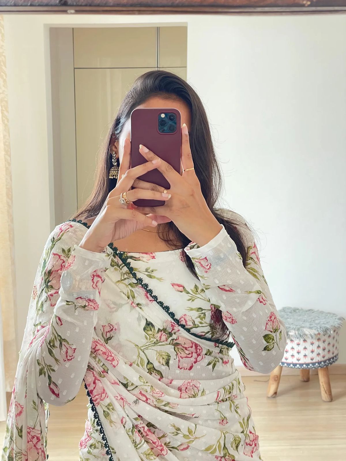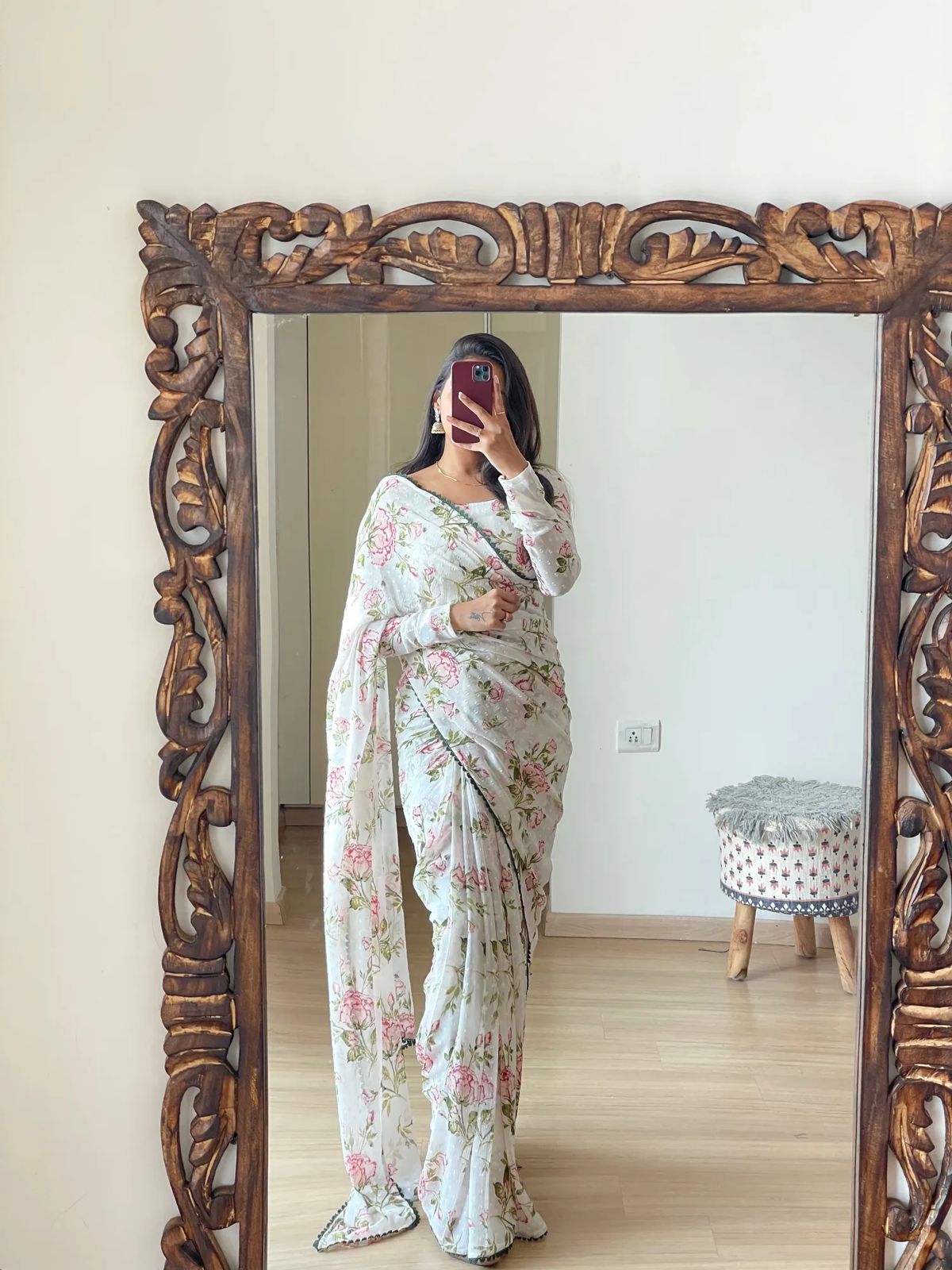 Saree Work | Digital Print With Embroidery Butti With Beautiful Lace |