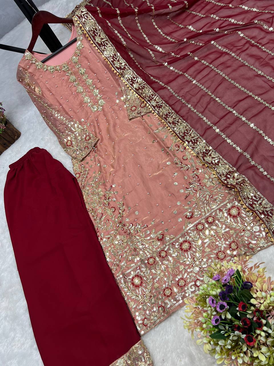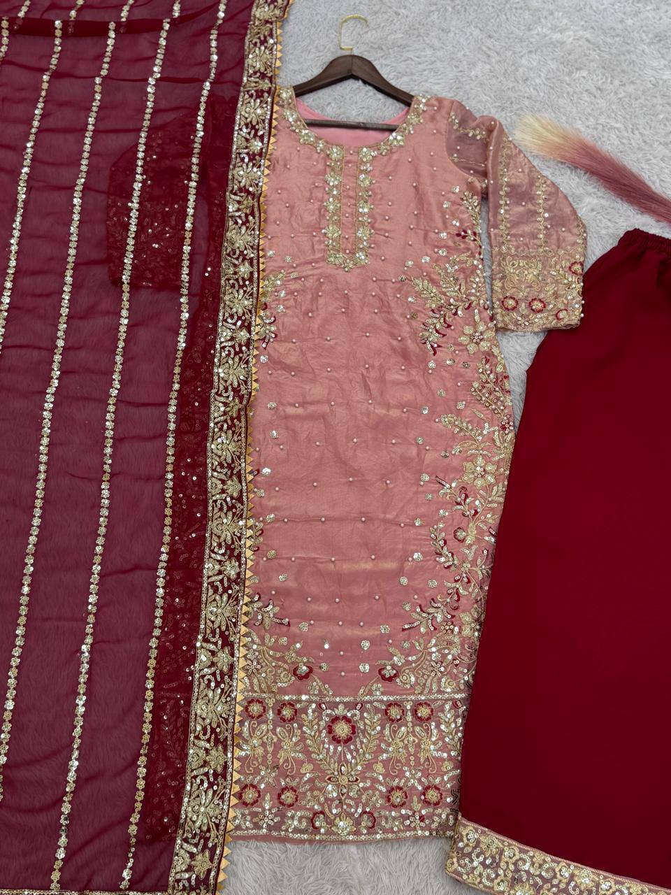 Elegant Peach Color Heavy Frendy Silk Beautiful Embroidery And Sequence Work Palazzo Suit