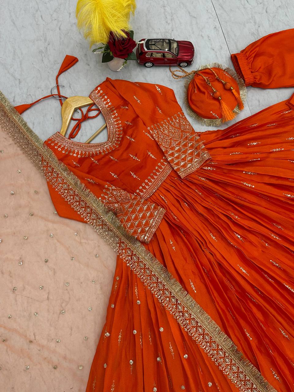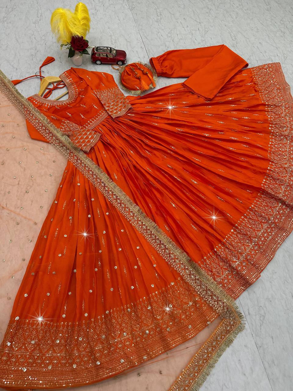 Embellished Orange Color Heavy Pure Chinon Silk Embroidery Sequence Work Gown