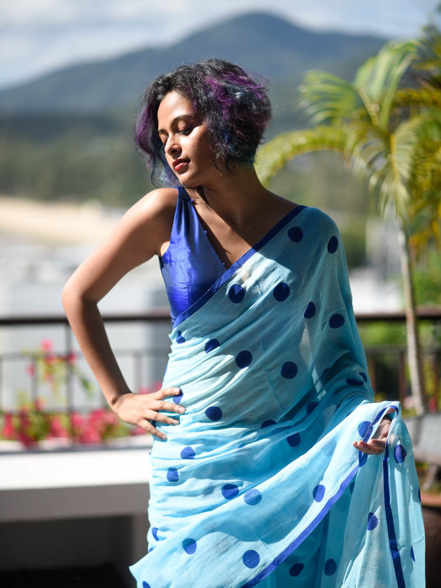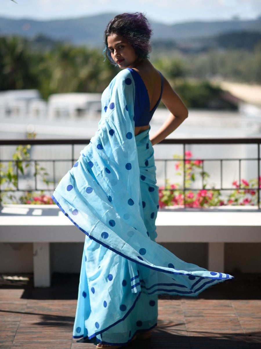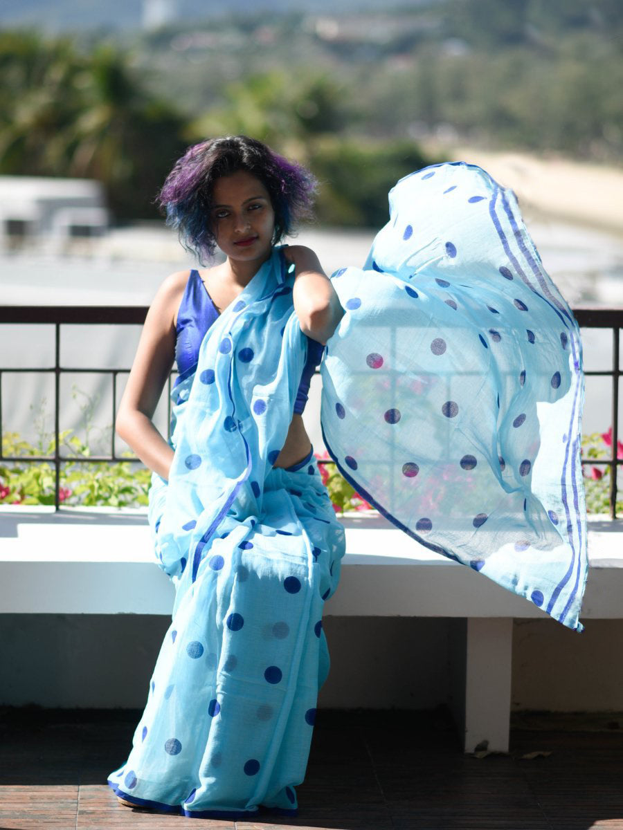 Embellished Sky Blue Color Pure Cotton Lilen With Digital Printed Designer Saree