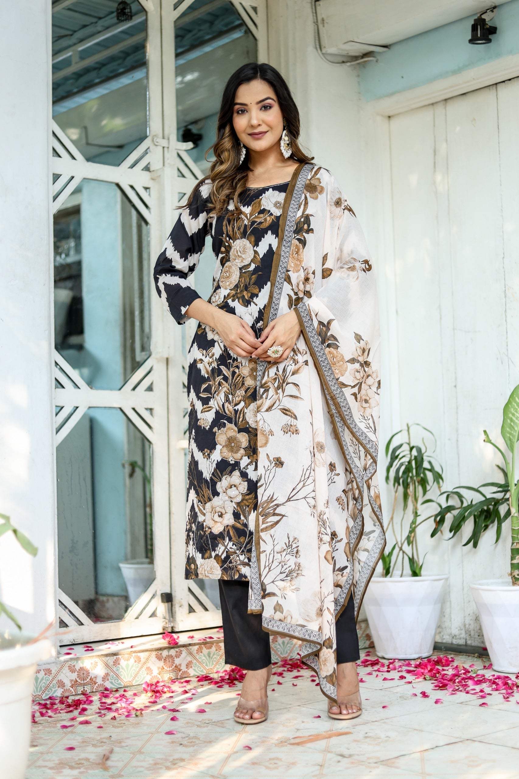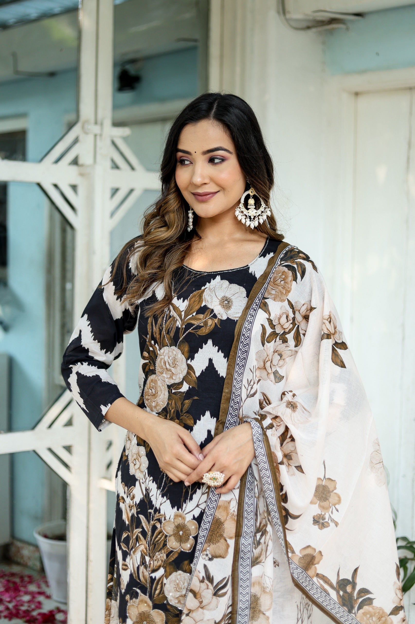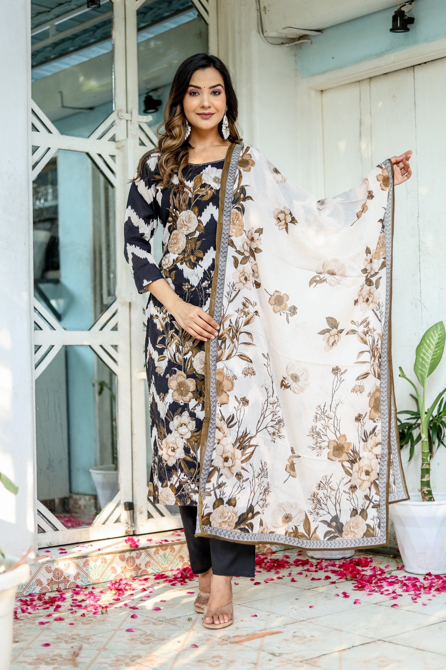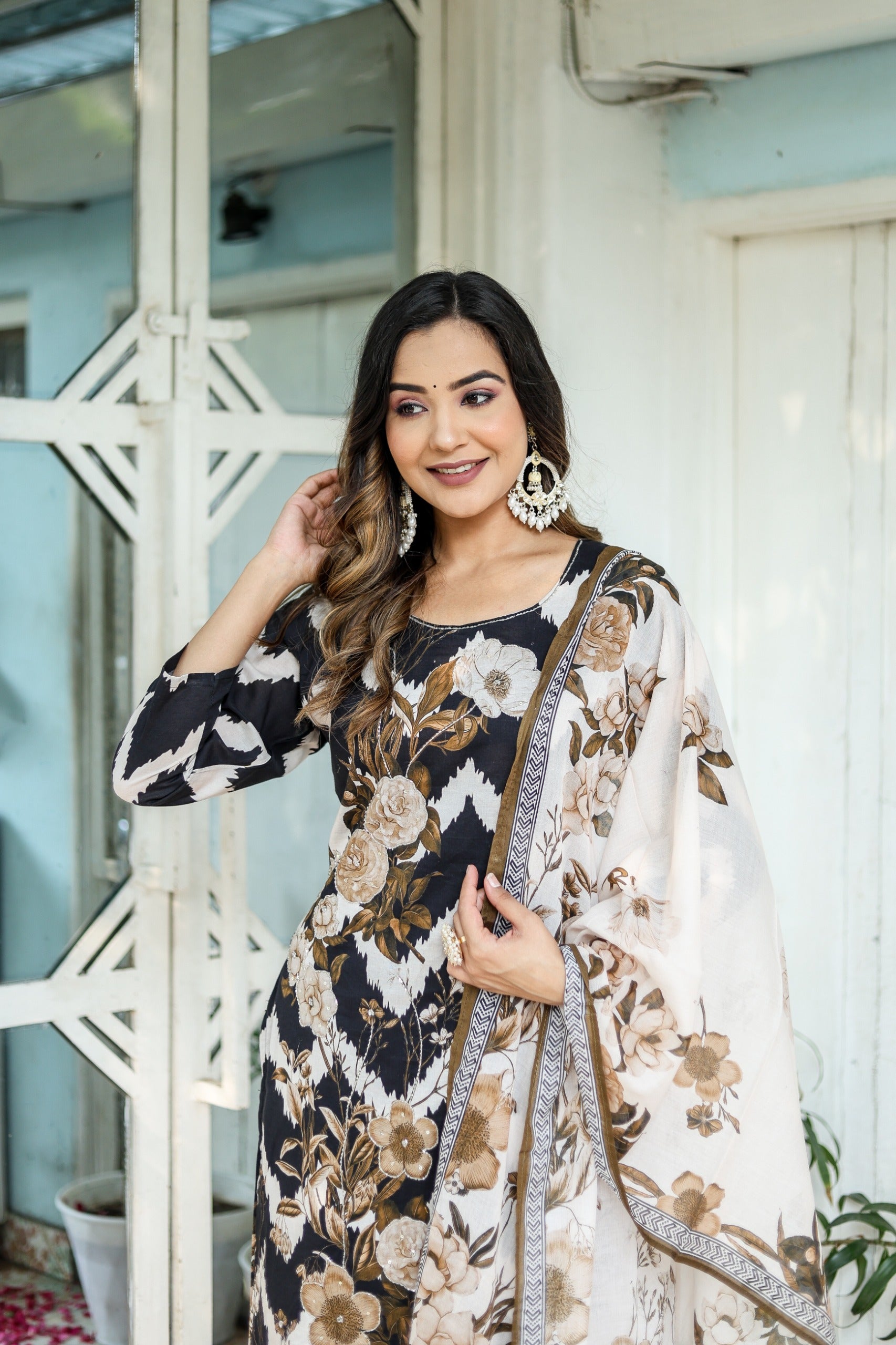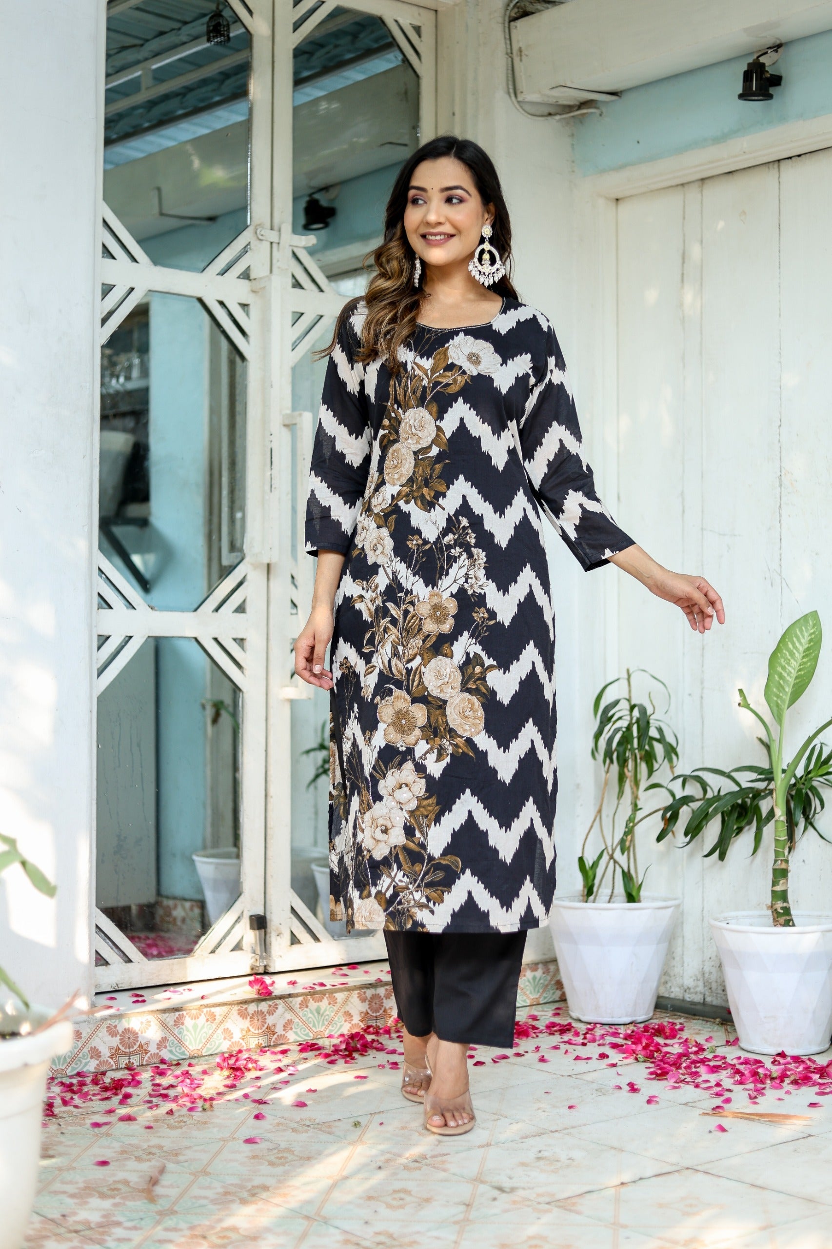 Exclusive Black Color Cotton Hand Work Zig Zac Pattern Kurti Set With Dupatta