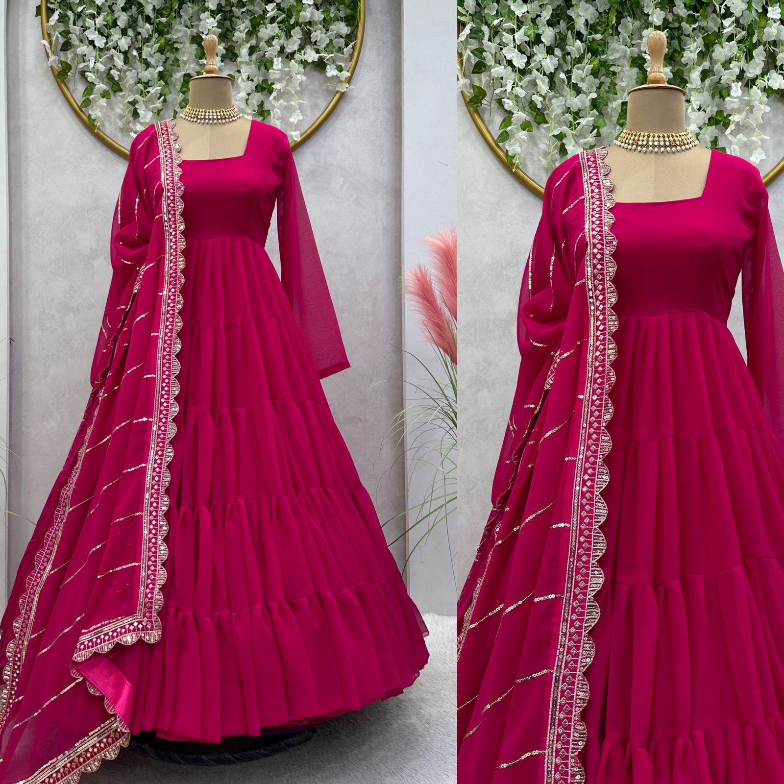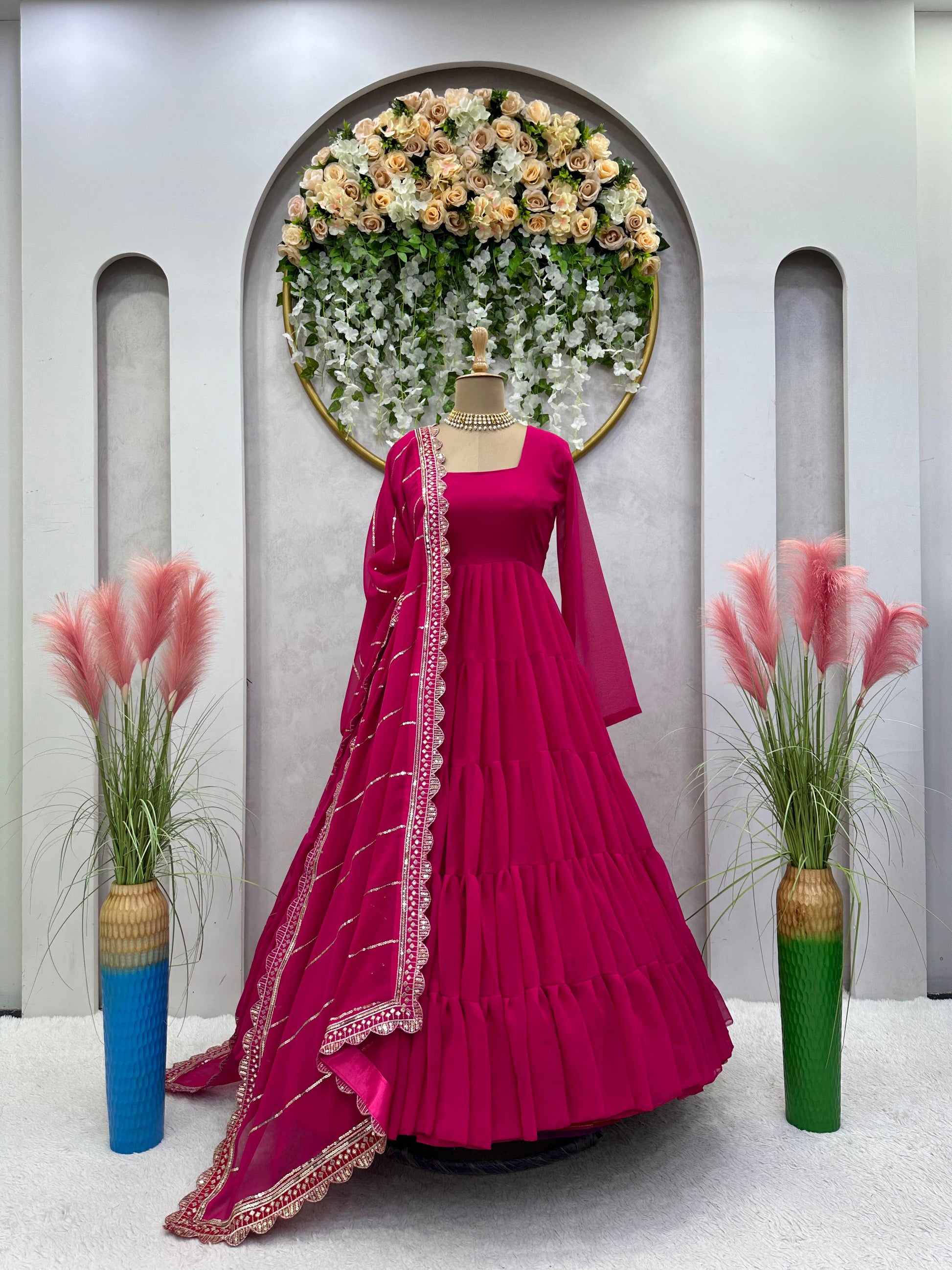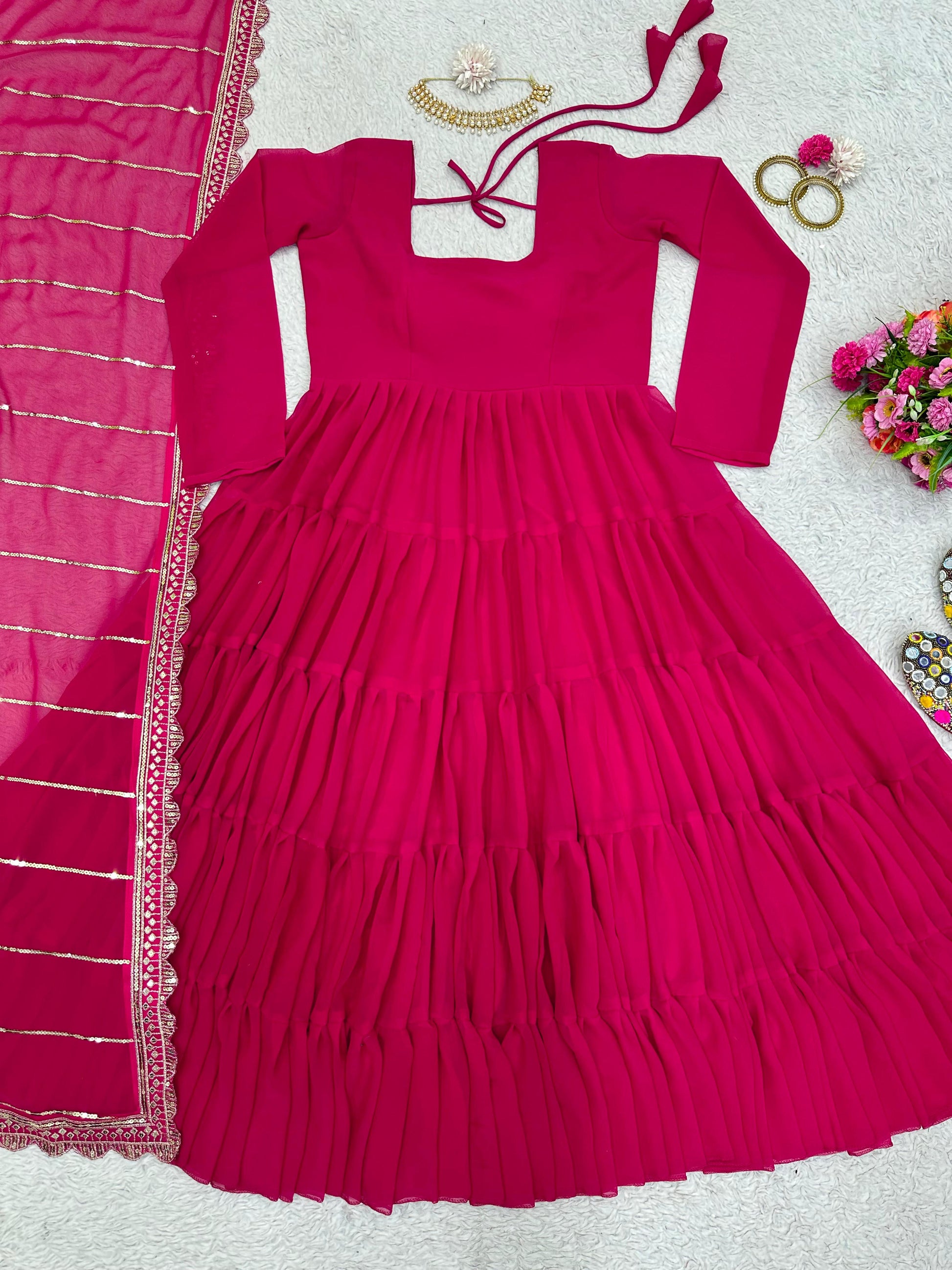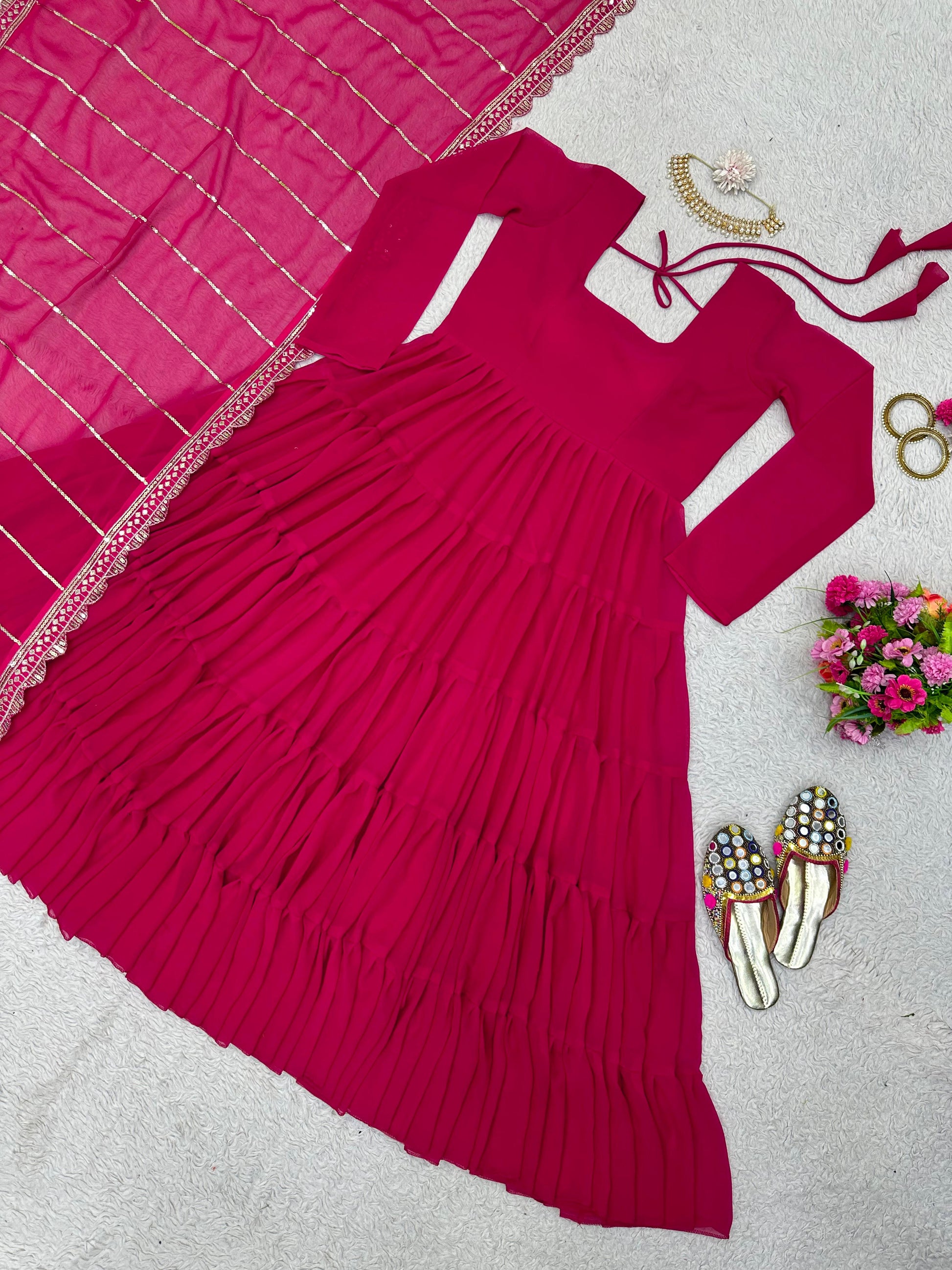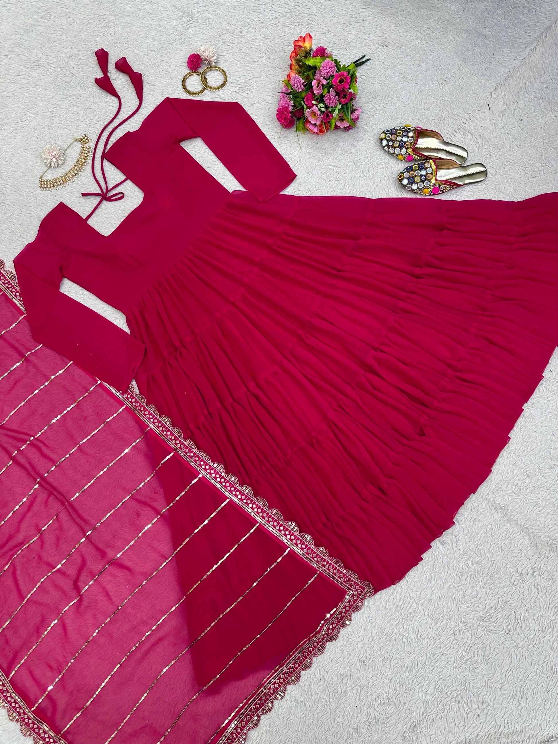 Fabulous Dark Pink Color Ruffle Gown With Work Dupatta