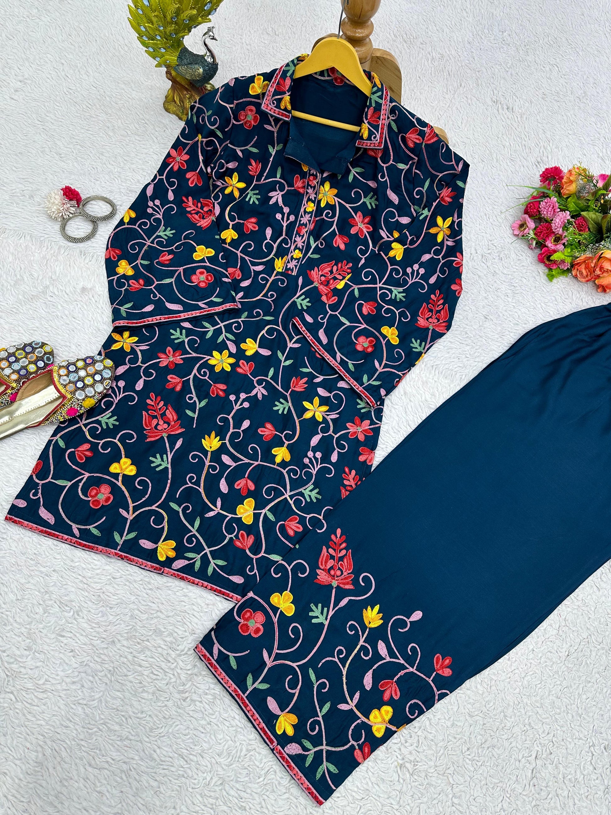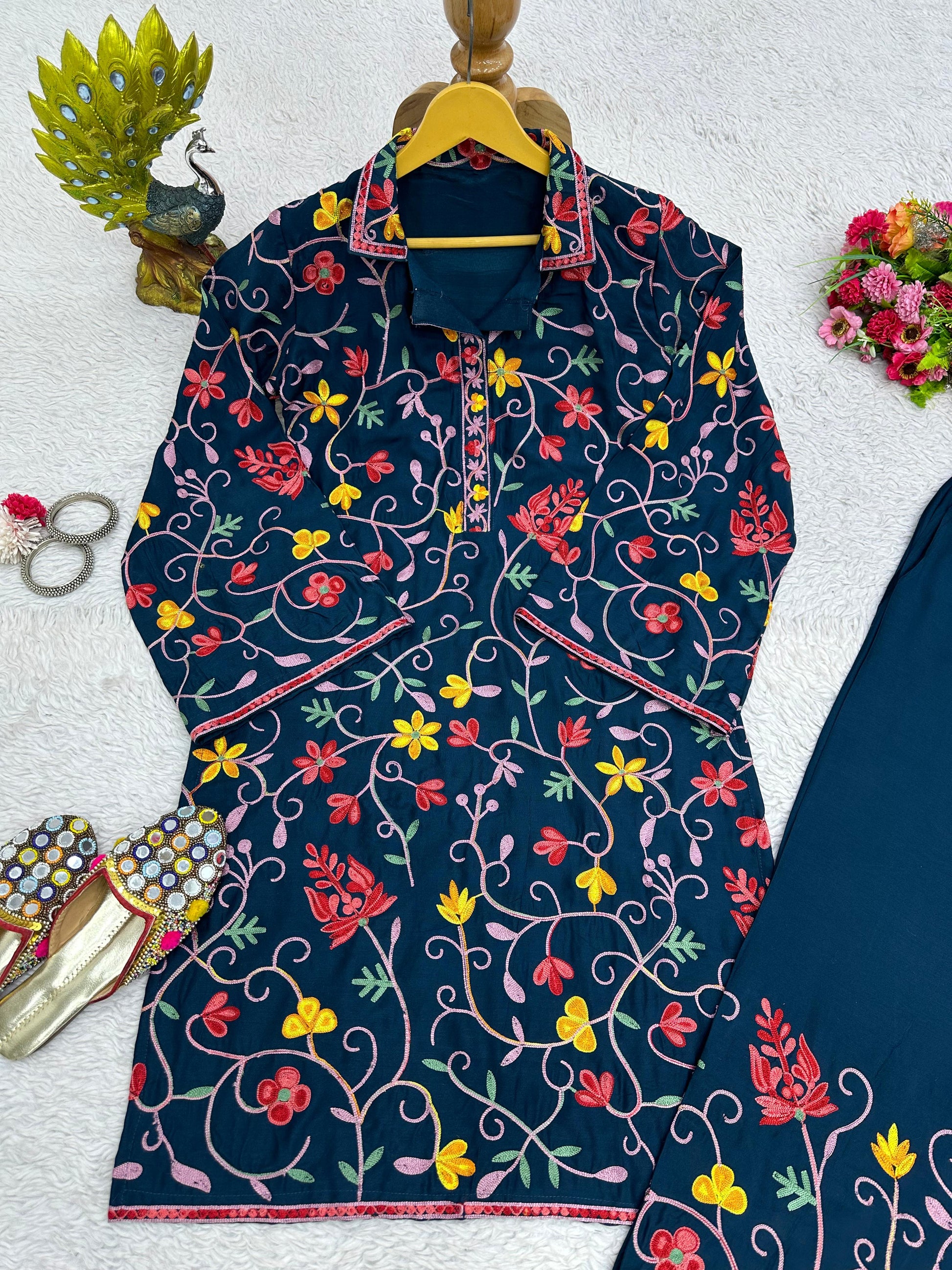 Fabulous Navy Blue Color Thread Chain Work Kurti With Pant