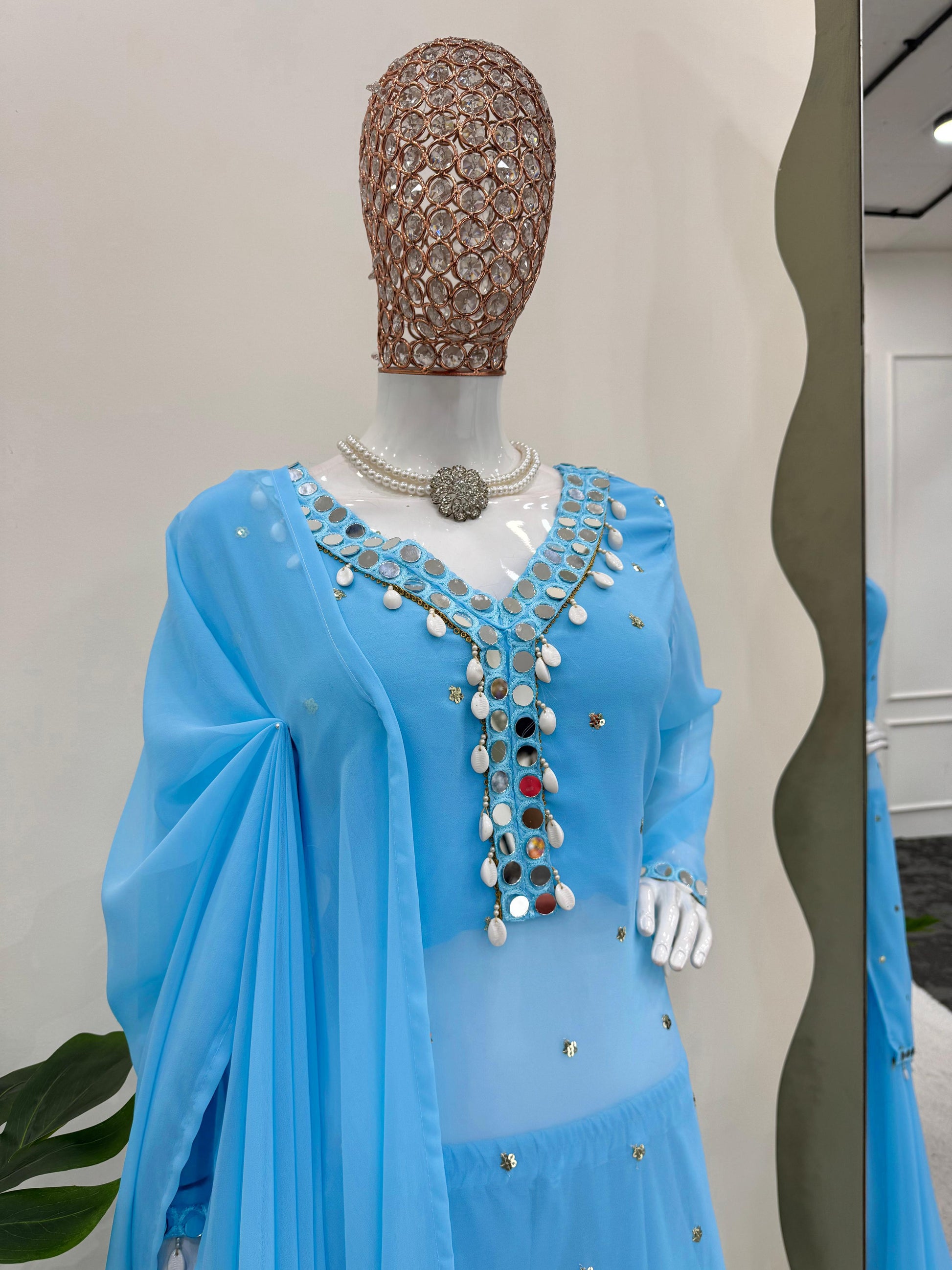 Fabulous Sky Blue Color Faux Georgette Thread With Sequence And Real Mirror Work Palazzo Suit