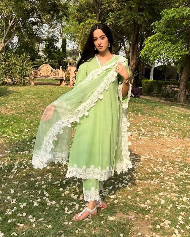 Fantastic Chain Stitch Work Green Color Palazzo Suit