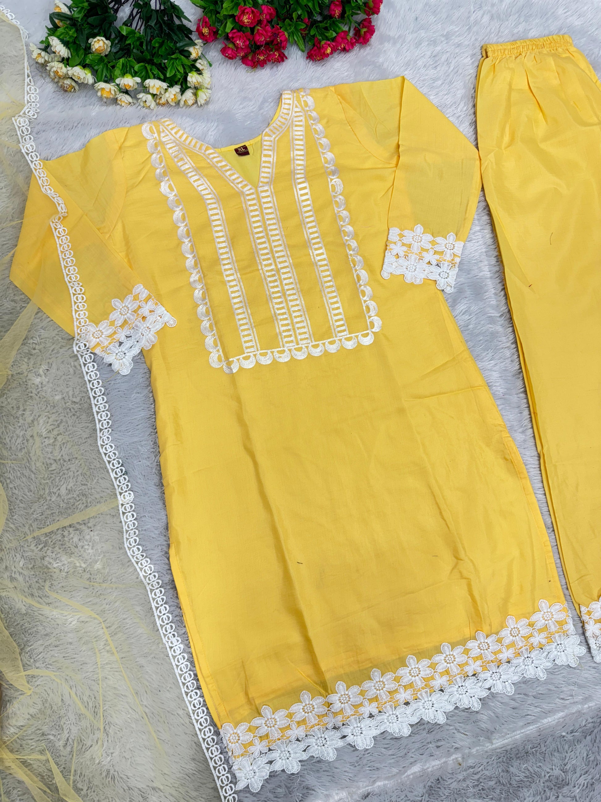 Fantastic Chain Stitch Work Yellow Color Palazzo Suit