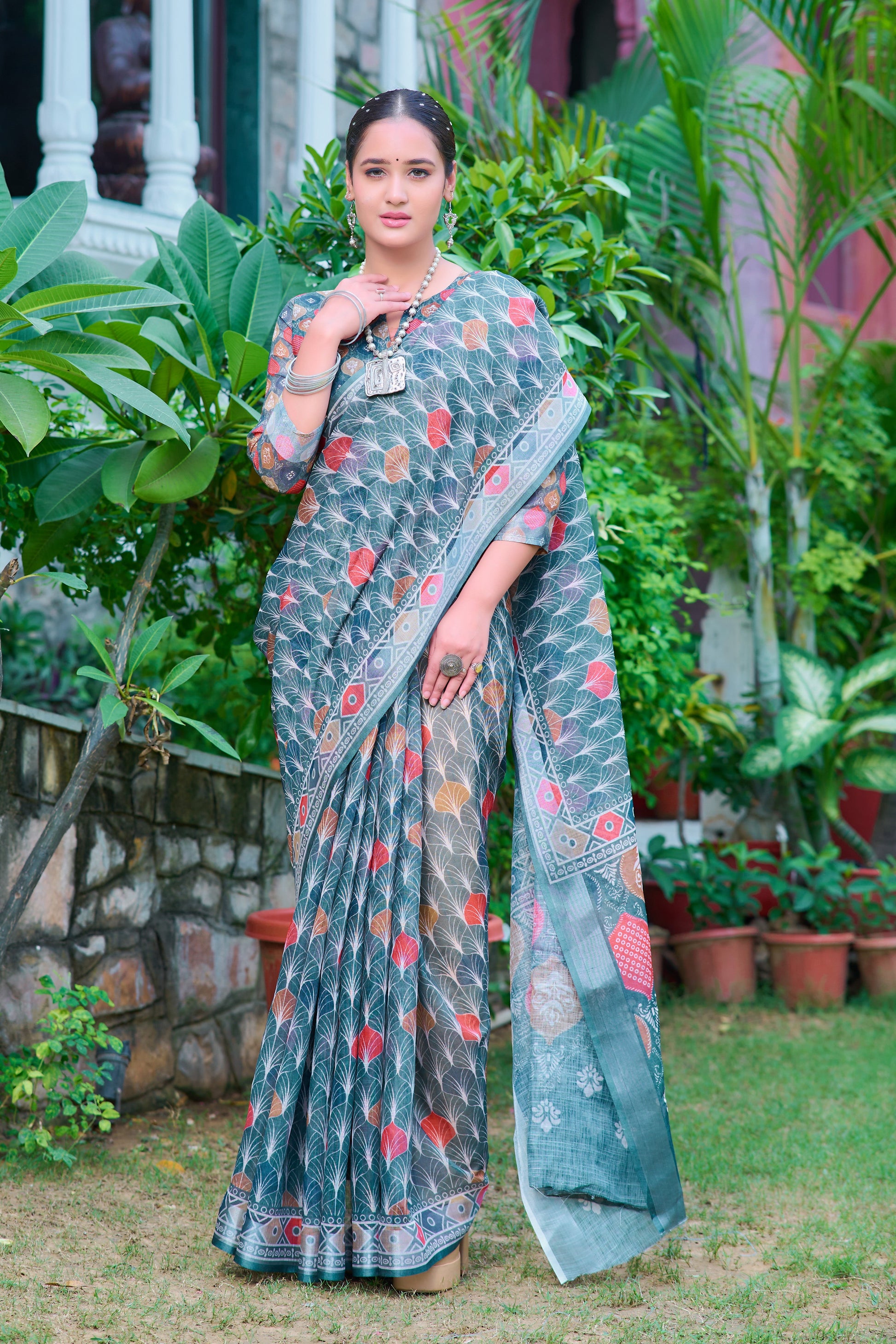 Fashionable Light Green Color Color Pure Cotton Lilen With Digital Printed Designer Saree