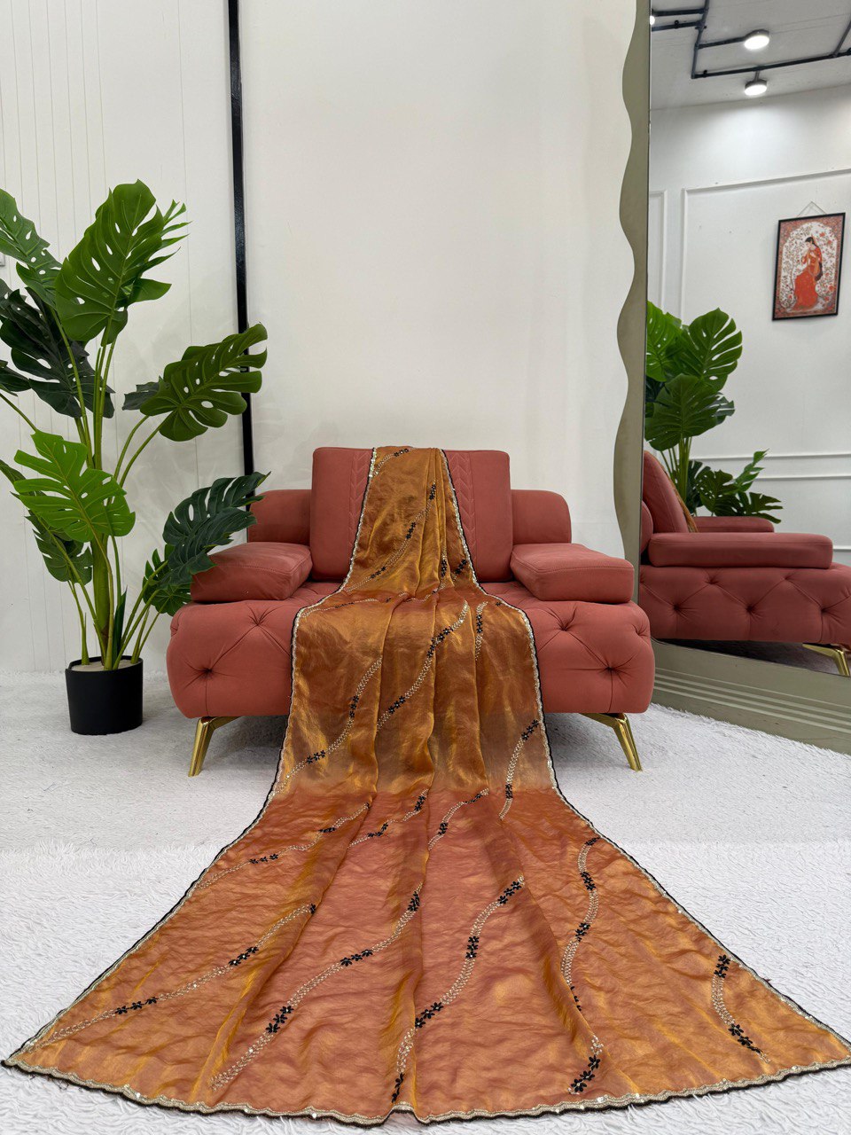 Festive Wear Brown Color Thread And Sequin Embroidery Work Designer Saree