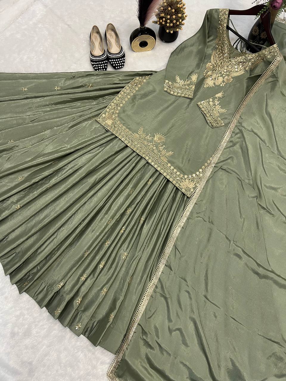 Festive Wear Mehndi Color Chinnon Silk Multi Needle Embroidery Work Lehenga With Top
