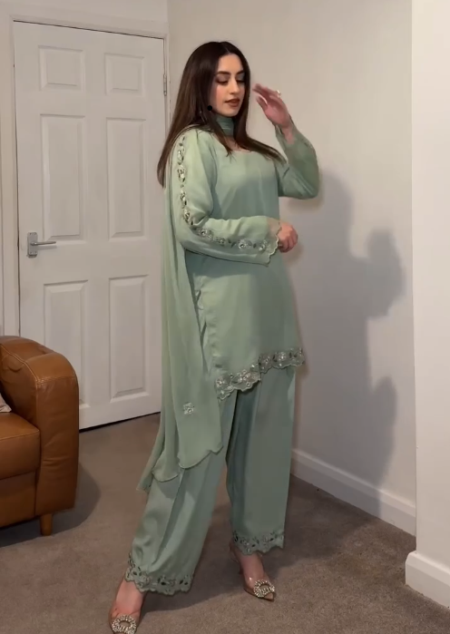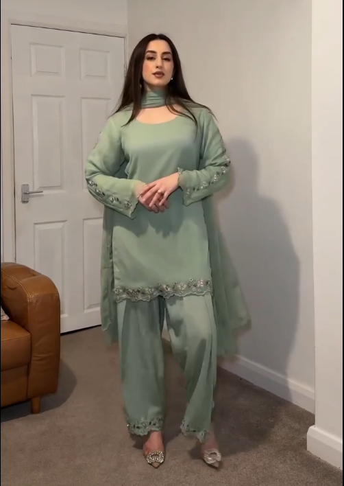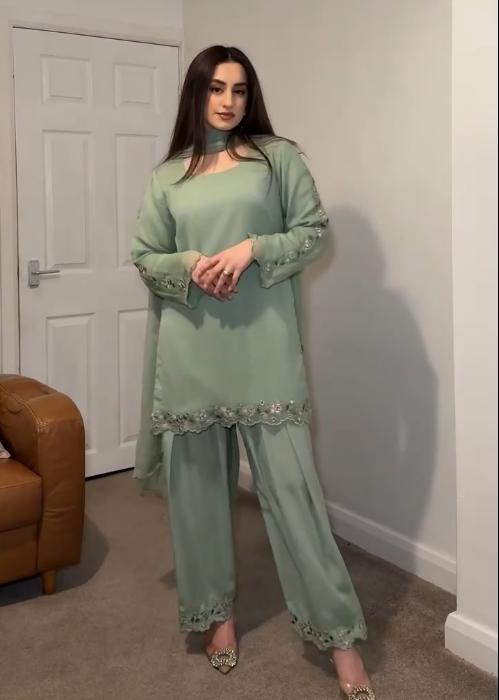 Festive Wear Pista Color Heavy Faux Georgette With Embroidery Work Palazzo Suit
