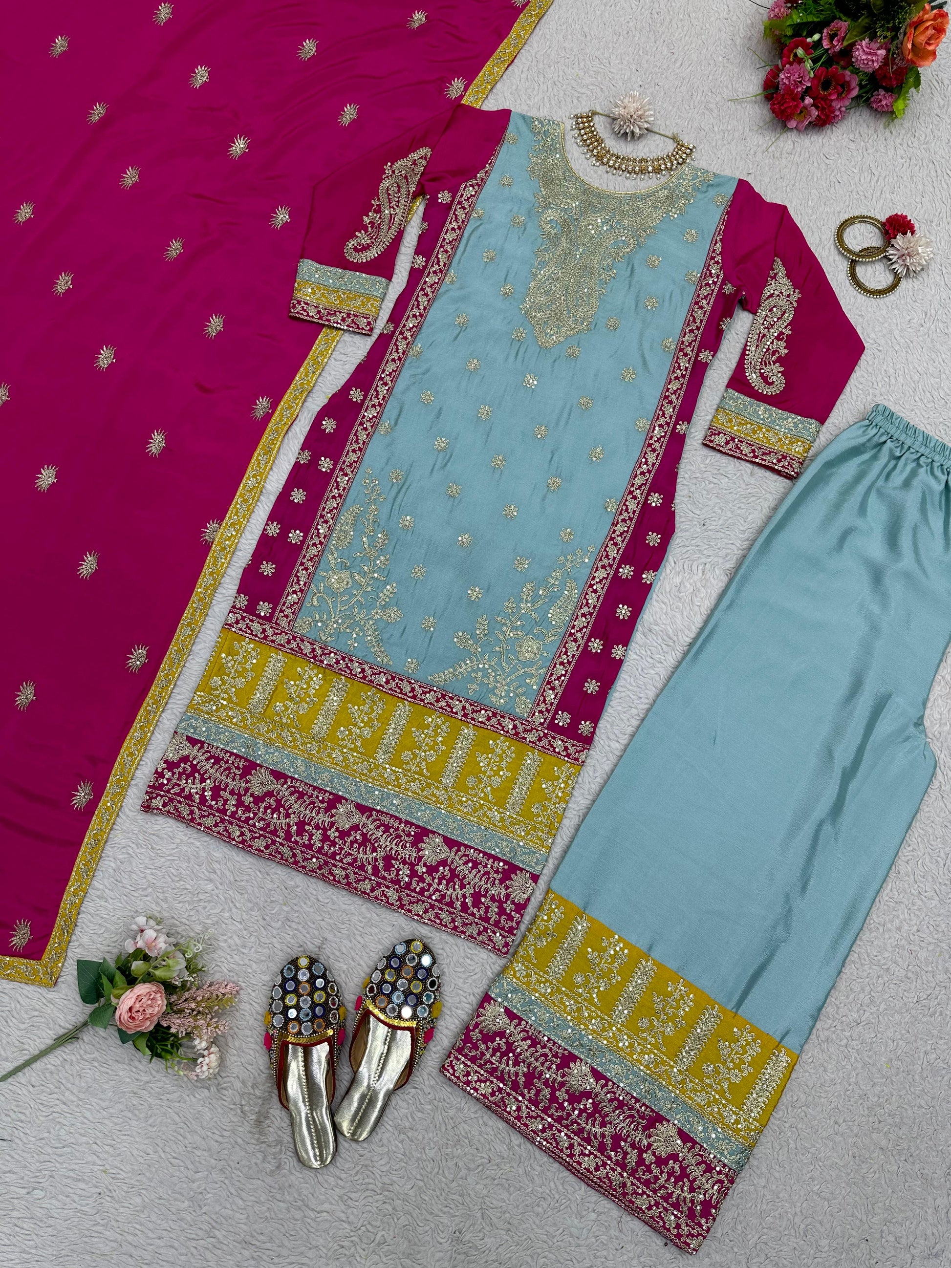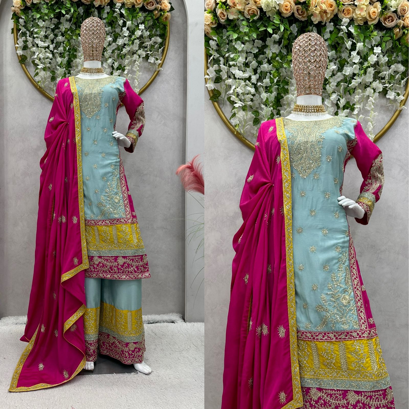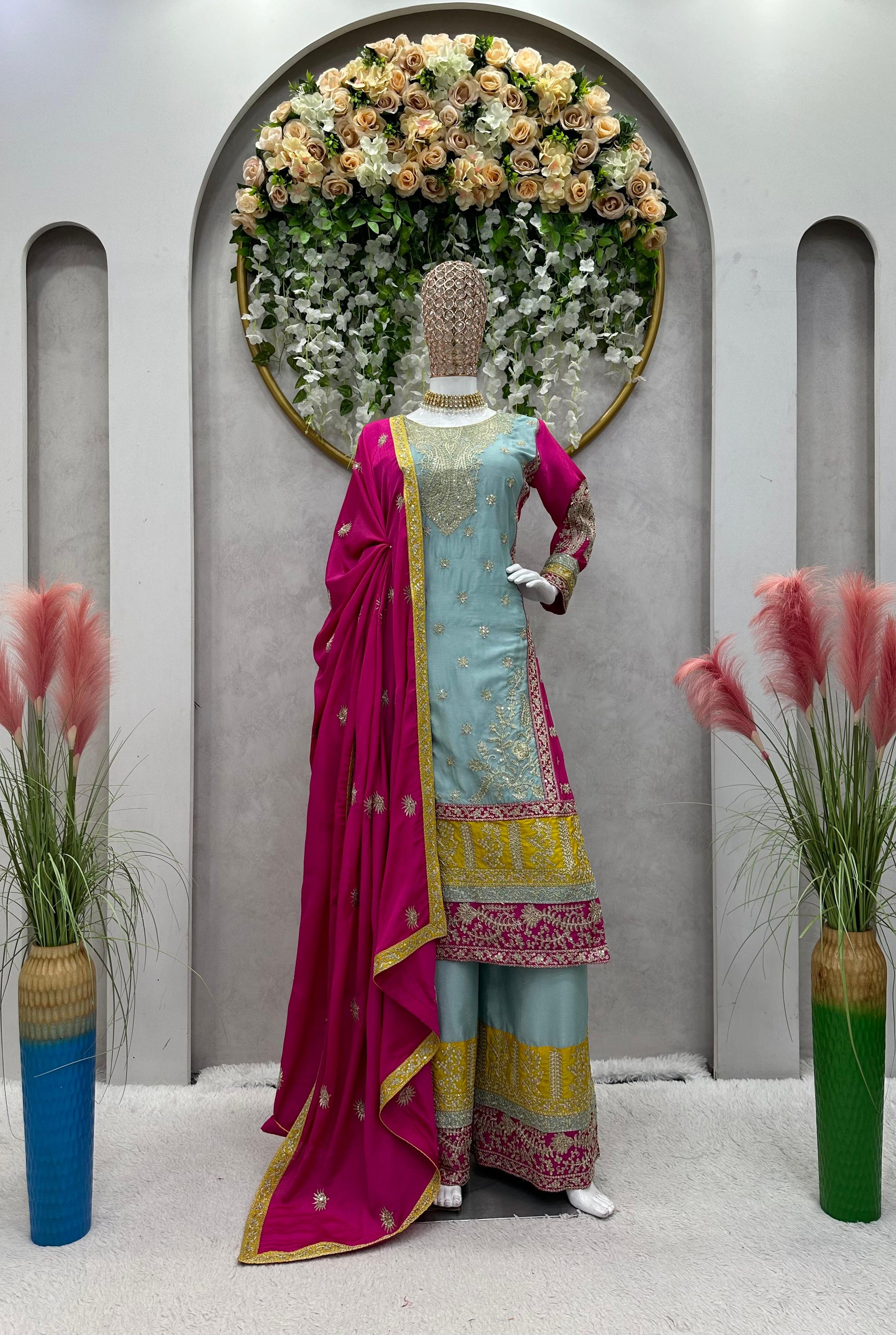 Festive Wear Sky Blue Color Heavy Work Palazzo Suit