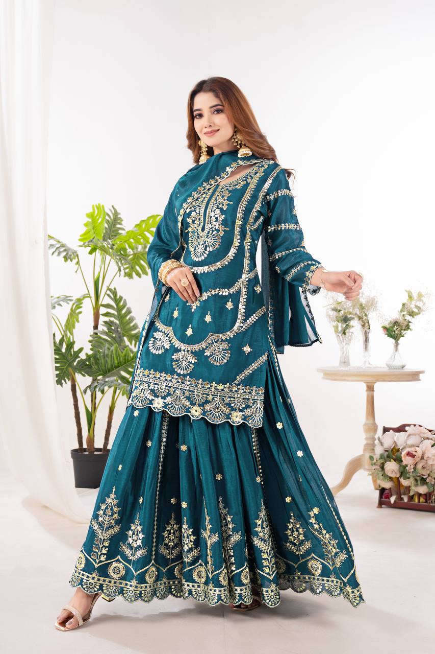 Festive Wear Teal Green Color Embroidery With Coding Sequence Work Palazzo Suit