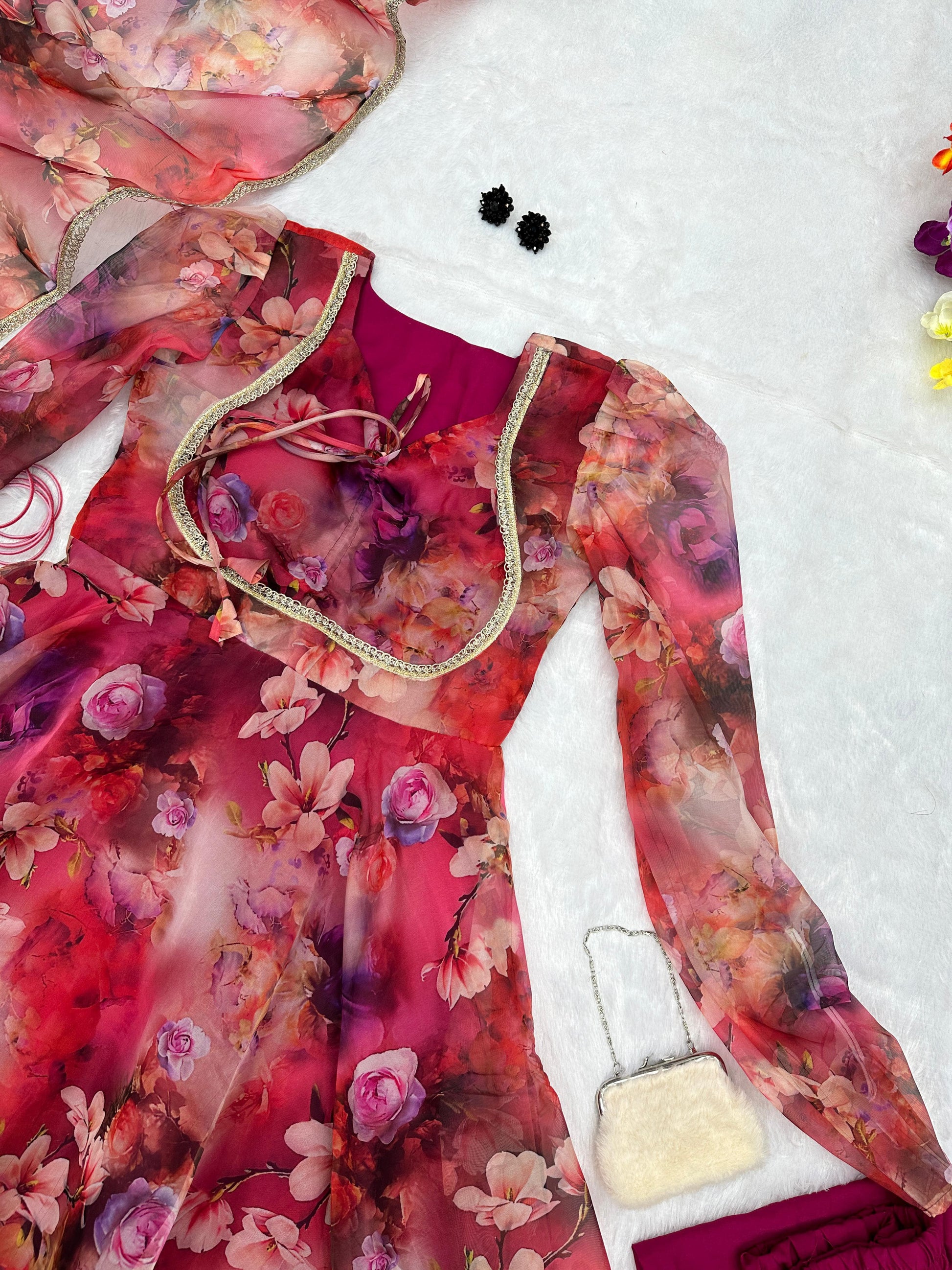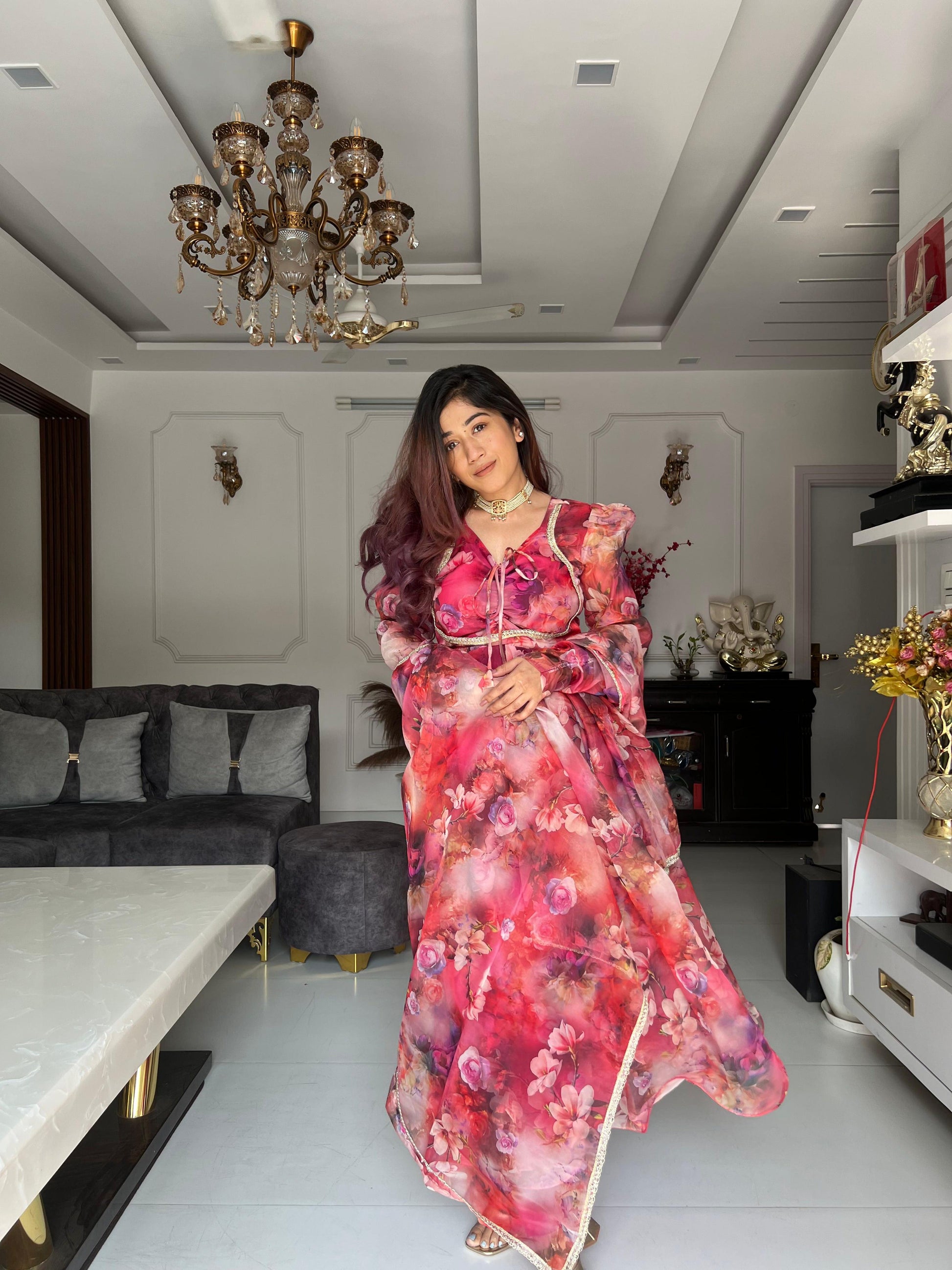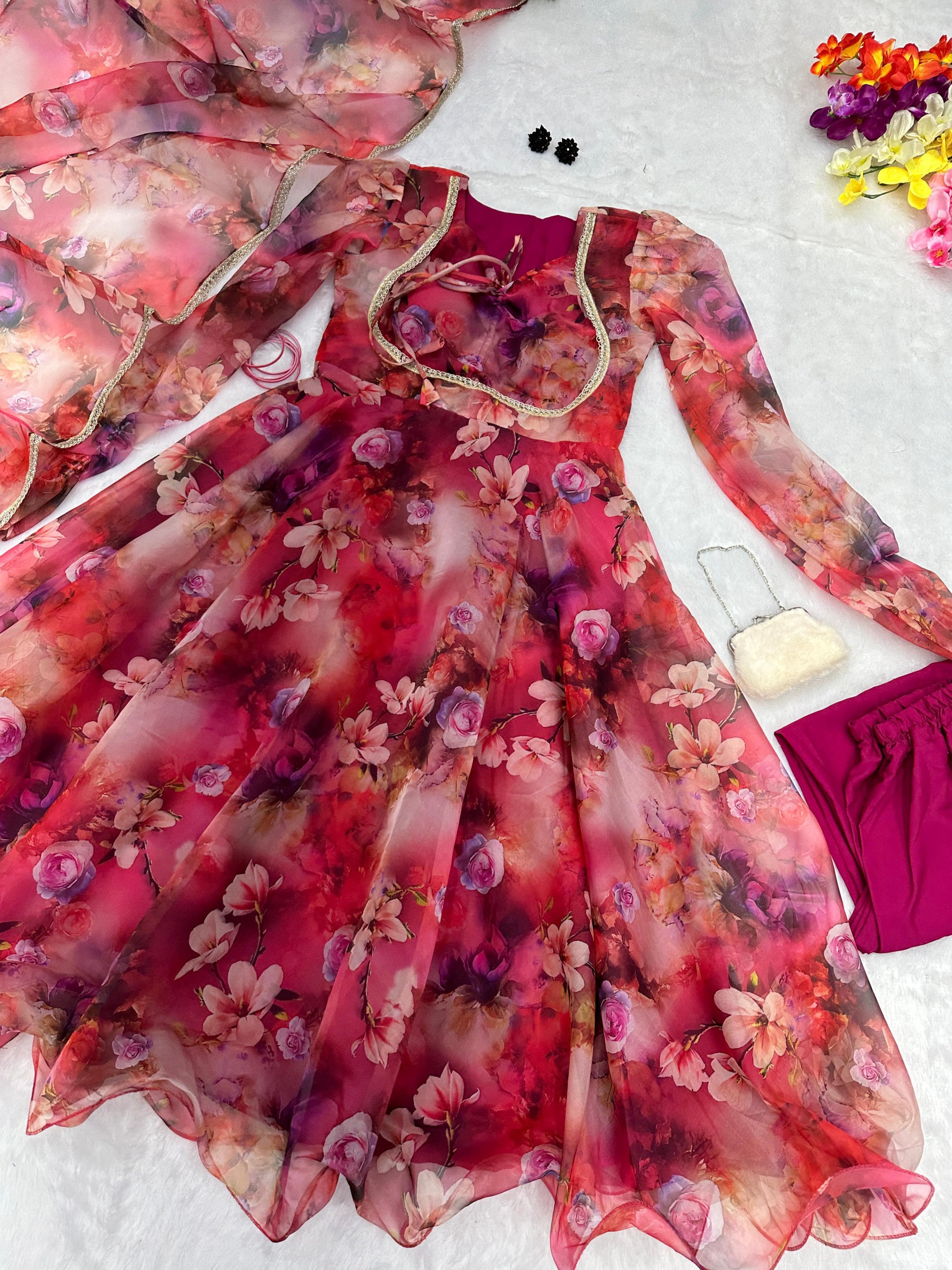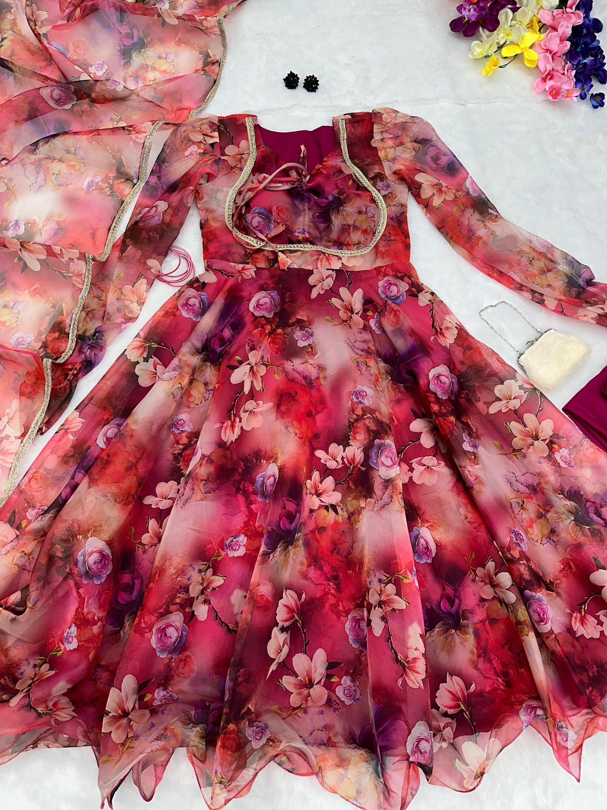 Fabric | Digital Printed Pure Organza Silk Anarkali Suit Of Huge Flair With Lace Border |