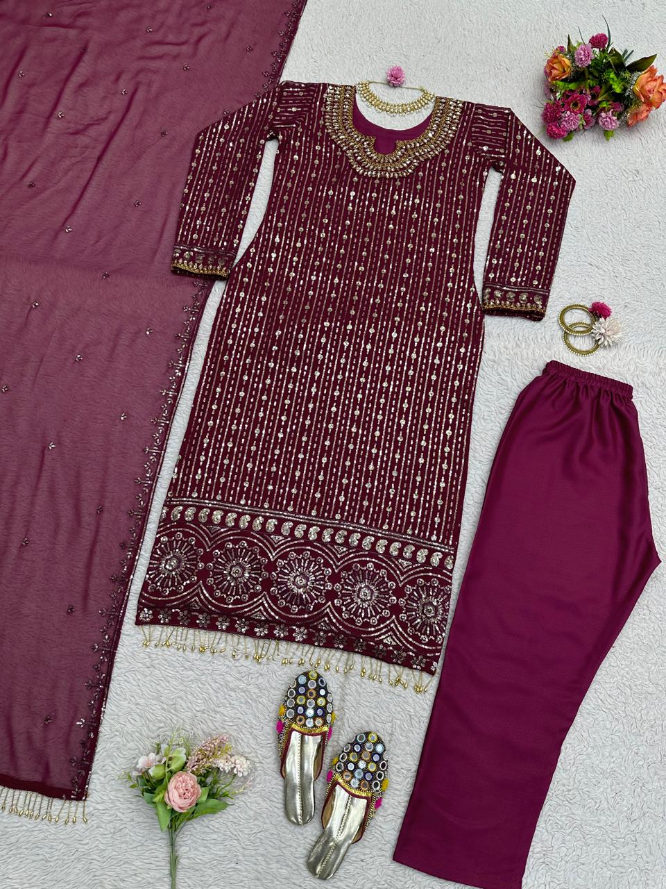Fully Stitched Wine Thread Sequence Work Kurti Set