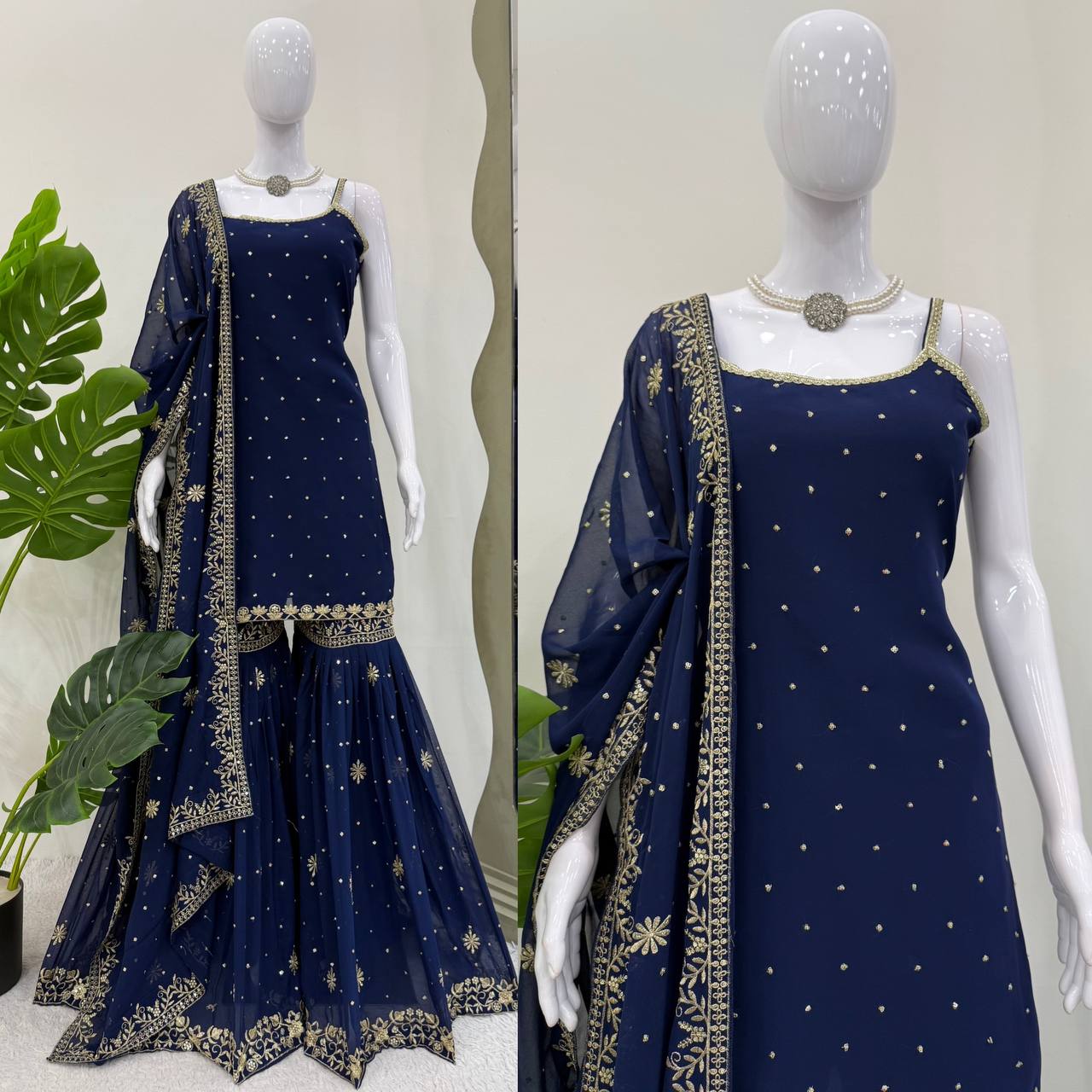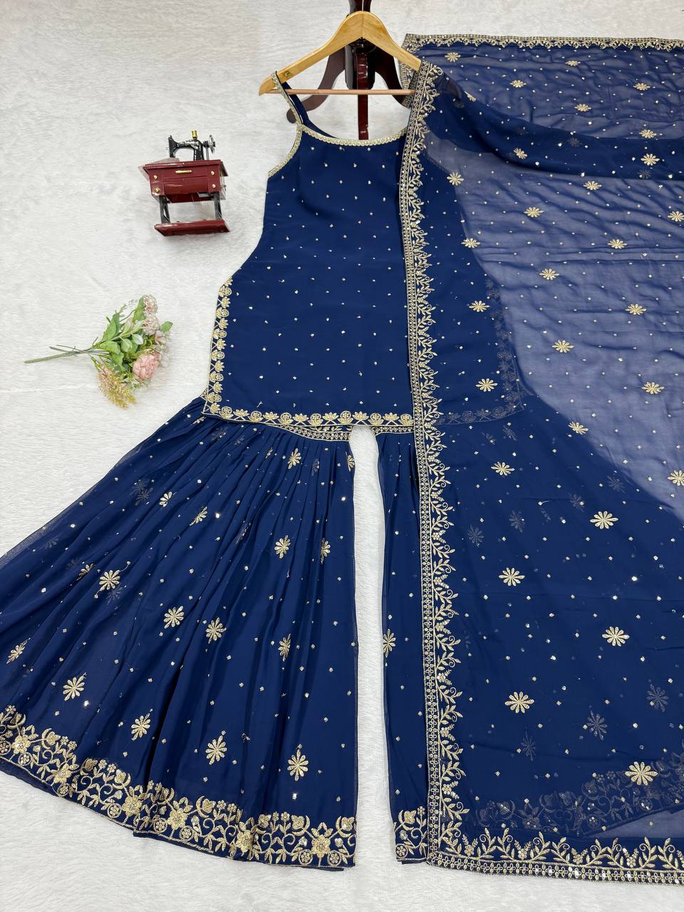 Function Wear Navy Blue Color Thread With Sequin Embroidery Work Sharara Suit